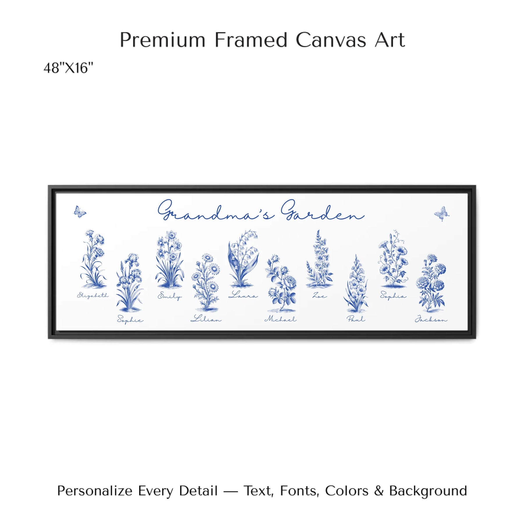 Make this custom wall art uniquely yours. Add a special title like “Grandma’s Garden” or “Mom’s Flower Patch” to honor someone dear.