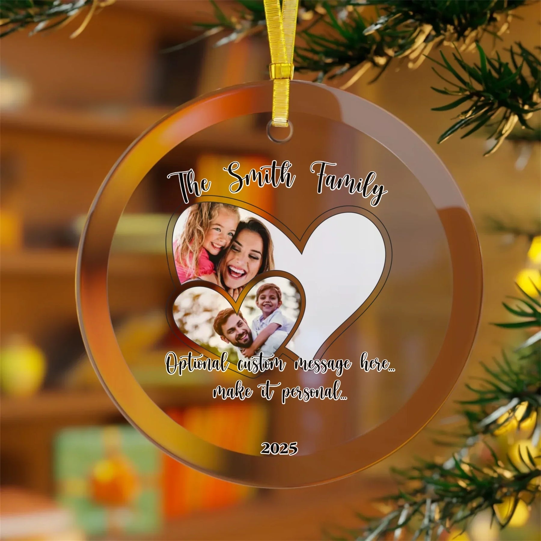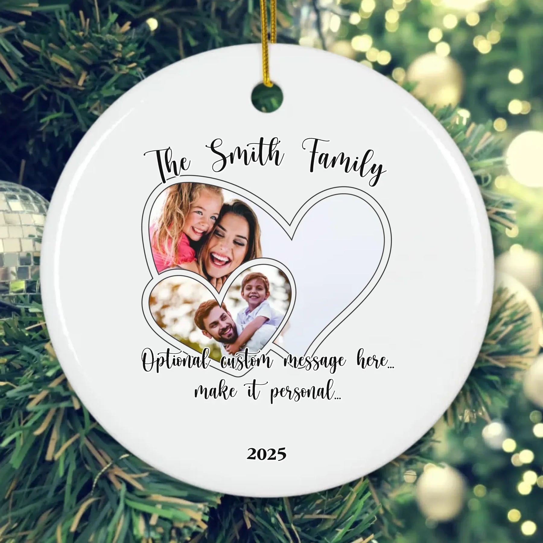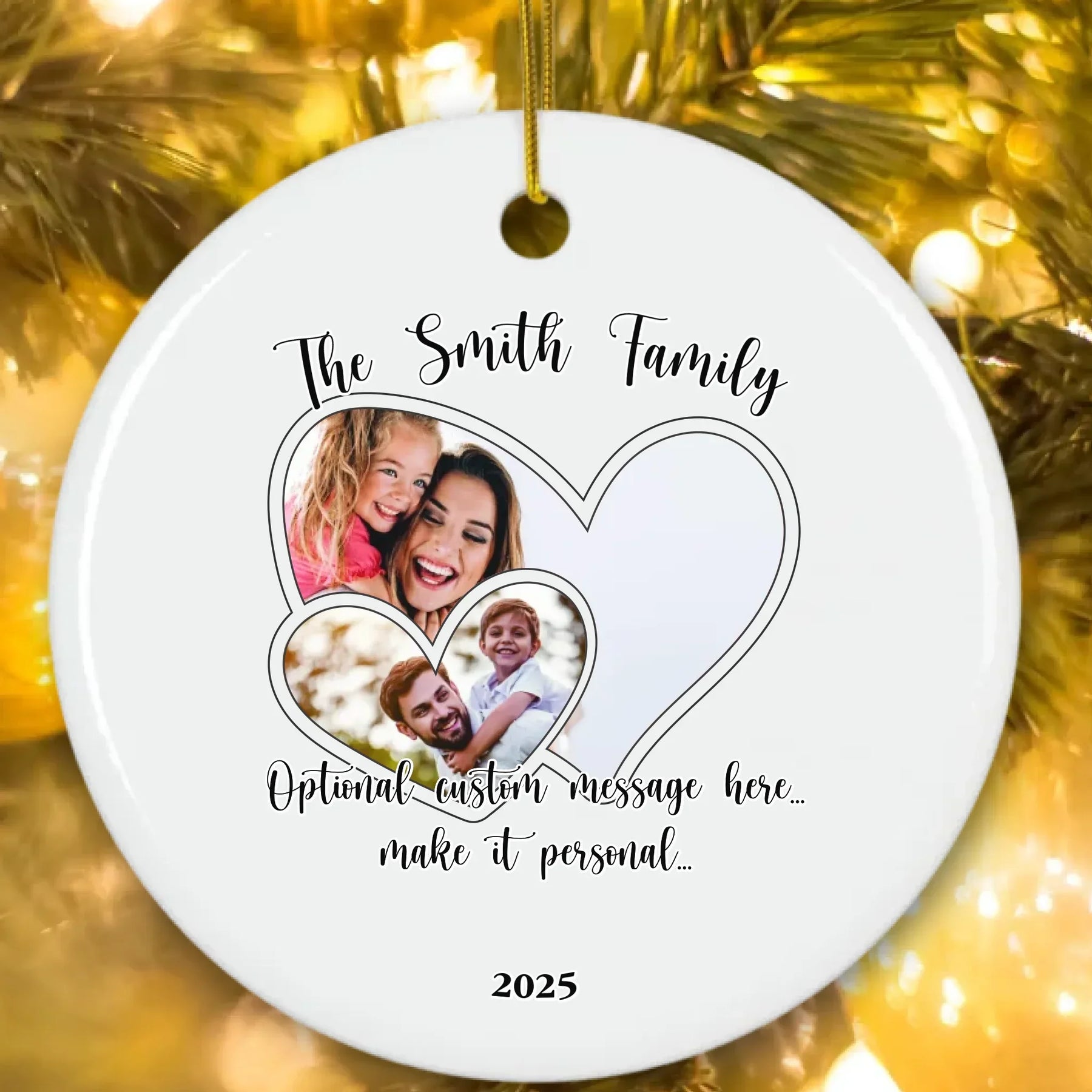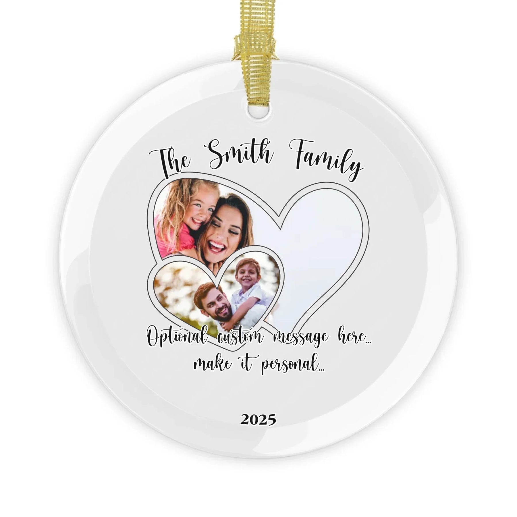 Upload two photos to create your own custom design. Add a title, personal message, and footer with any year or phrase. Every ornament is made to reflect your unique story—whether it’s “The Johnson Family,” “Forever in Our Hearts,” or a meaningful date.