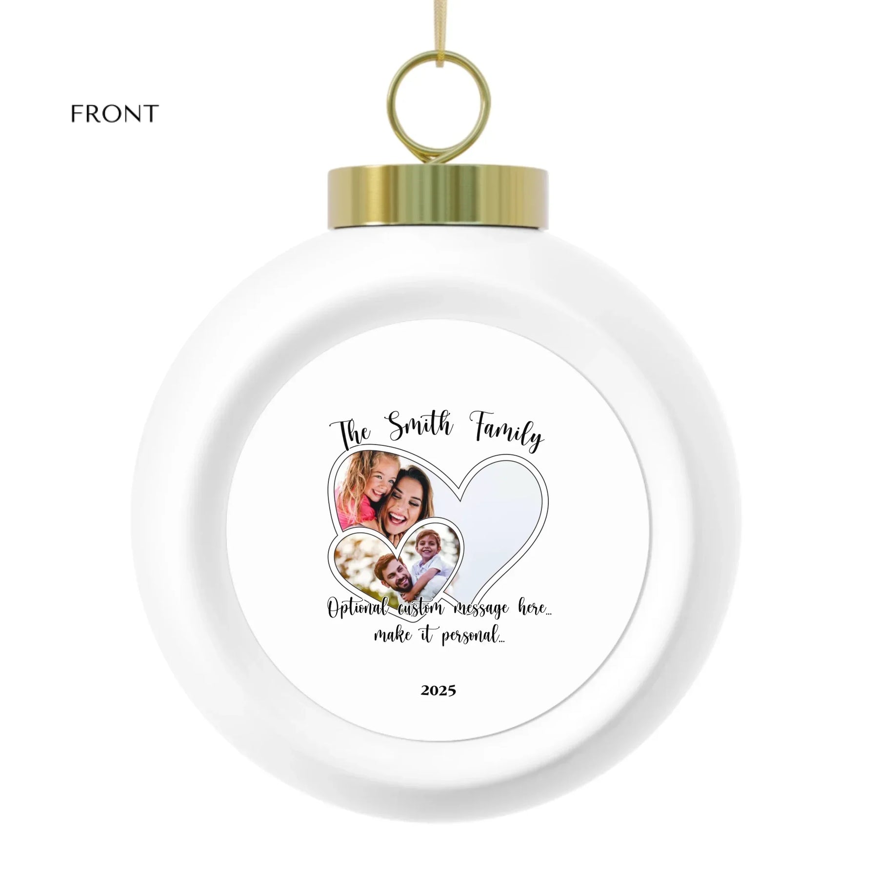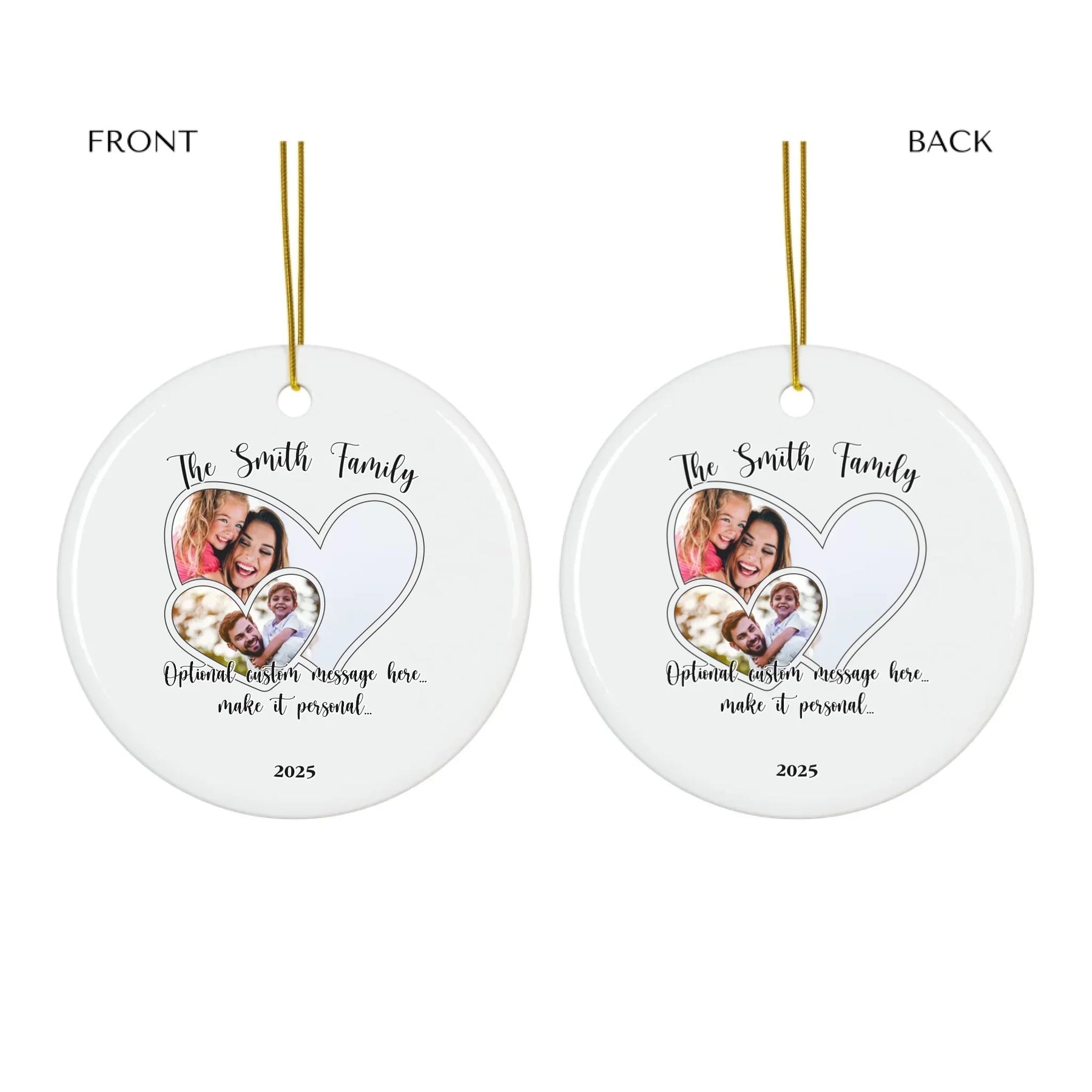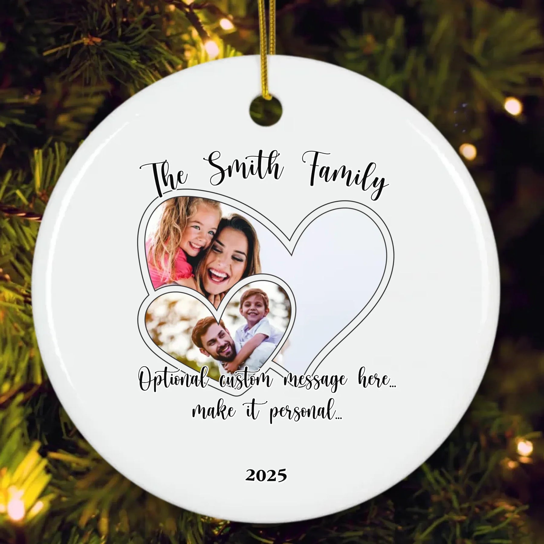 Upload two photos to create your own custom design. Add a title, personal message, and footer with any year or phrase. Every ornament is made to reflect your unique story—whether it’s “The Johnson Family,” “Forever in Our Hearts,” or a meaningful date.