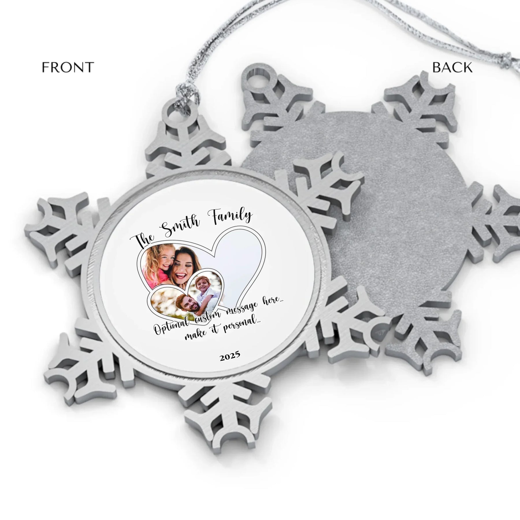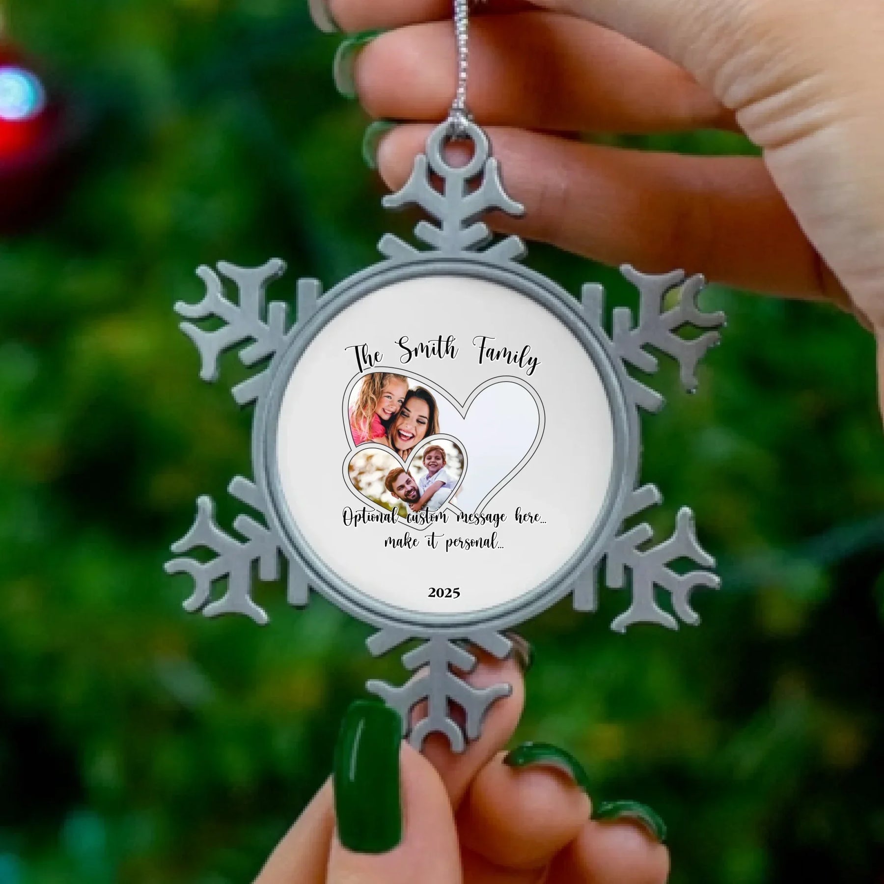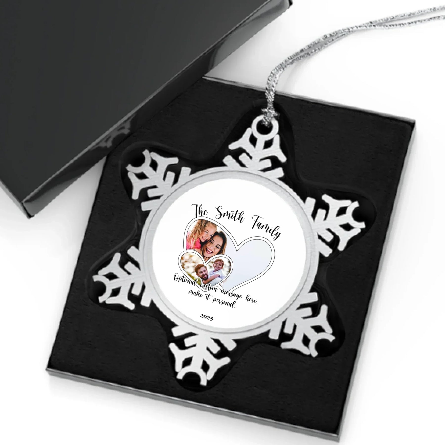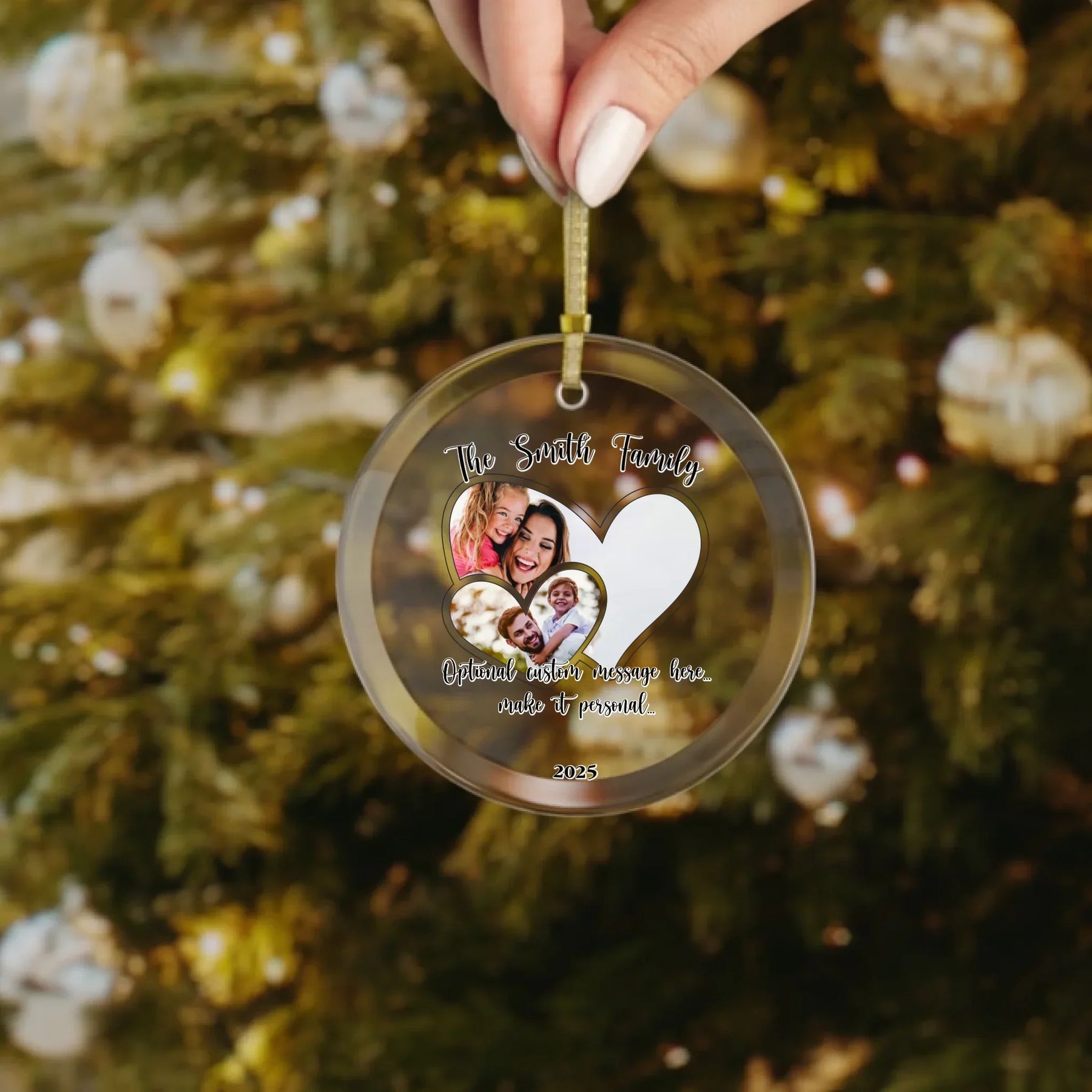 Upload two photos to create your own custom design. Add a title, personal message, and footer with any year or phrase. Every ornament is made to reflect your unique story—whether it’s “The Johnson Family,” “Forever in Our Hearts,” or a meaningful date.