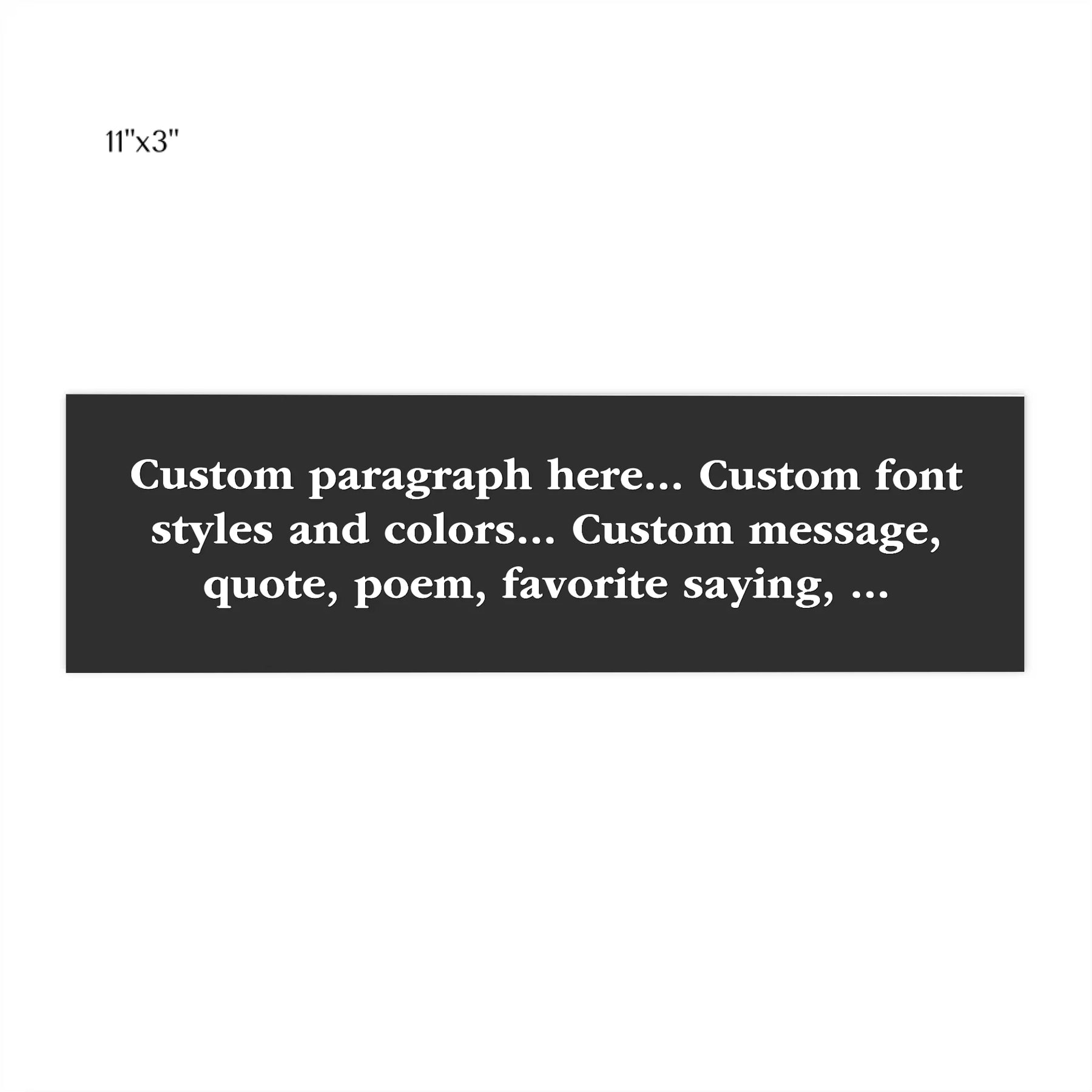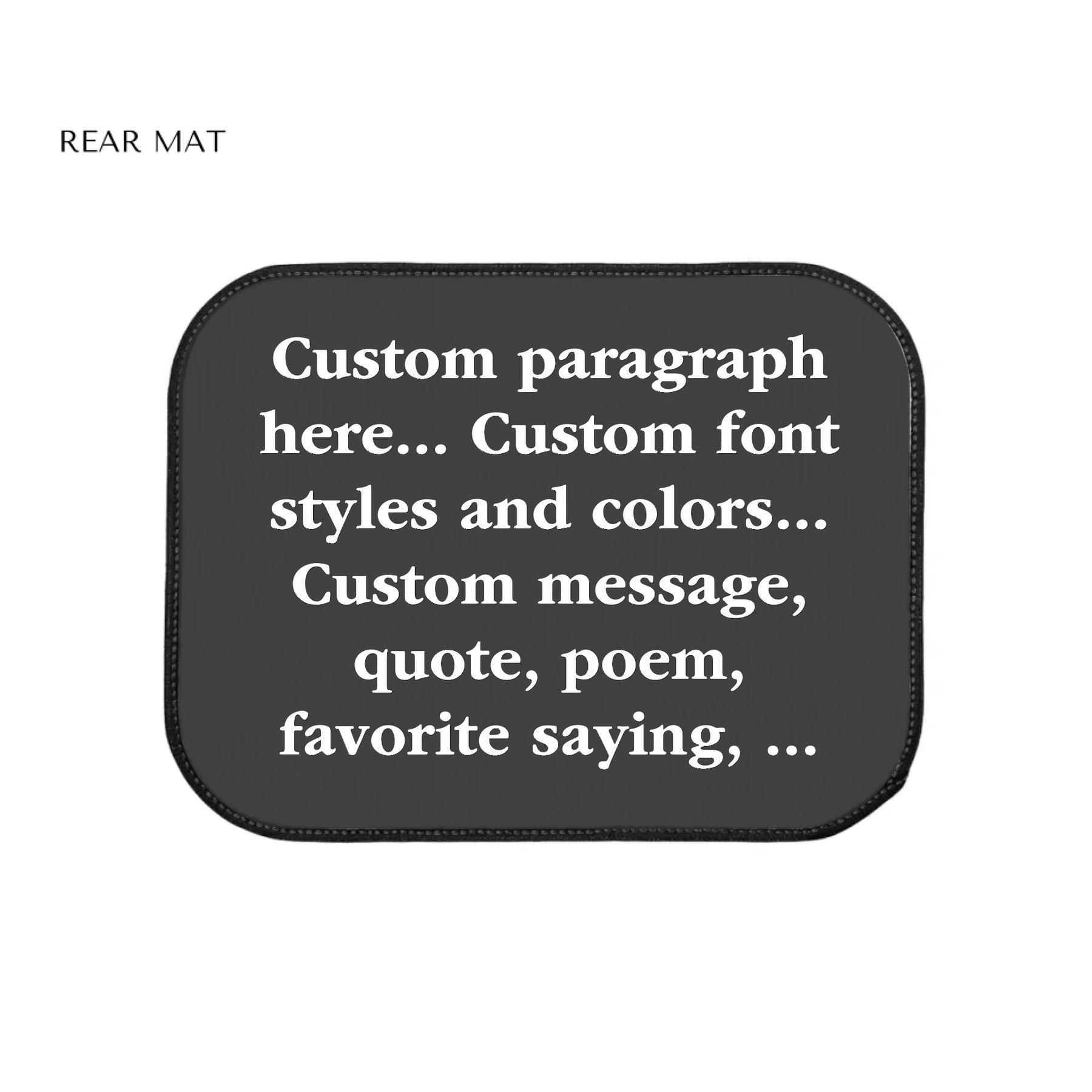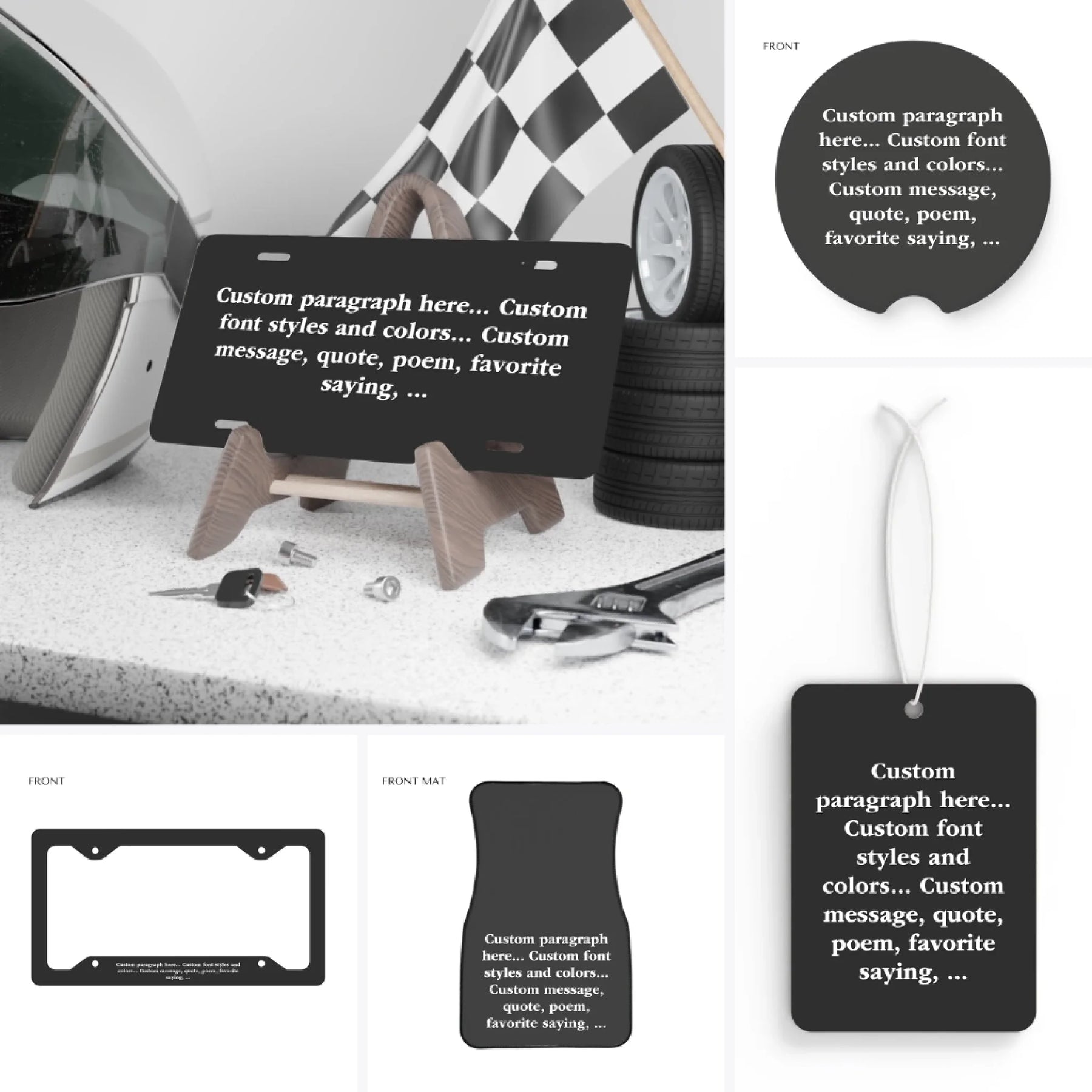 Transform your car with our Custom Paragraph Car Accessories collection. Whether you want to add a personal touch or give a thoughtful gift, our accessories let you express your unique style. From personalized license plates to bumper stickers, car floor mats, and air fresheners, each item can be customized with a paragraph of text. Choose a favorite quote, family name, motivational message, or initials to make your car truly yours.