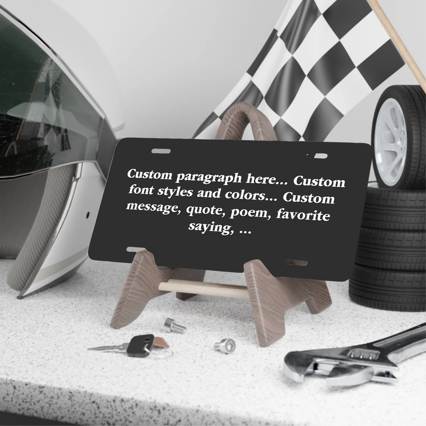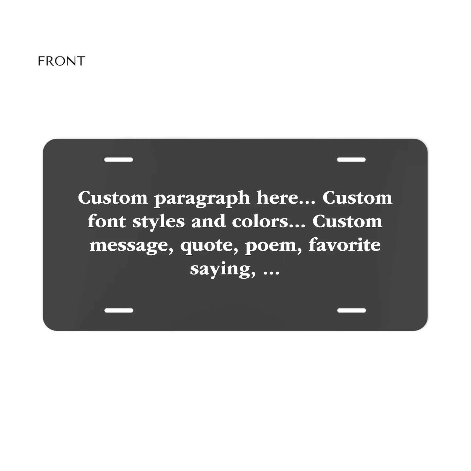 Personalize your vehicle with a custom license plate or frame. Made from durable materials, these accessories add style to your car’s exterior. Choose a custom paragraph of text, a font, and a background color to create a one-of-a-kind plate or frame. Whether you want to celebrate a milestone or show off a personal message, our license plates and frames are perfect for expressing yourself.