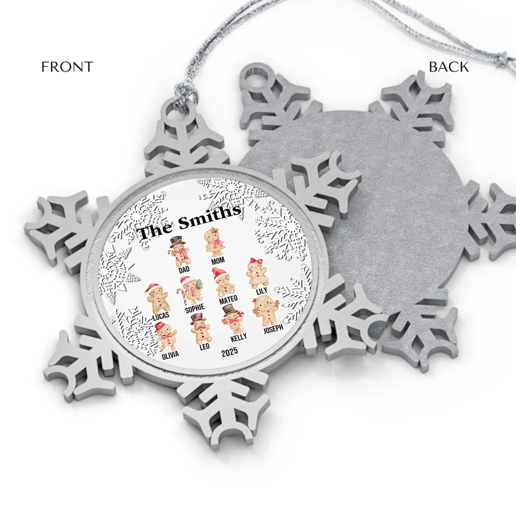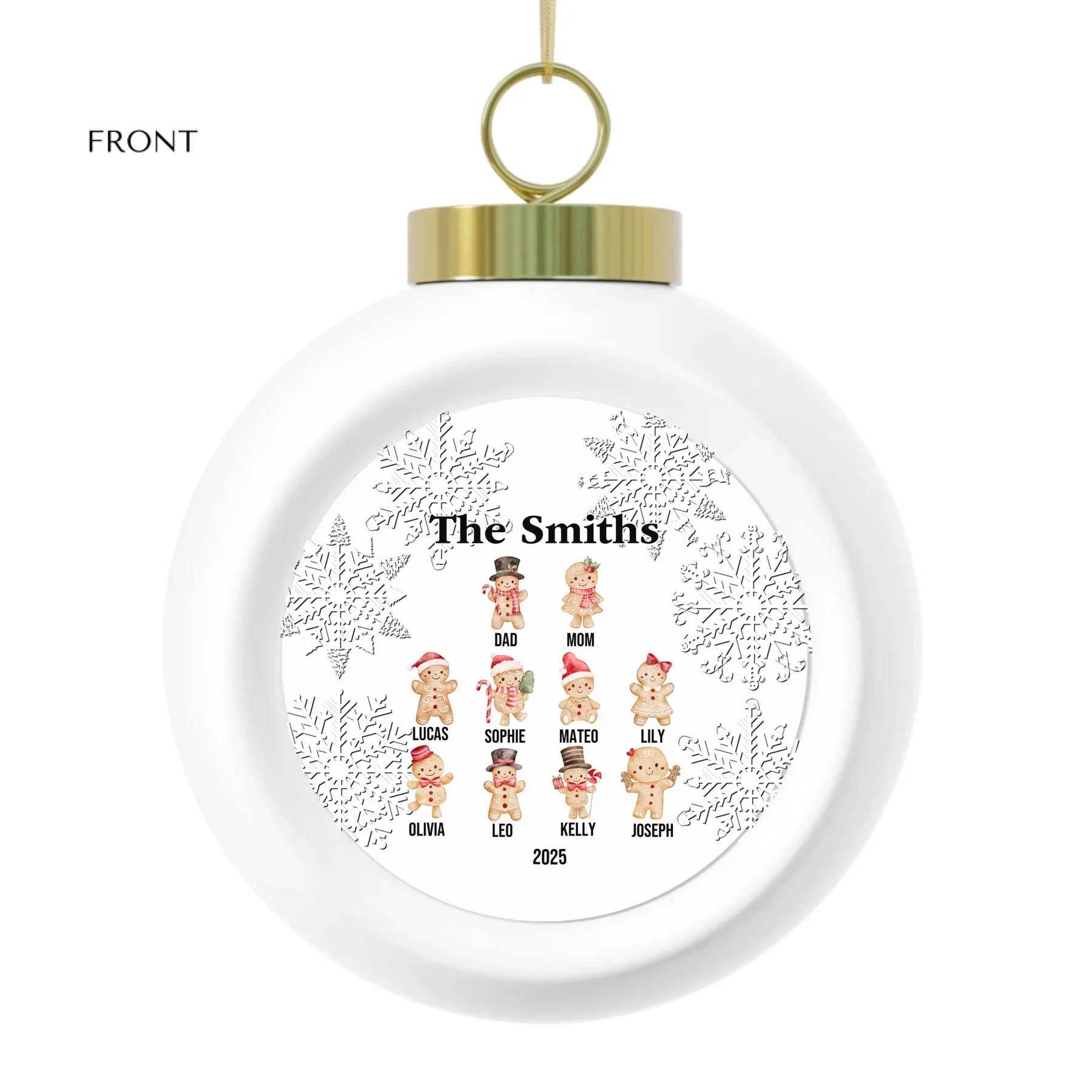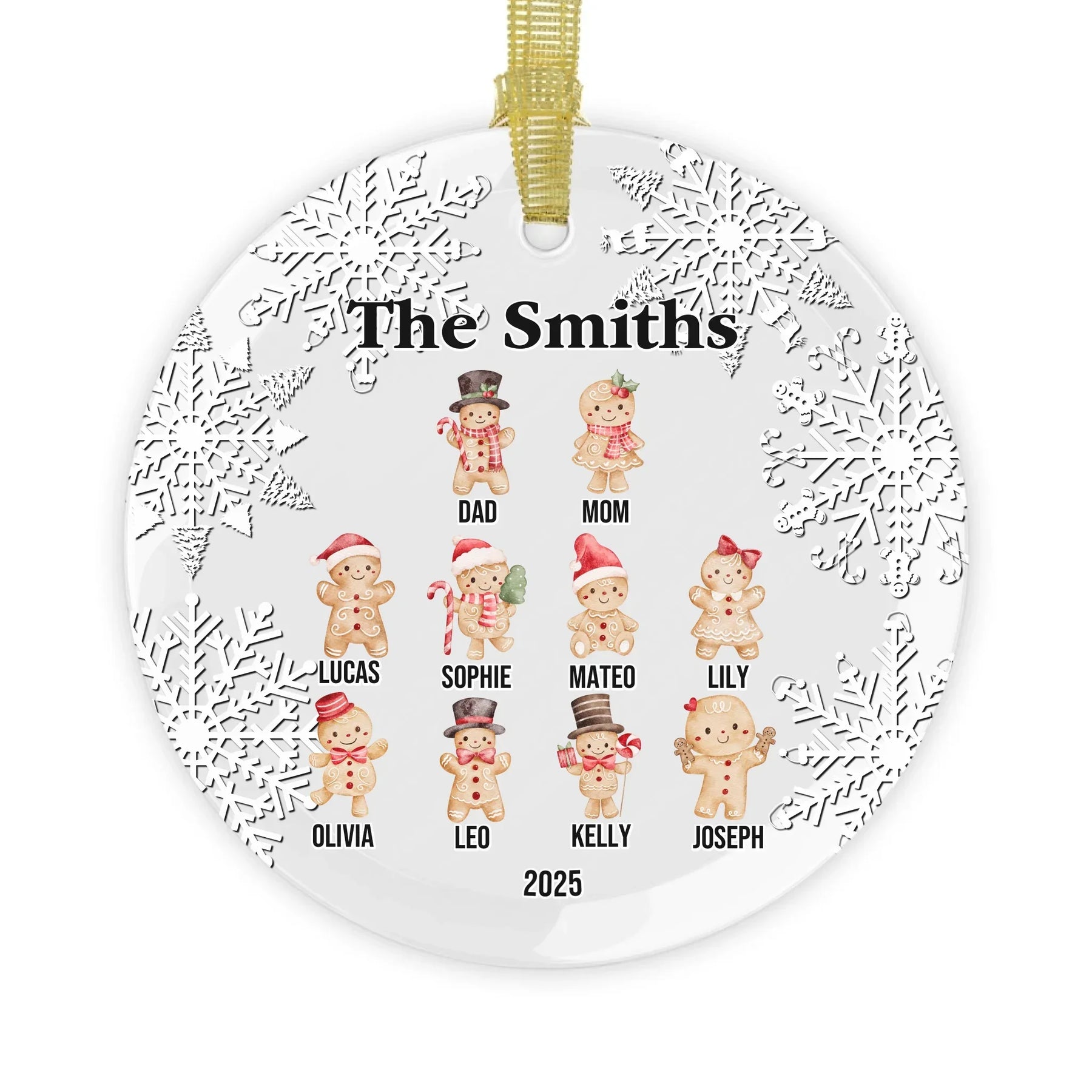Each custom gingerbread ornament is designed to capture the joy of togetherness and the sweetness of the season. Available in glass, ceramic, Christmas ball, and pewter snowflake finishes, every material offers a unique look and texture. The intricate snowflake border adds elegance, while the smiling gingerbread family creates a cozy, joyful touch.