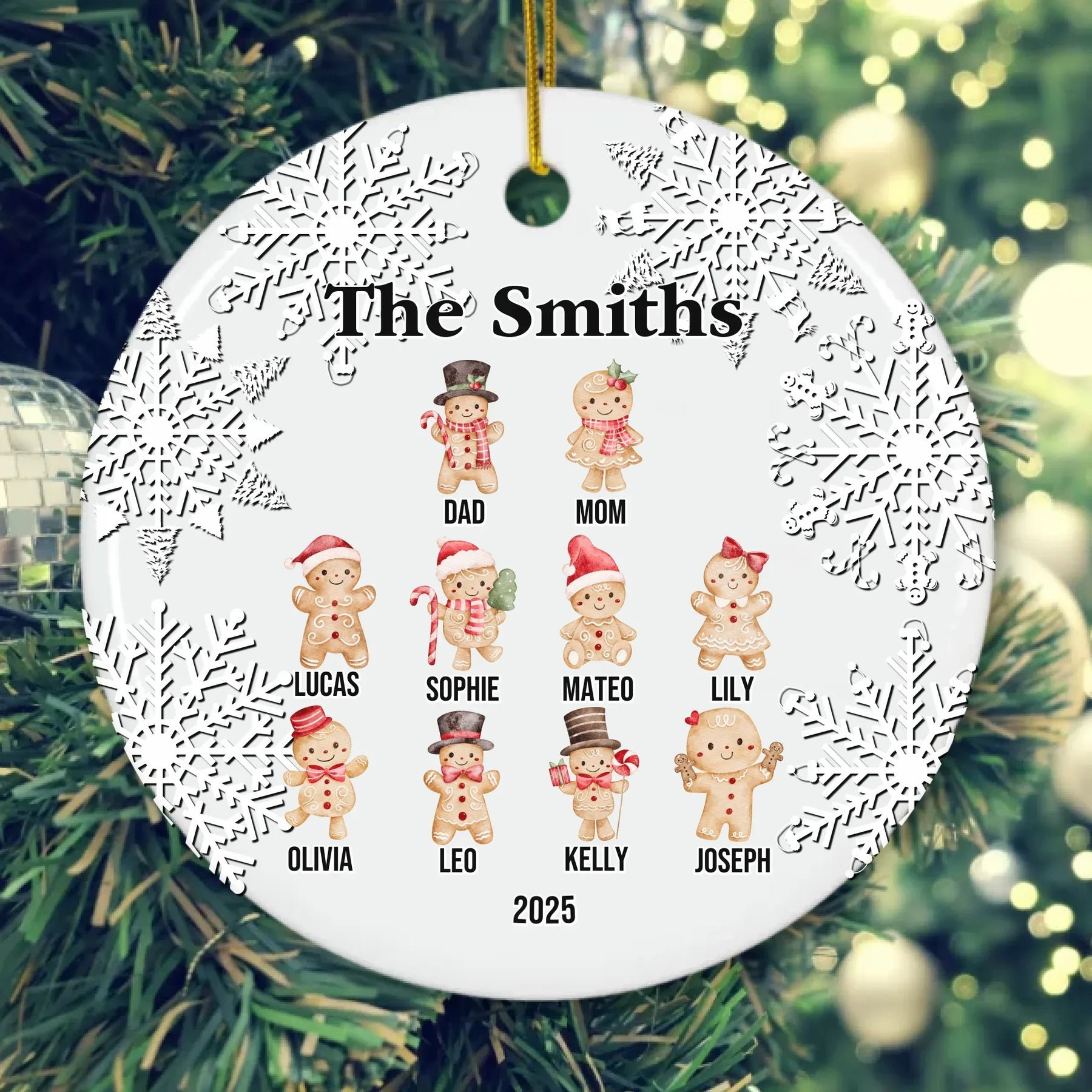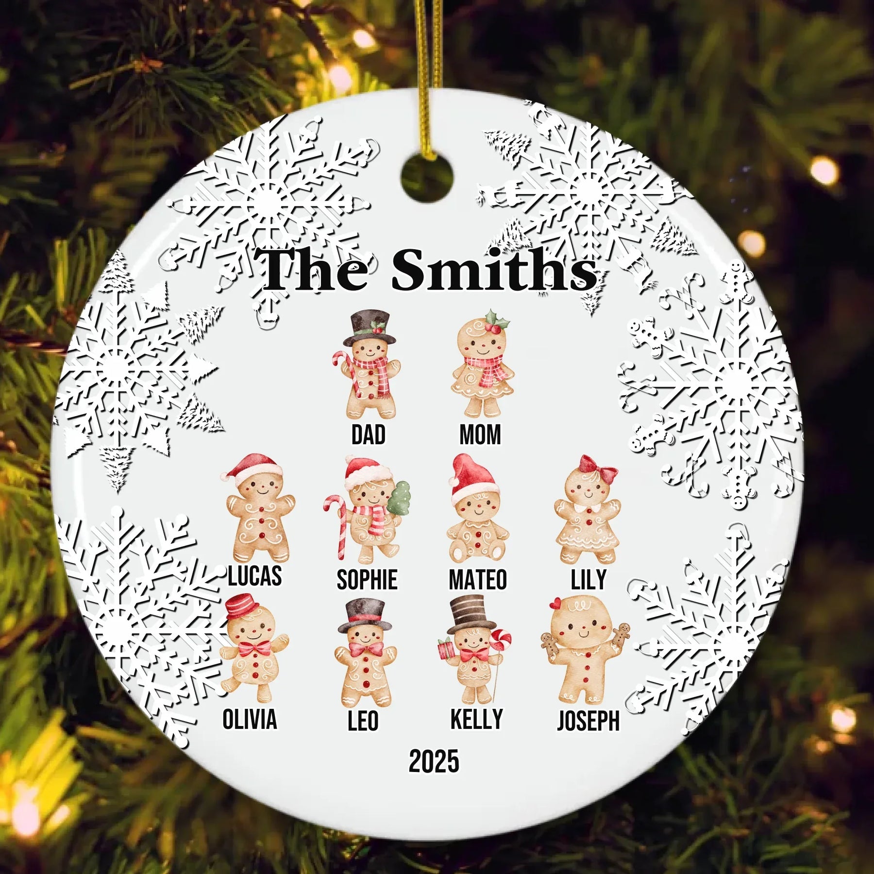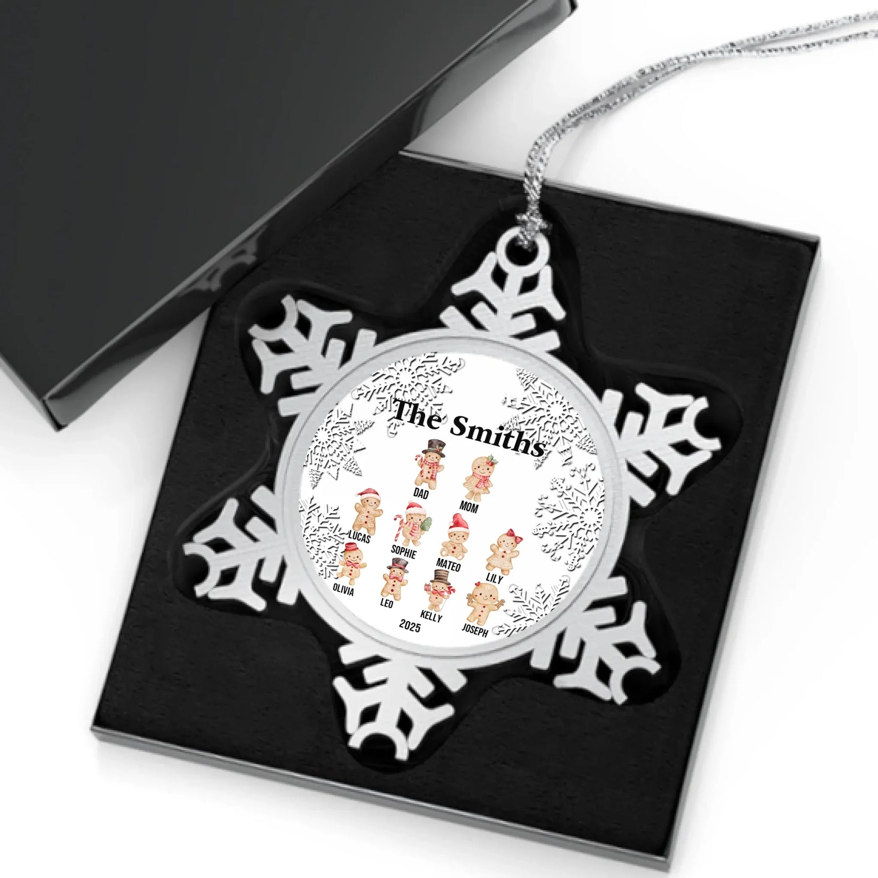 Each custom gingerbread ornament is designed to capture the joy of togetherness and the sweetness of the season. Available in glass, ceramic, Christmas ball, and pewter snowflake finishes, every material offers a unique look and texture. The intricate snowflake border adds elegance, while the smiling gingerbread family creates a cozy, joyful touch.