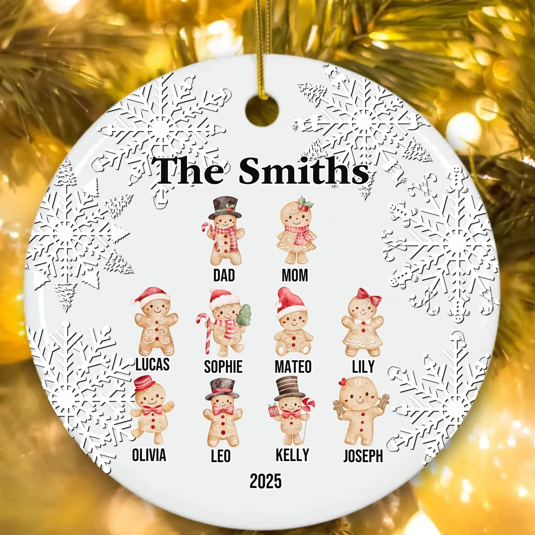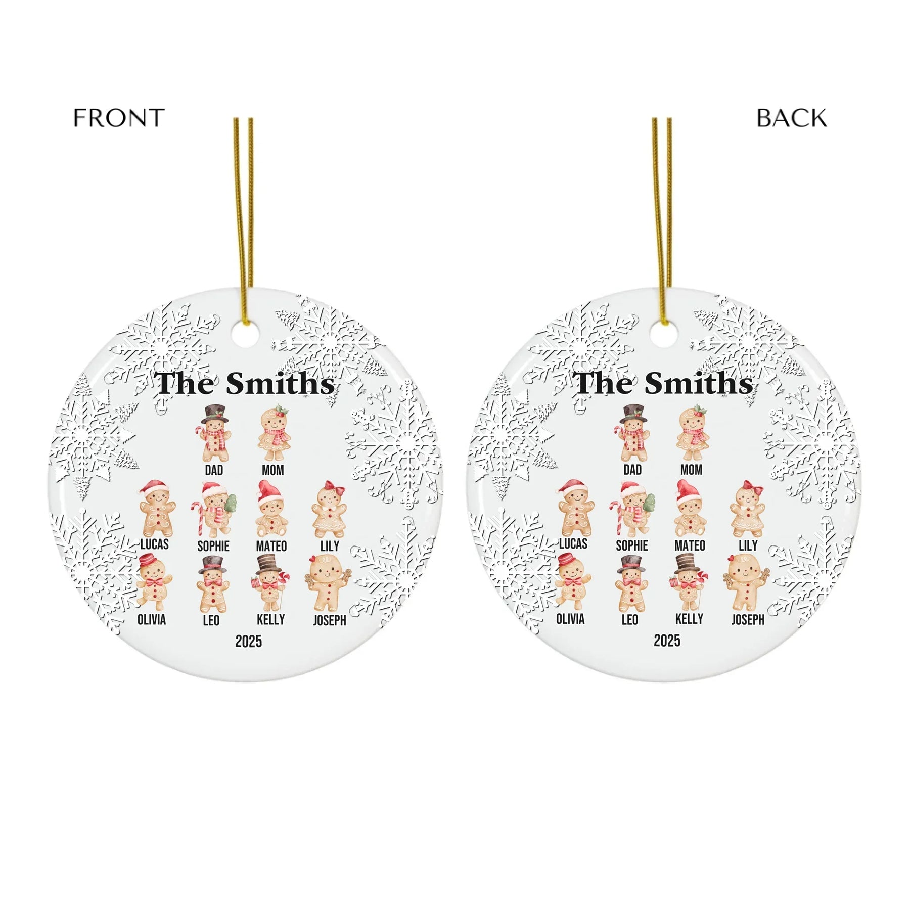 Add warmth and cheer to your holidays with our Custom Gingerbread Ornament, a delightful way to celebrate family and tradition. Each ornament is lovingly crafted to reflect your family’s unique spirit through charming gingerbread characters. Choose from 1–10 figures, each with festive poses and adorable outfits. Personalize every detail with names, a custom title like “The Smiths”, and a footer with any year or message.