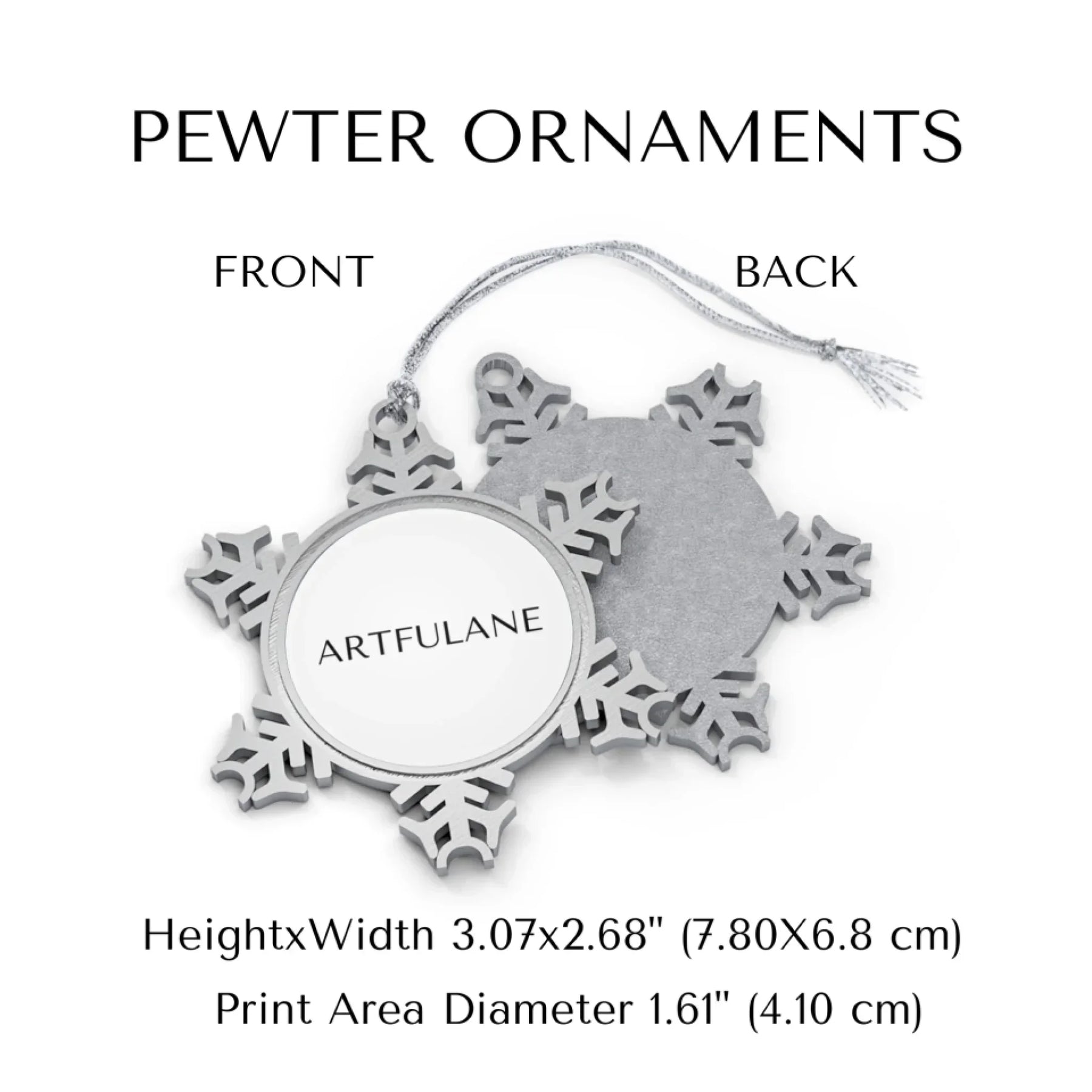 Celebrate the season with ARTFULANE’s Custom Pewter Snowflake Ornament, crafted from high-quality pewter for a durable and sophisticated touch to any decor. With its unique snowflake design and smooth, silver-toned finish, this ornament is perfect for adding a personalized statement to your holiday decorations, award displays, or special gifts. Made with eco-conscious single-piece construction, it combines durability with elegance, showcasing your custom text, message, or design with vibrant color reproduction. The ornament includes a matching silver-toned hanging string, ready to bring elegance to your seasonal decor.