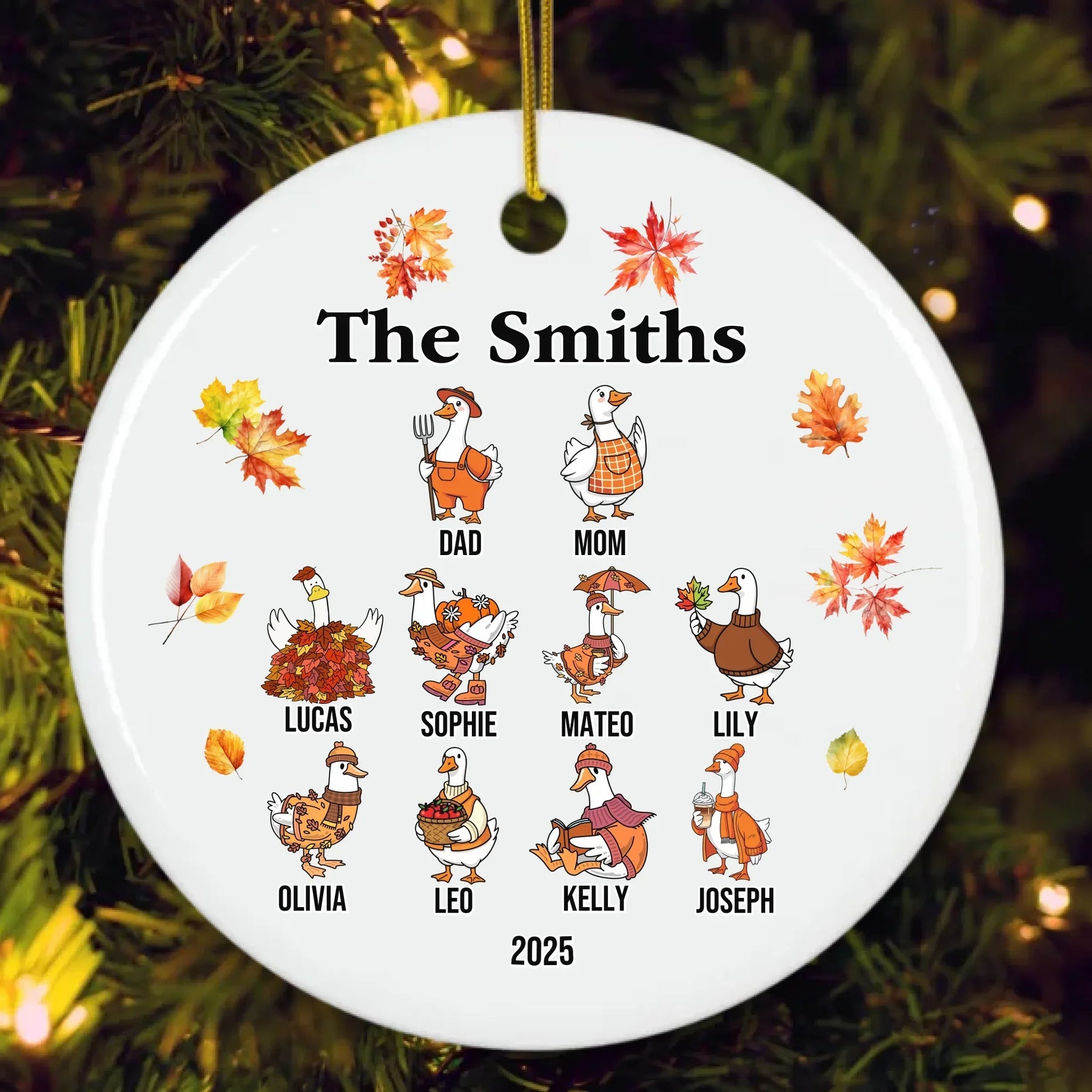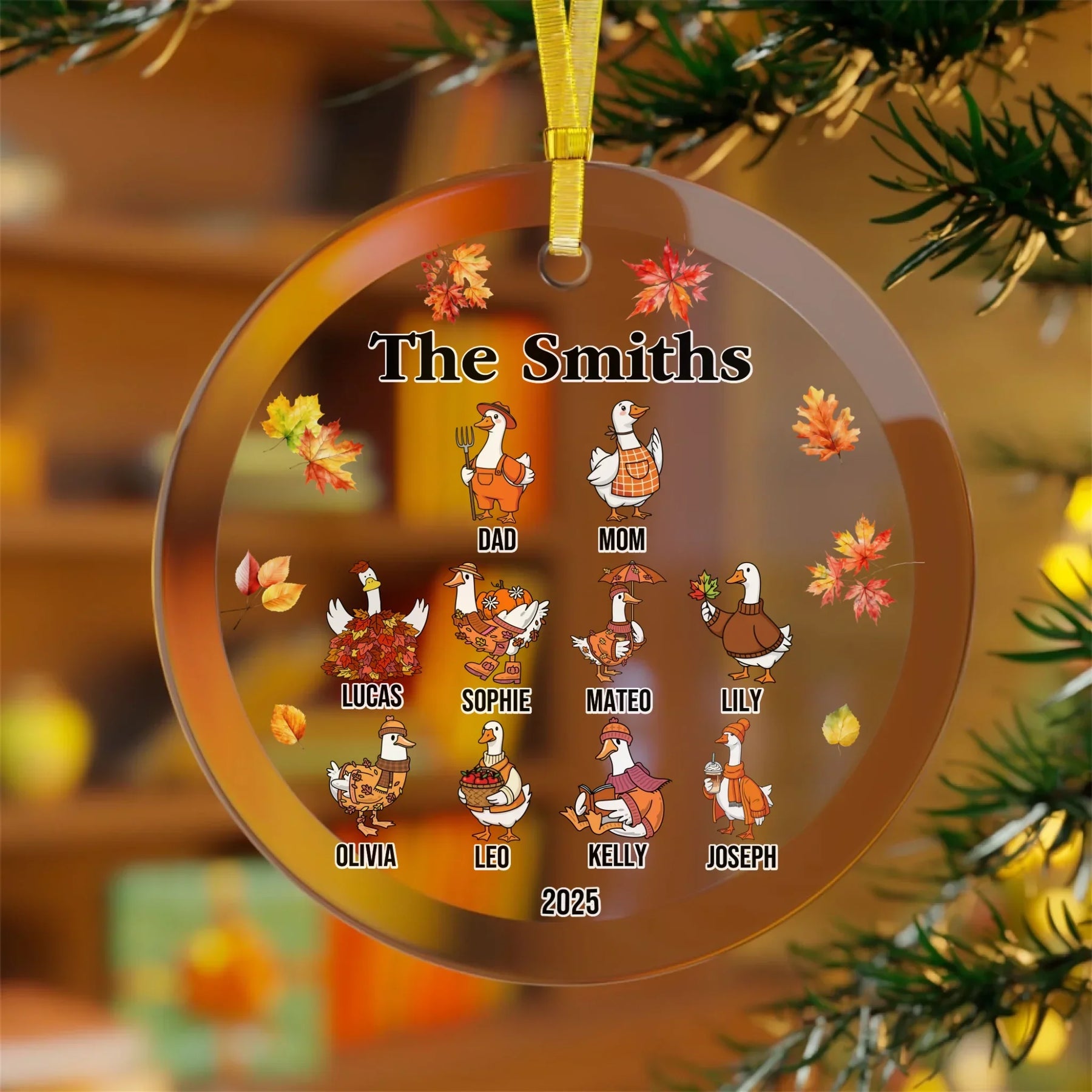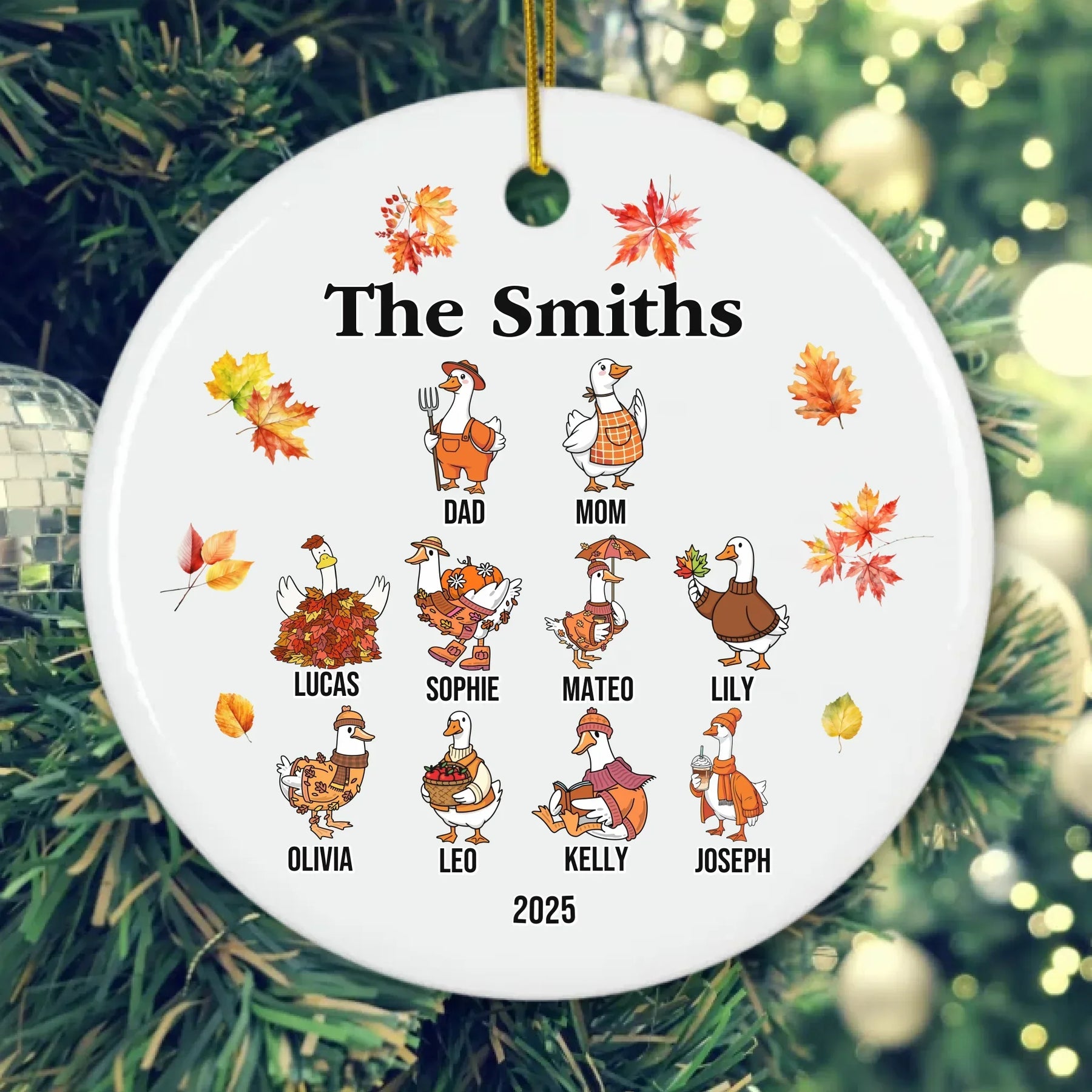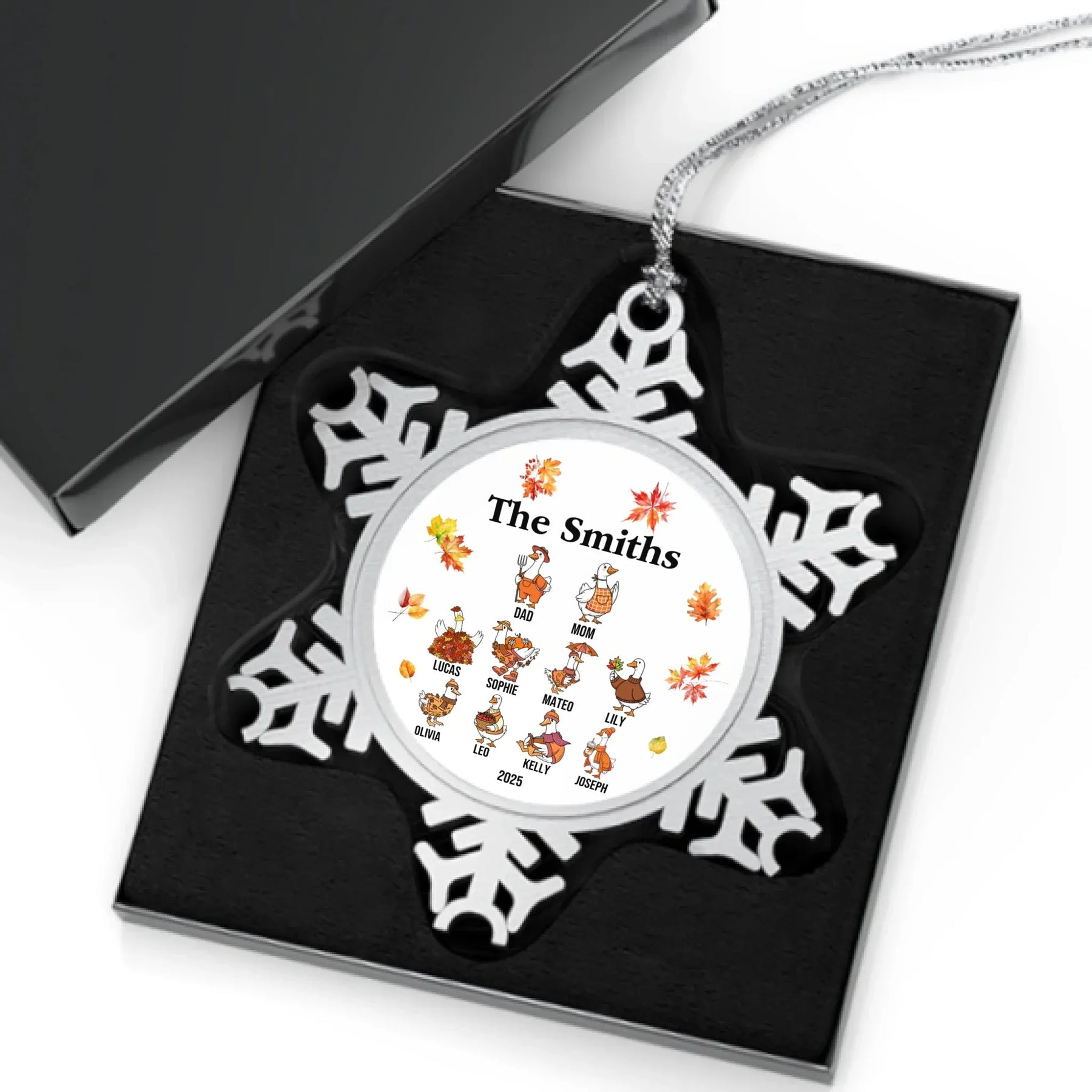Our personalized goose ornament is available in glass, ceramic, Christmas ball, and pewter snowflake finishes. Each material offers its own appeal, from classic shine to elegant texture. The design features bright autumn leaves and cheerful goose characters that bring seasonal joy to any room. It looks beautiful on Christmas trees, mantels, or displayed as part of your holiday décor.