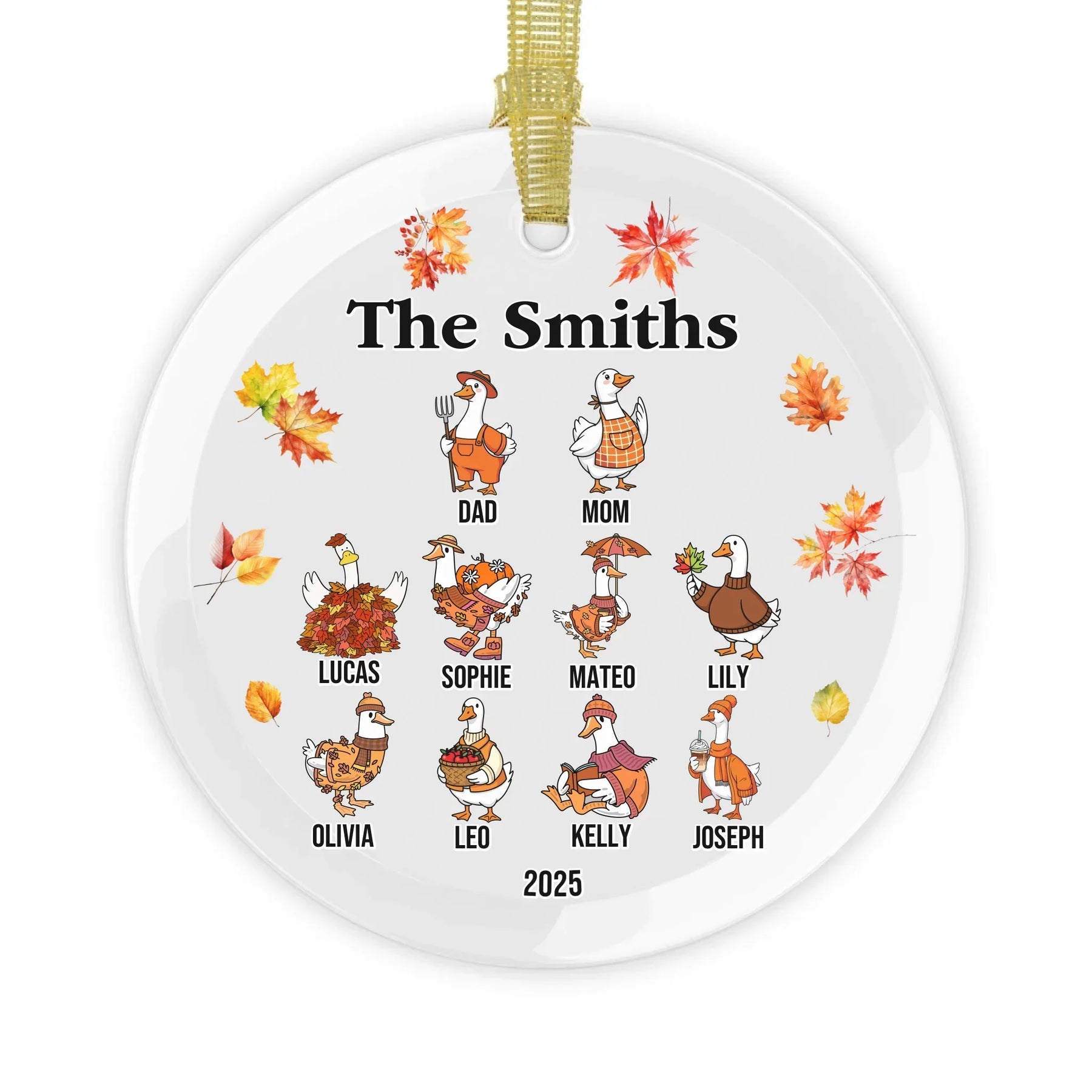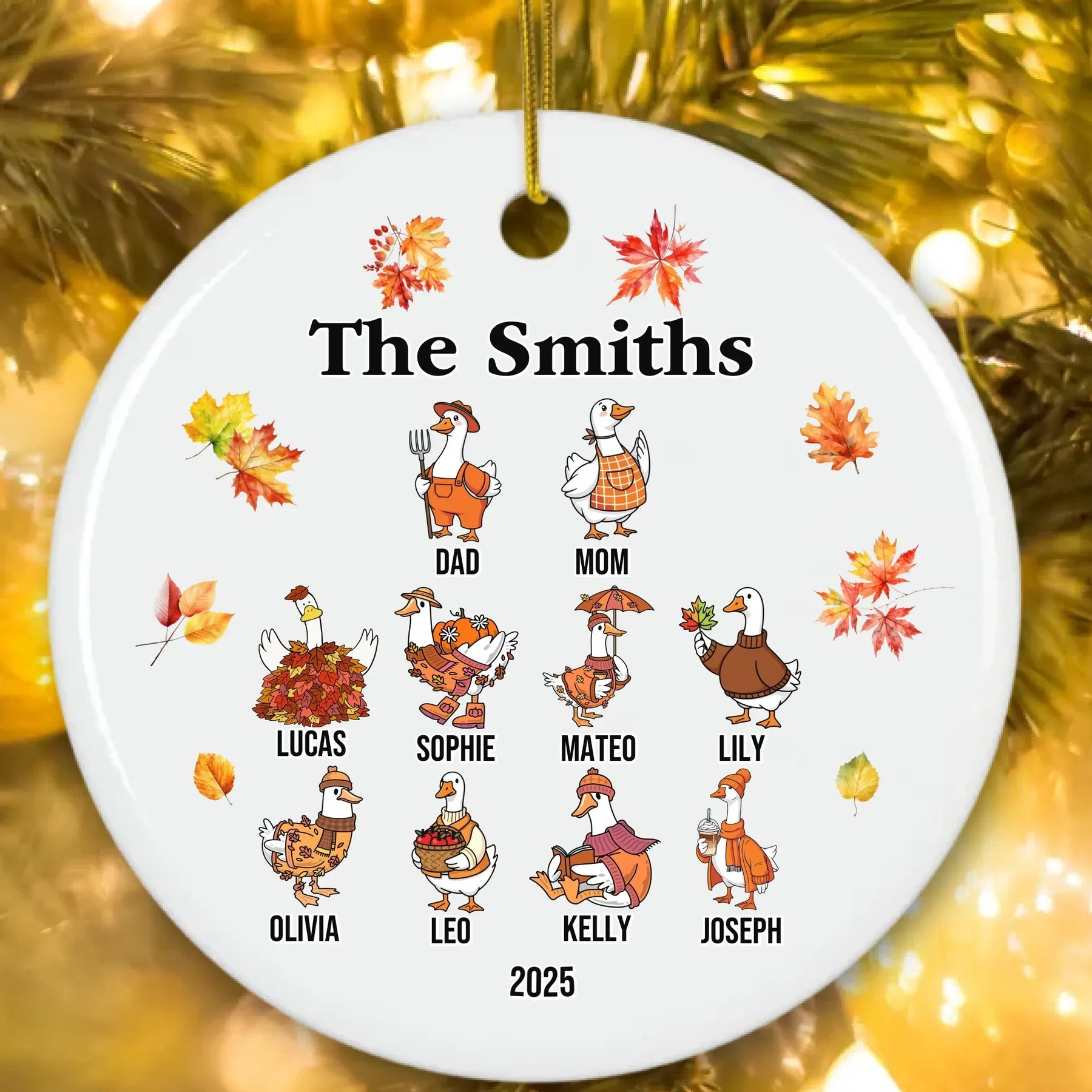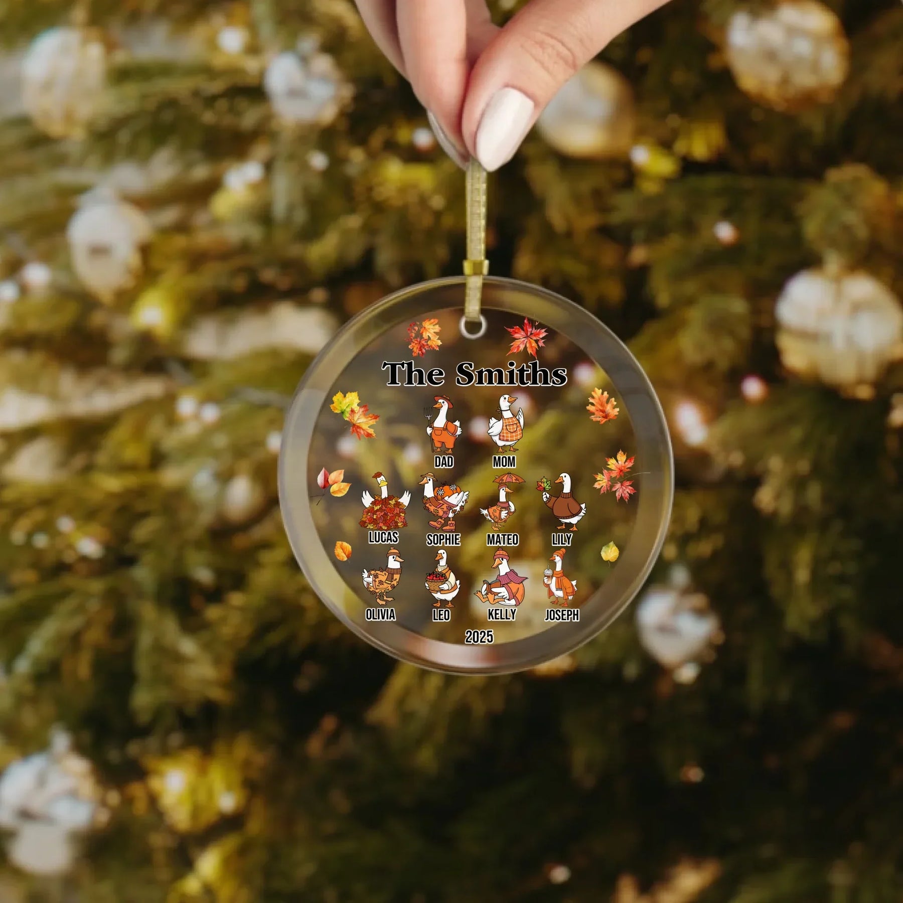 Our personalized goose ornament is available in glass, ceramic, Christmas ball, and pewter snowflake finishes. Each material offers its own appeal, from classic shine to elegant texture. The design features bright autumn leaves and cheerful goose characters that bring seasonal joy to any room. It looks beautiful on Christmas trees, mantels, or displayed as part of your holiday décor.