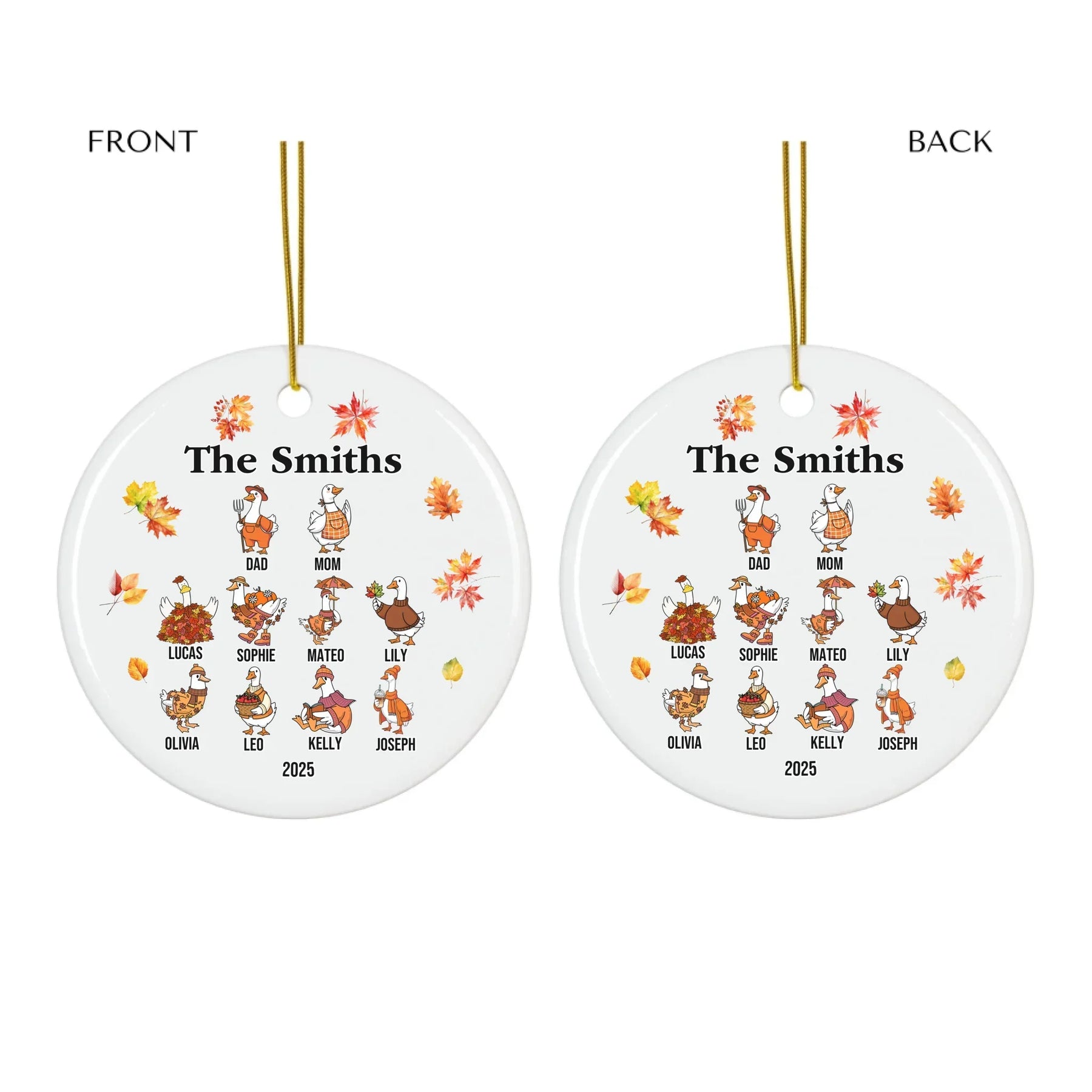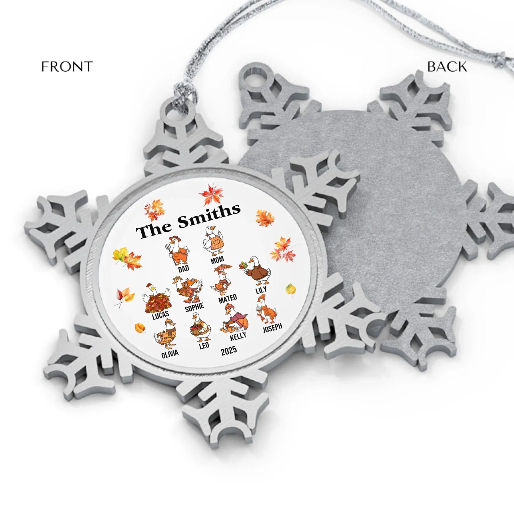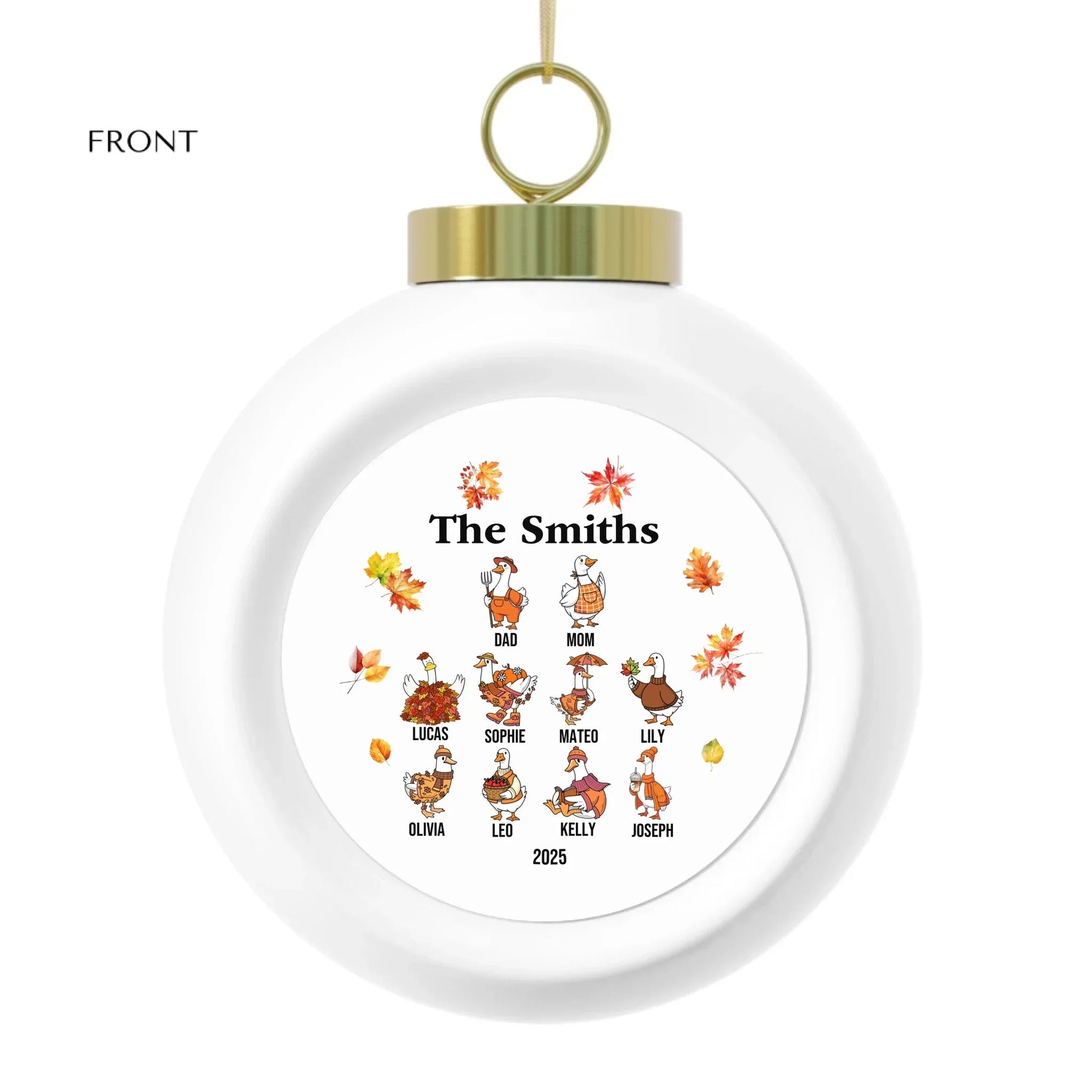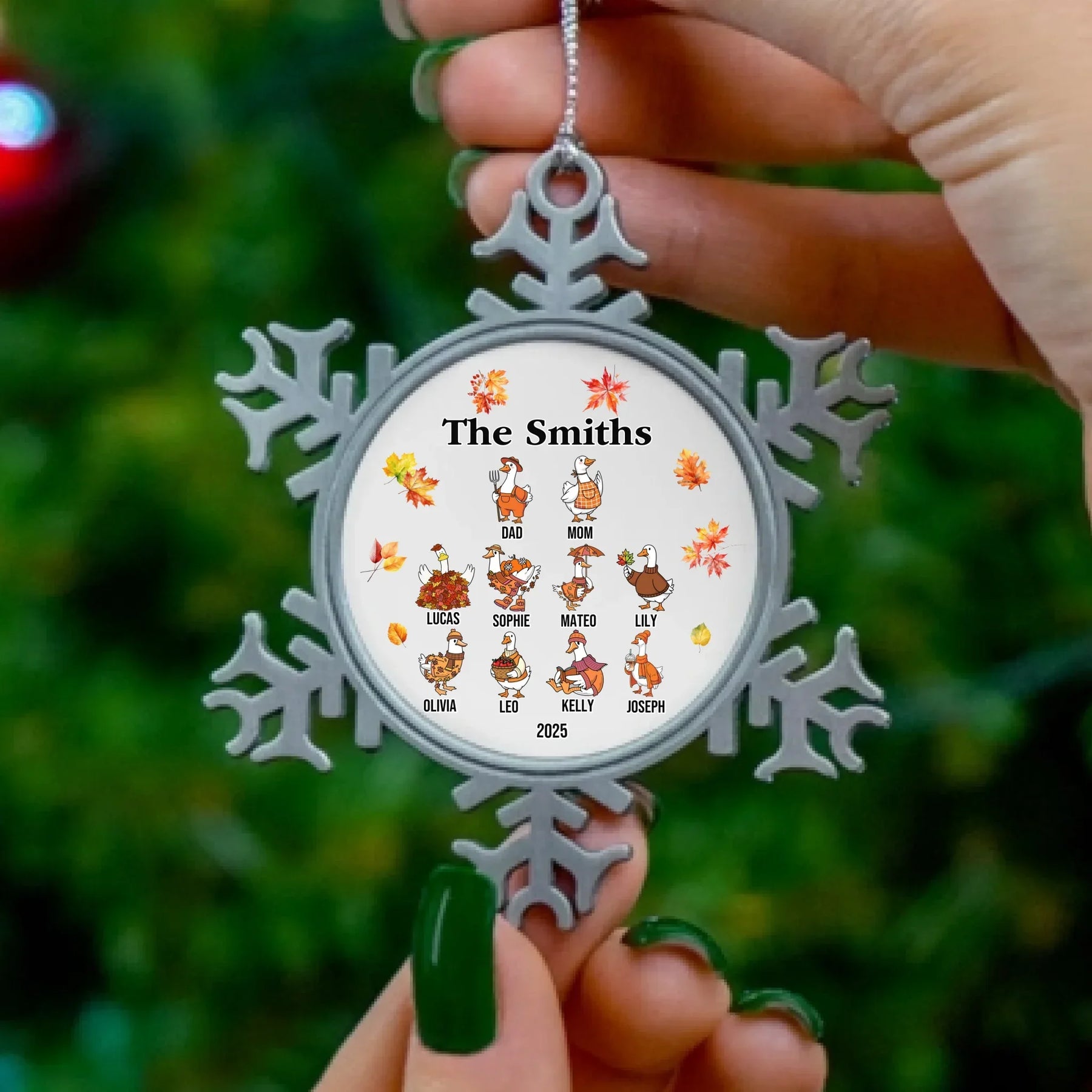 Our personalized goose ornament is available in glass, ceramic, Christmas ball, and pewter snowflake finishes. Each material offers its own appeal, from classic shine to elegant texture. The design features bright autumn leaves and cheerful goose characters that bring seasonal joy to any room. It looks beautiful on Christmas trees, mantels, or displayed as part of your holiday décor.