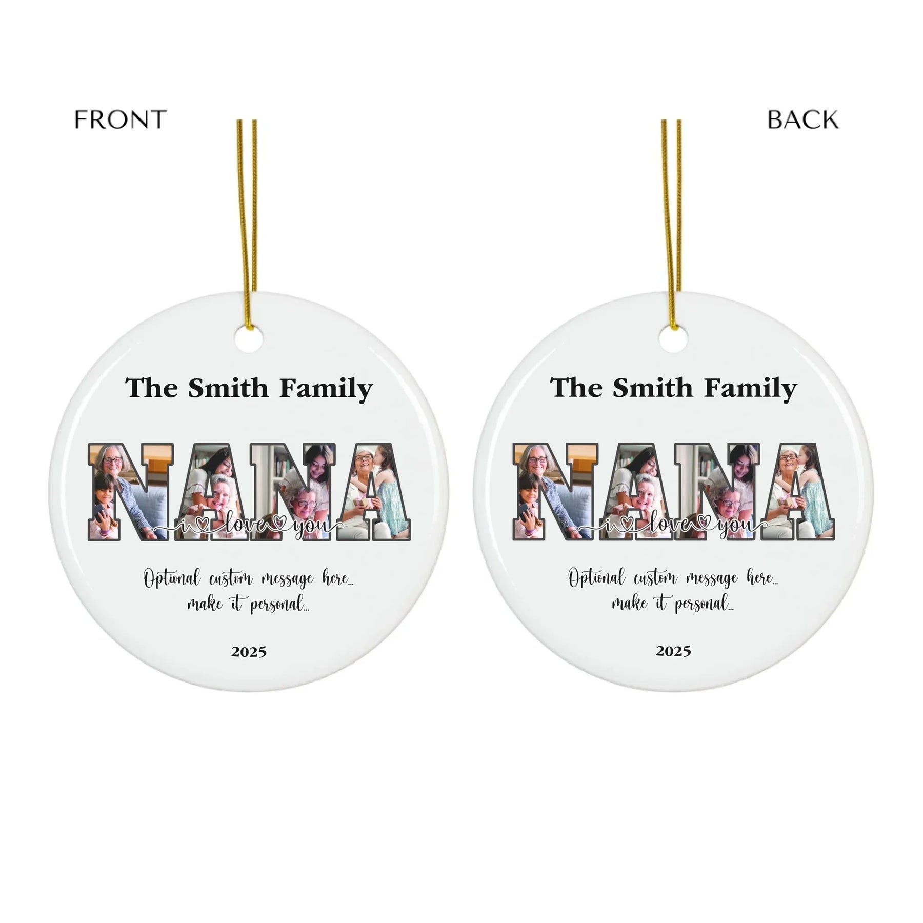 Each custom NANA photo ornament is carefully designed to showcase the love your family shares. Upload your favorite images — from family gatherings and holiday celebrations to candid smiles and cozy moments — and watch them transform into a stunning piece of art.