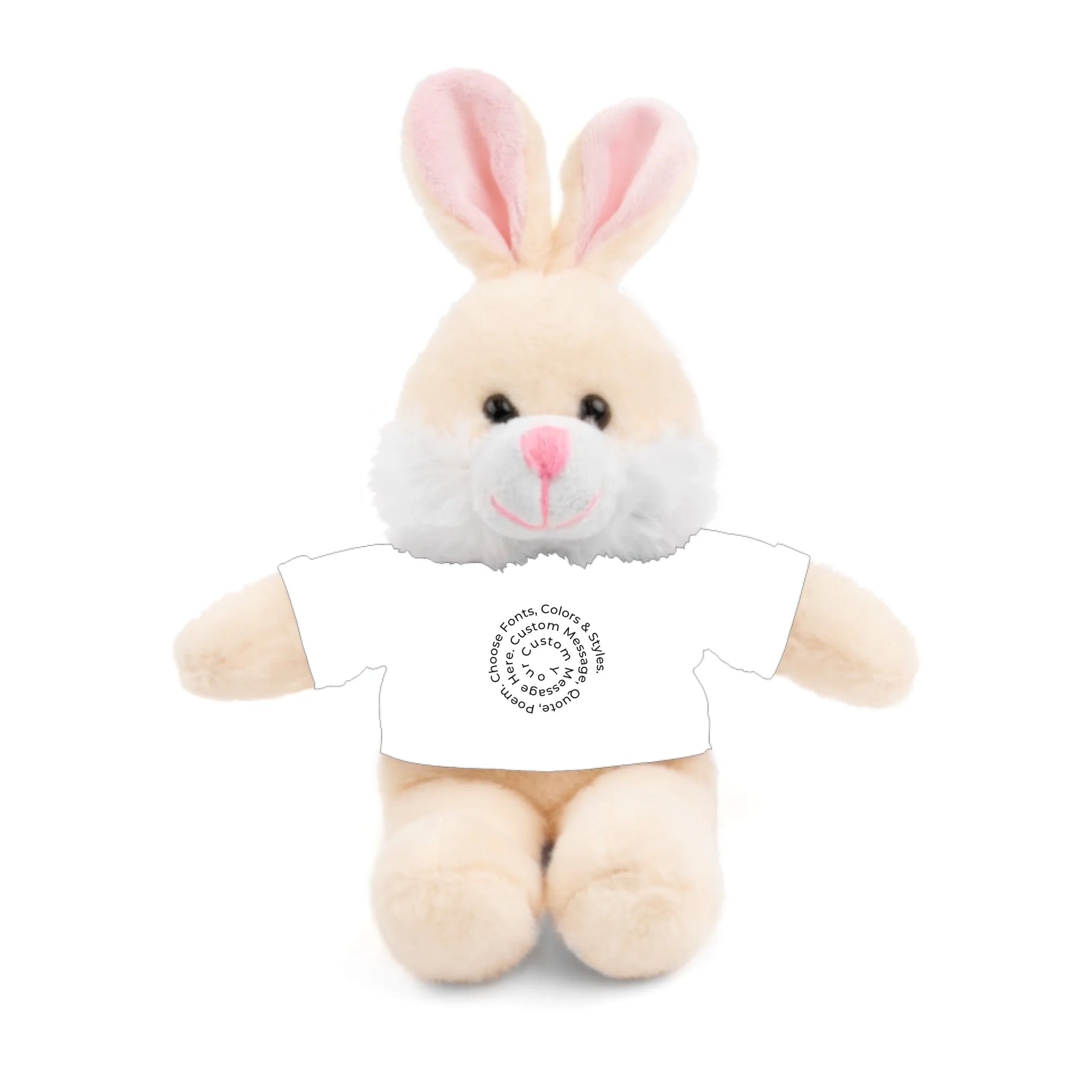 Each adorable stuffed animal features a soft t-shirt ready for your custom design. Personalize it with names, dates, short quotes, logos, or even creative extras like scrabble letter layouts, QR codes, Spotify song links, or photo prints. Choose from various font styles, text colors, and t-shirt shades to perfectly match your theme, mood, or occasion.