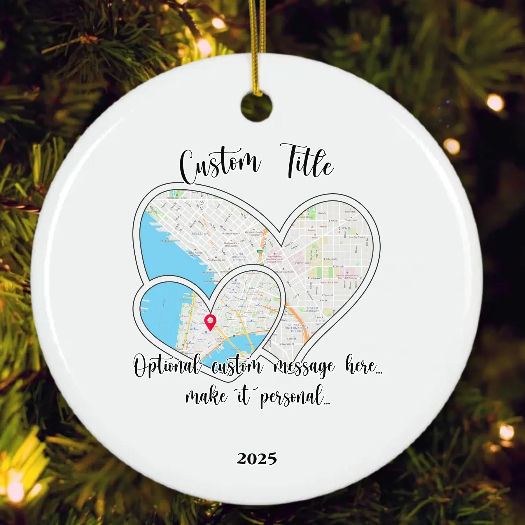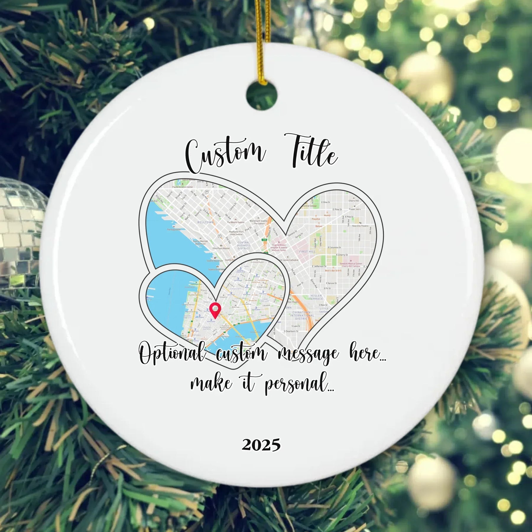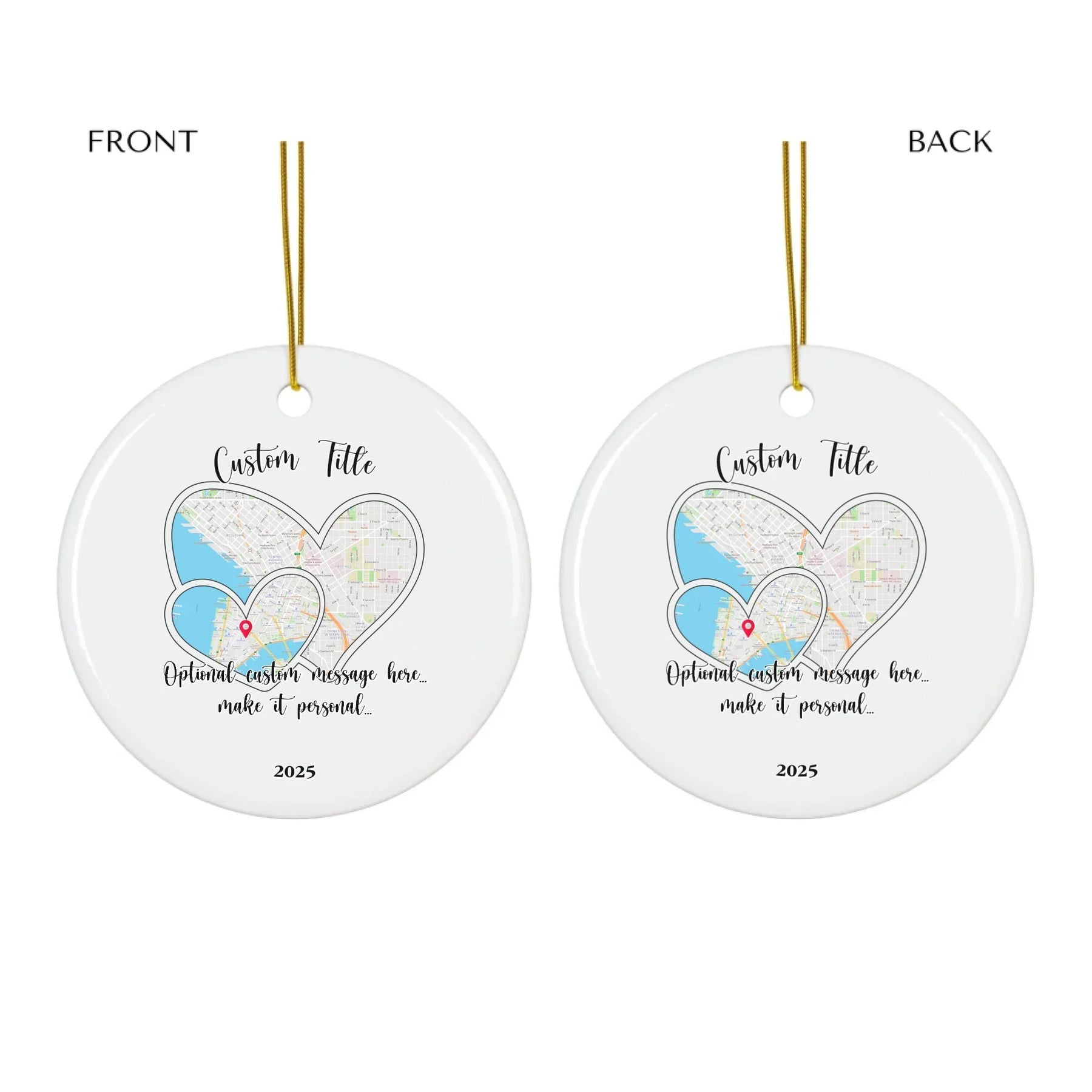 Each ornament features two map hearts, side by side, symbolizing love that bridges miles. Choose any two locations—hometowns, universities, engagement spots, or favorite travel destinations. Add a custom title, optional message, and footer with any year or phrase for a personal touch.