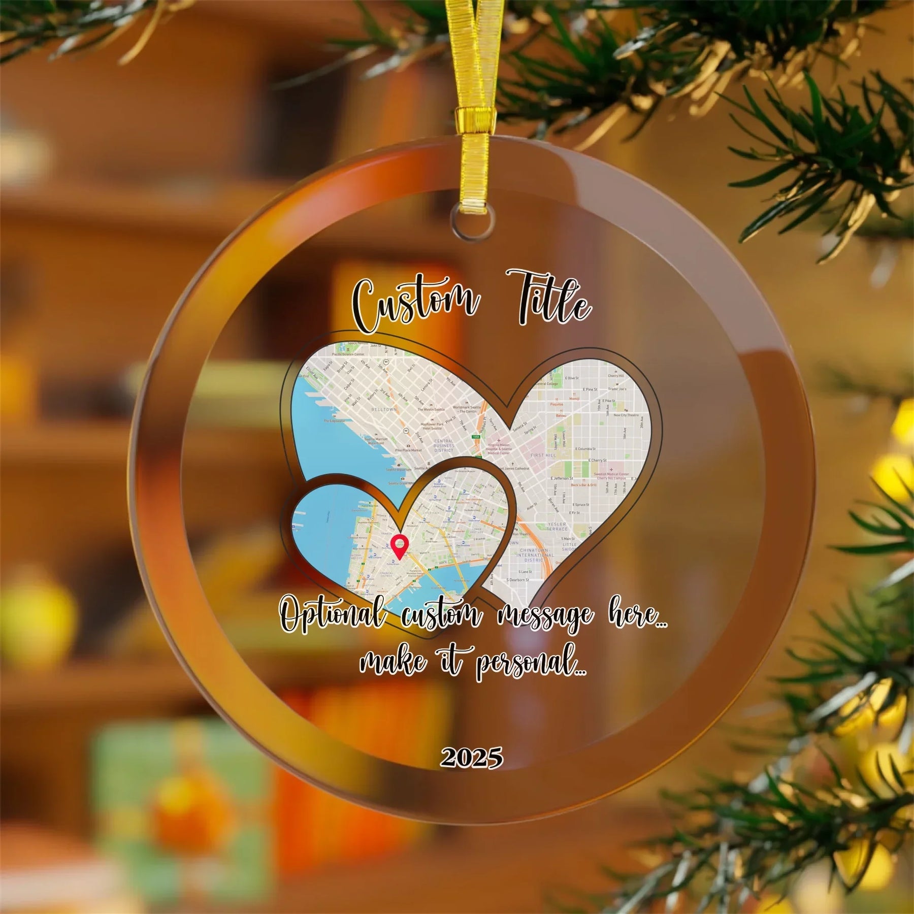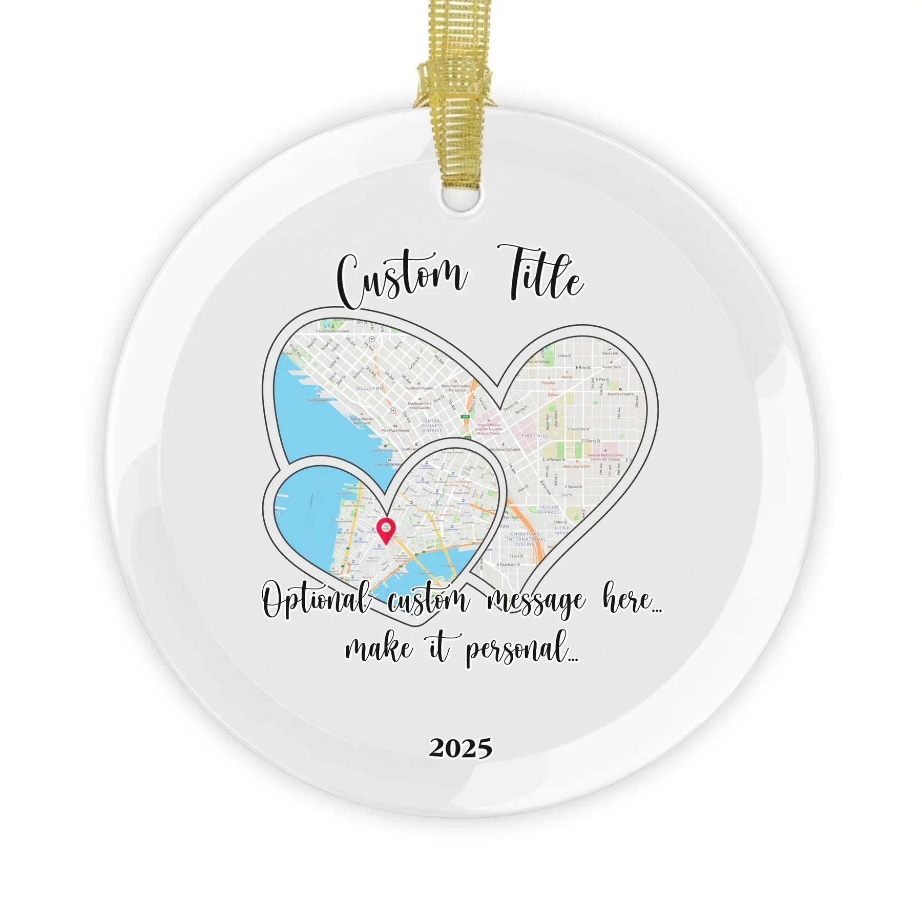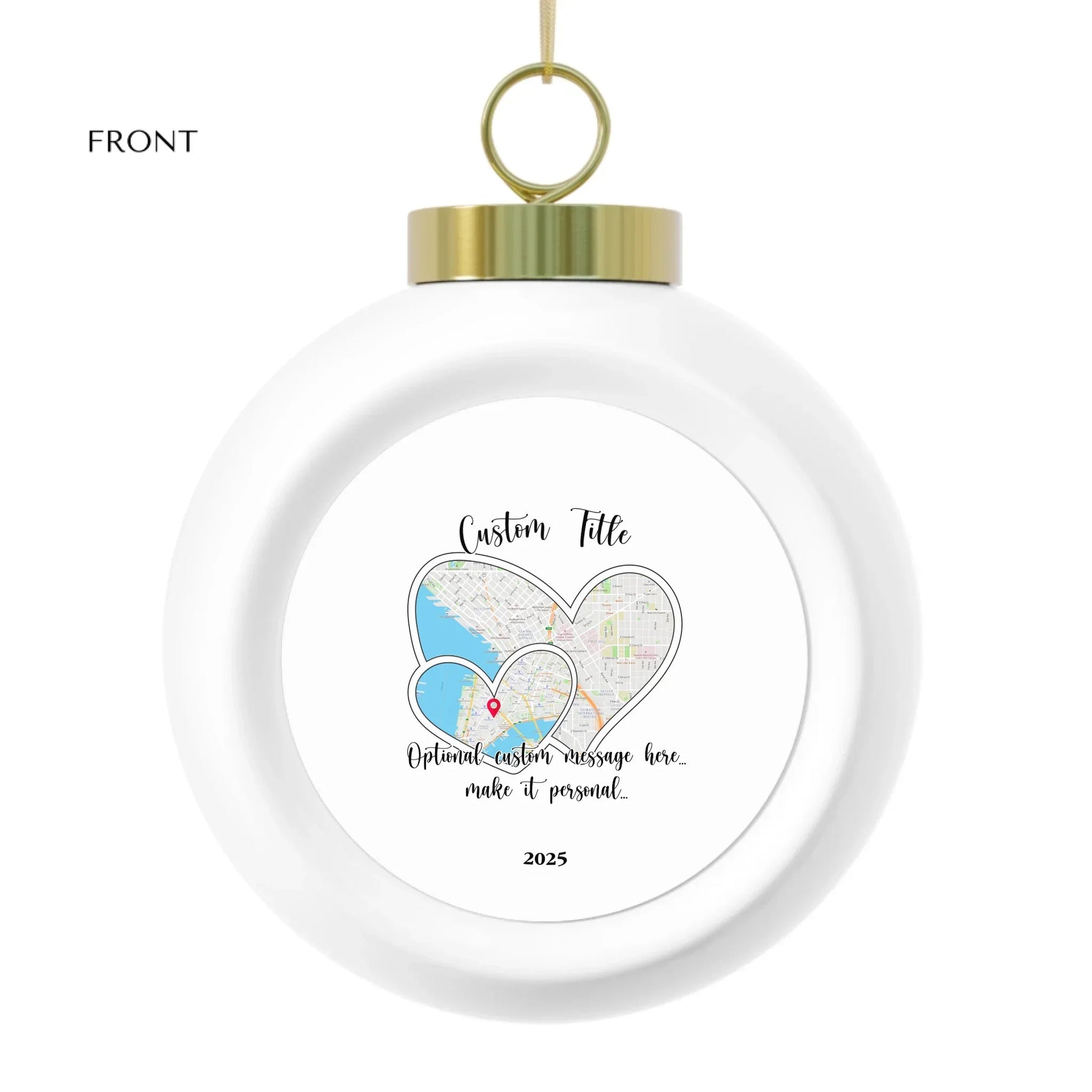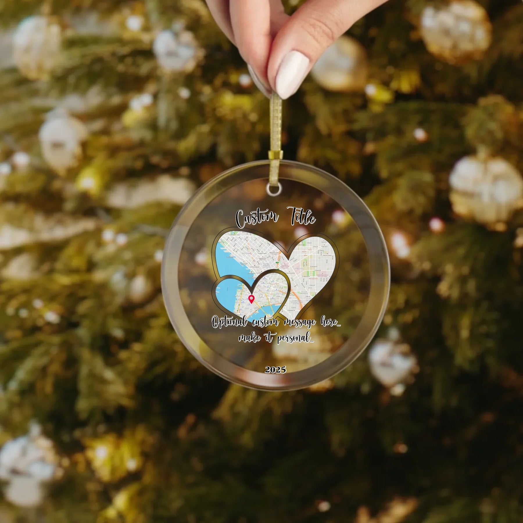 Each ornament features two map hearts, side by side, symbolizing love that bridges miles. Choose any two locations—hometowns, universities, engagement spots, or favorite travel destinations. Add a custom title, optional message, and footer with any year or phrase for a personal touch.