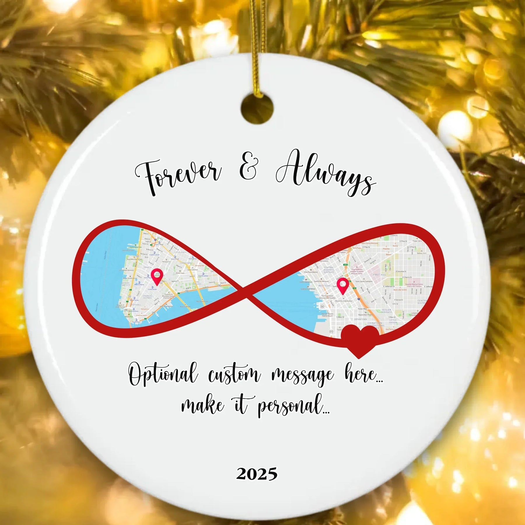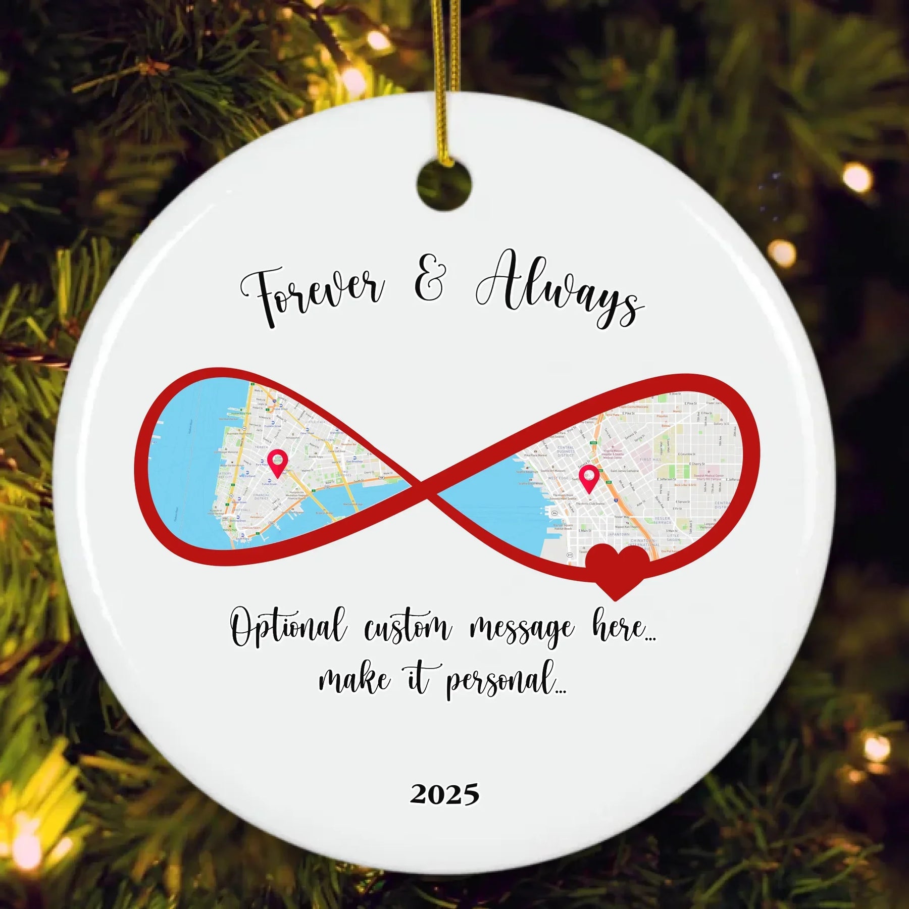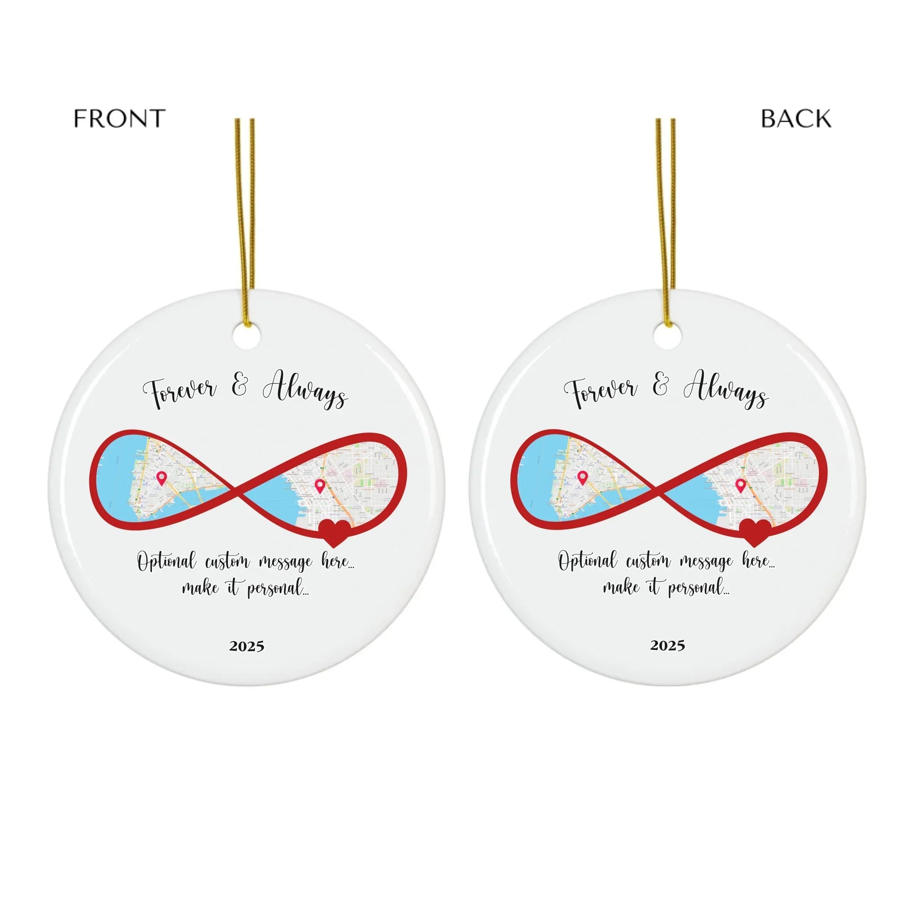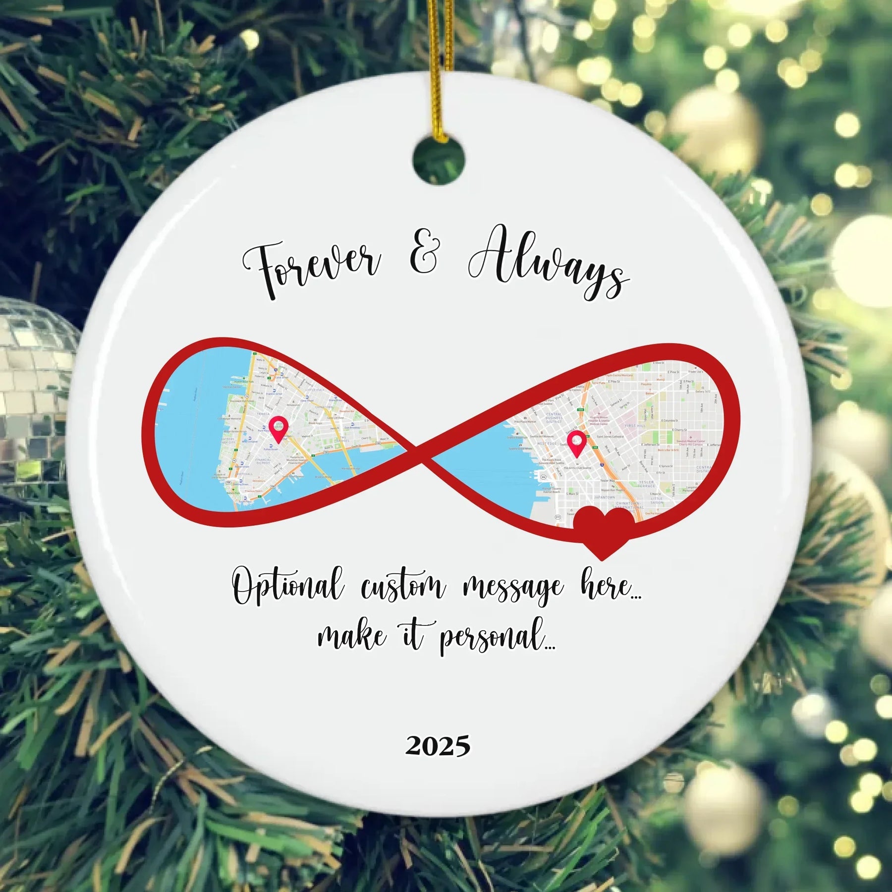 Celebrate love without limits with our Custom Map Ornament, a timeless way to connect two meaningful locations. The elegant infinity design symbolizes an unbreakable bond, making it a perfect keepsake for couples, families, or friends separated by distance.
