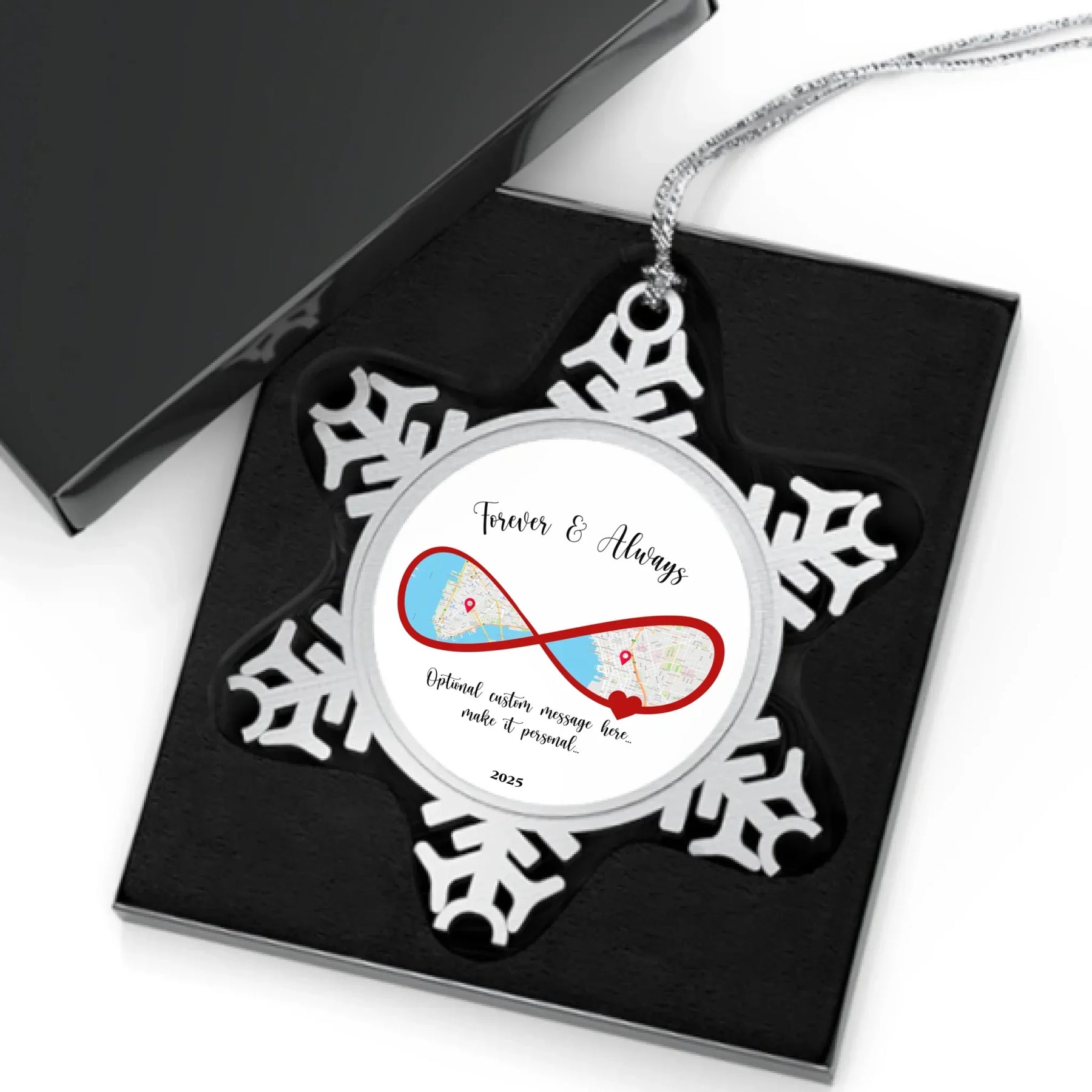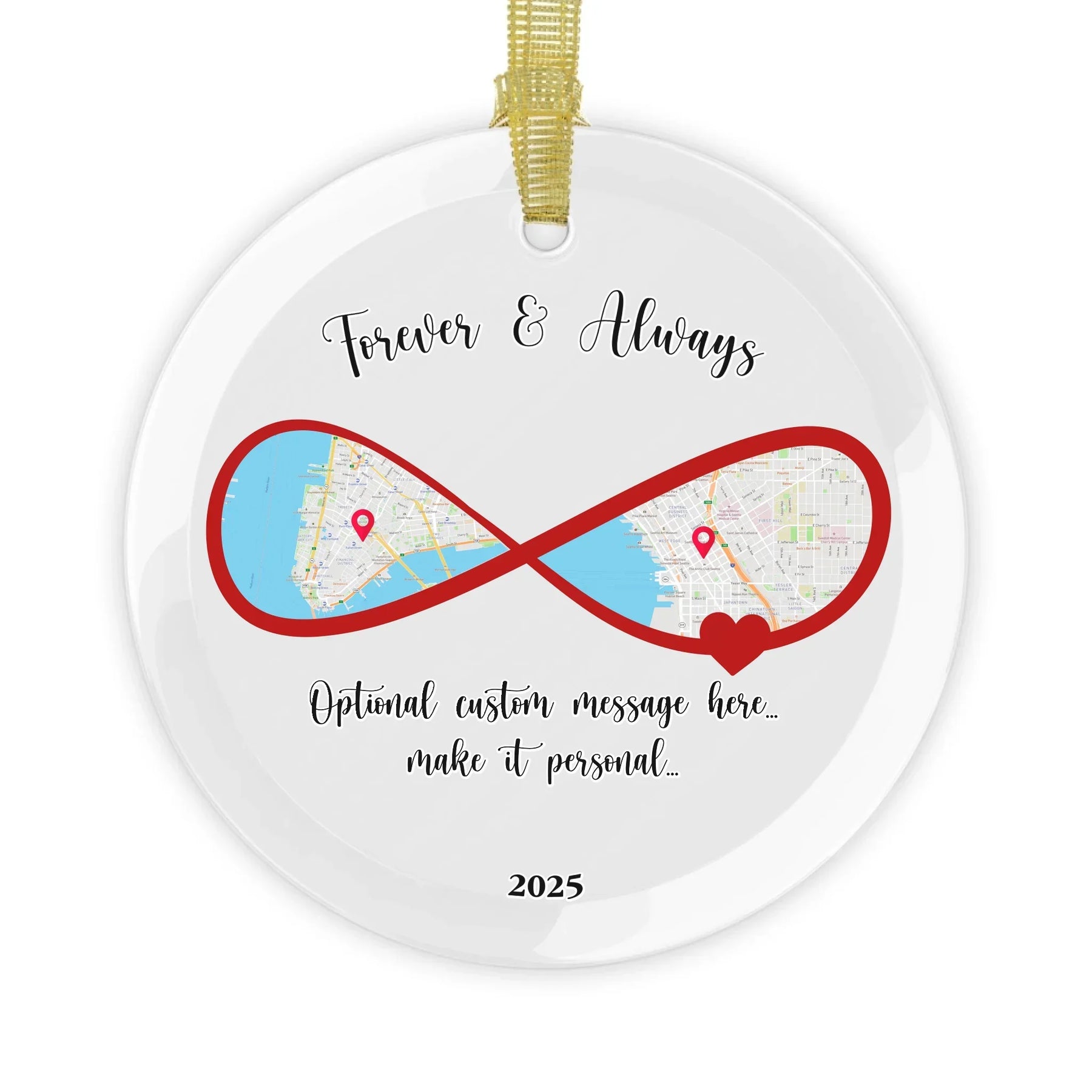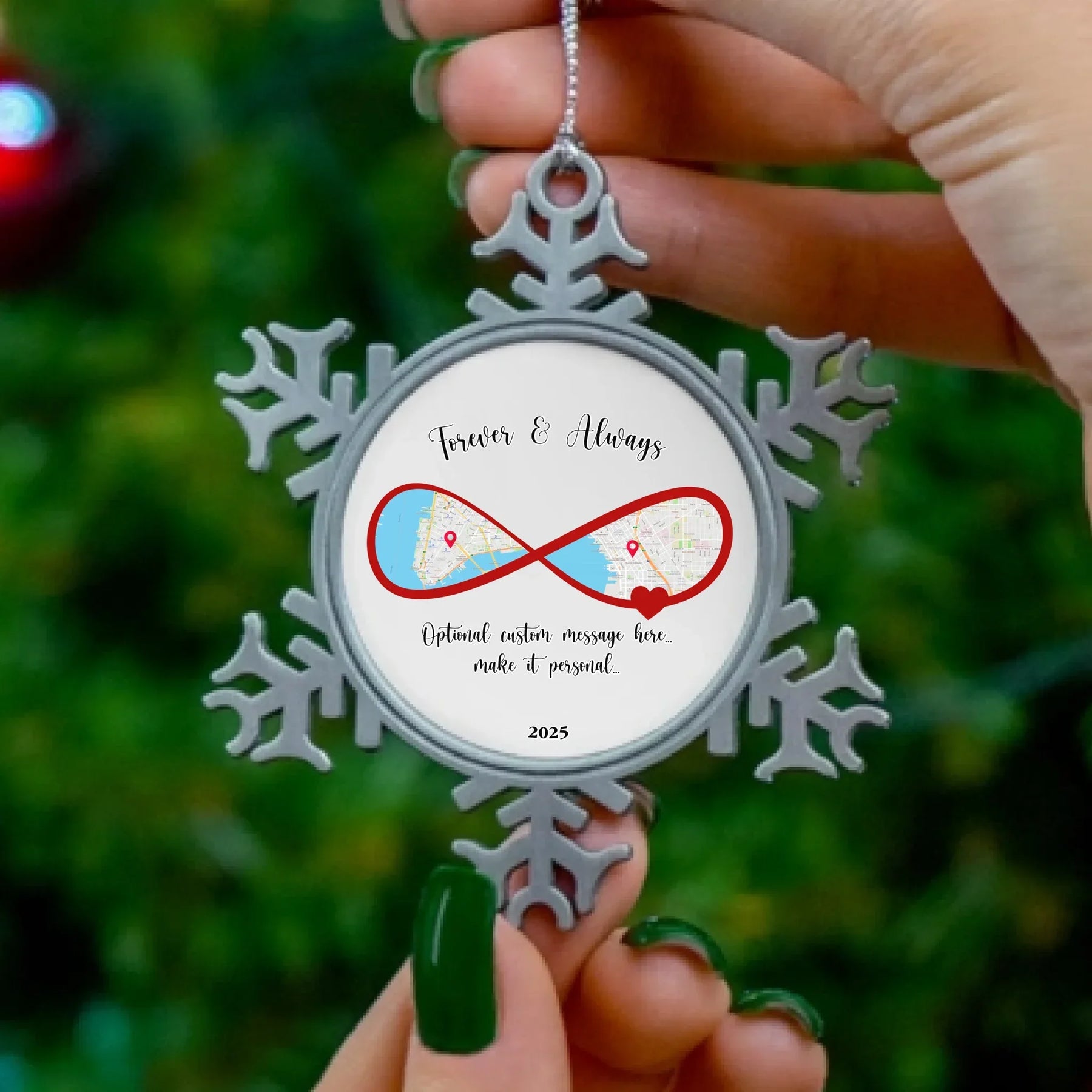 Celebrate love without limits with our Custom Map Ornament, a timeless way to connect two meaningful locations. The elegant infinity design symbolizes an unbreakable bond, making it a perfect keepsake for couples, families, or friends separated by distance.