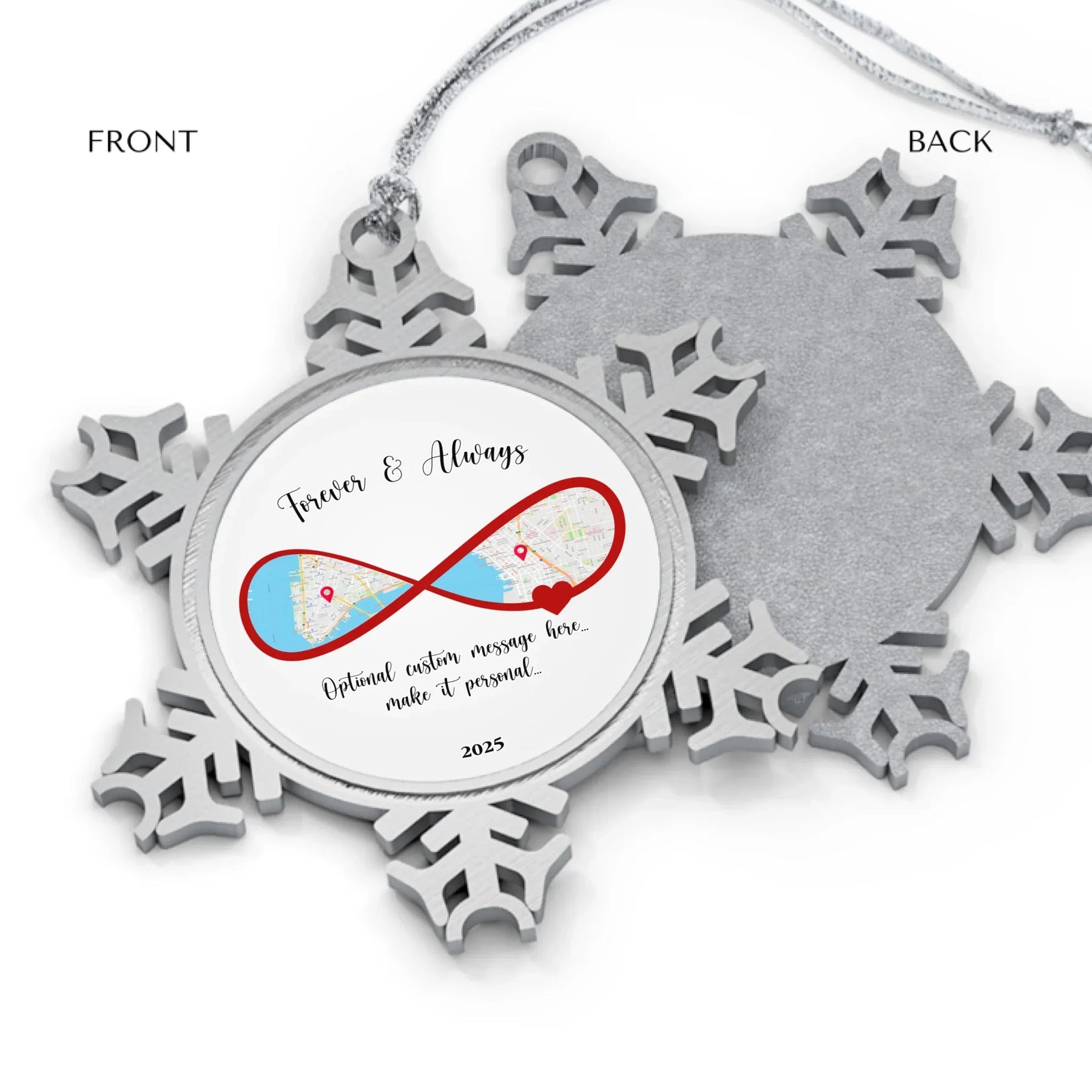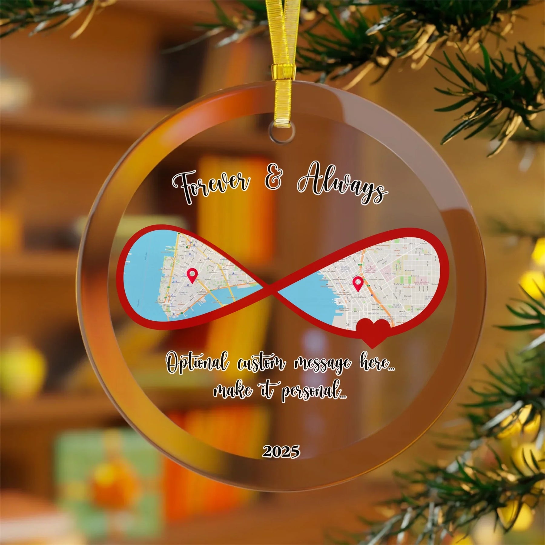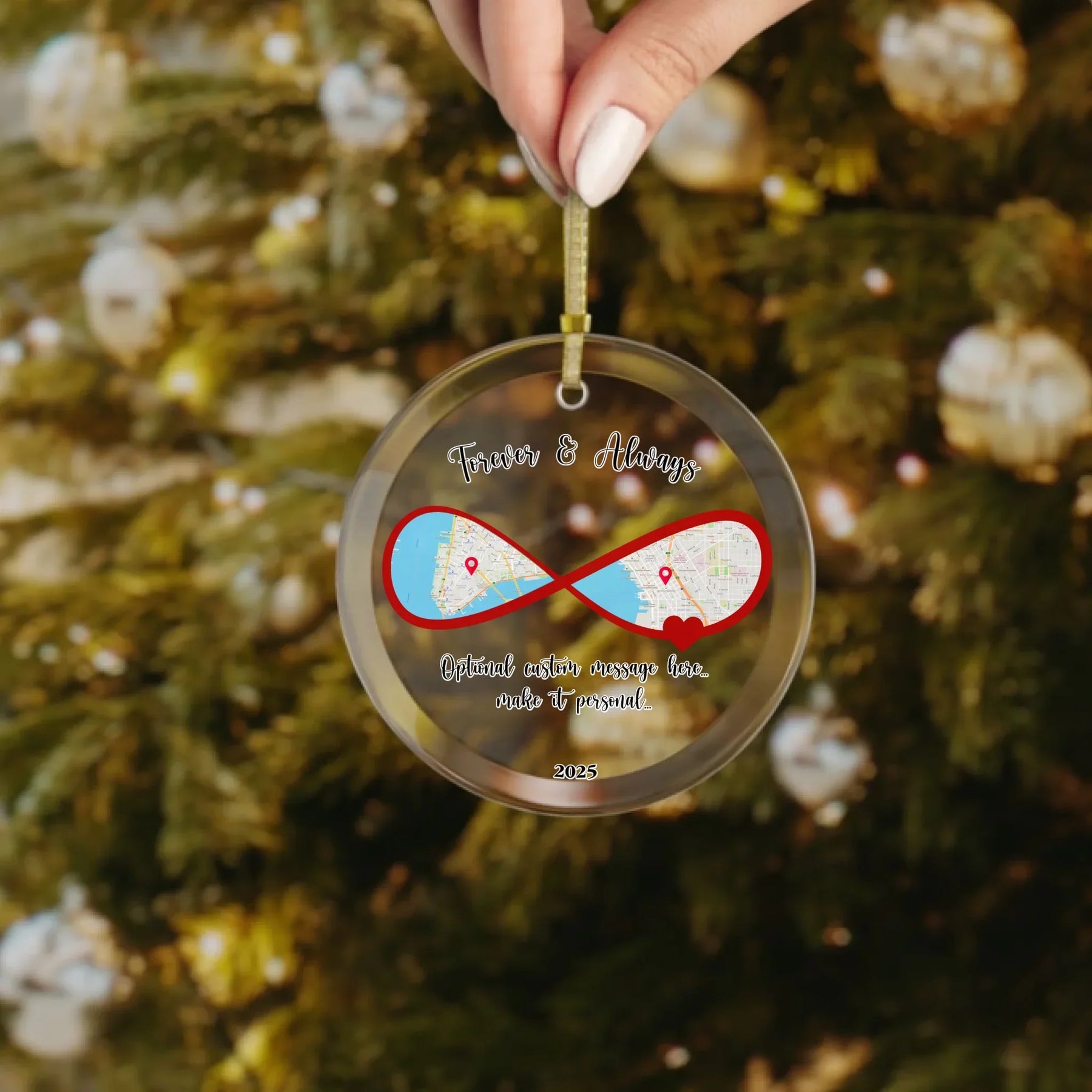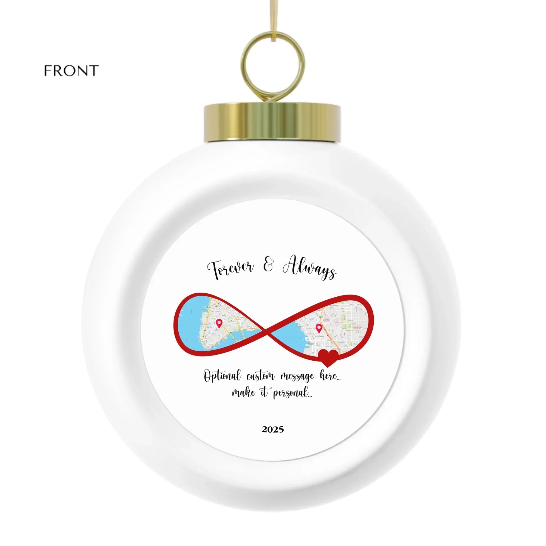 Celebrate love without limits with our Custom Map Ornament, a timeless way to connect two meaningful locations. The elegant infinity design symbolizes an unbreakable bond, making it a perfect keepsake for couples, families, or friends separated by distance.