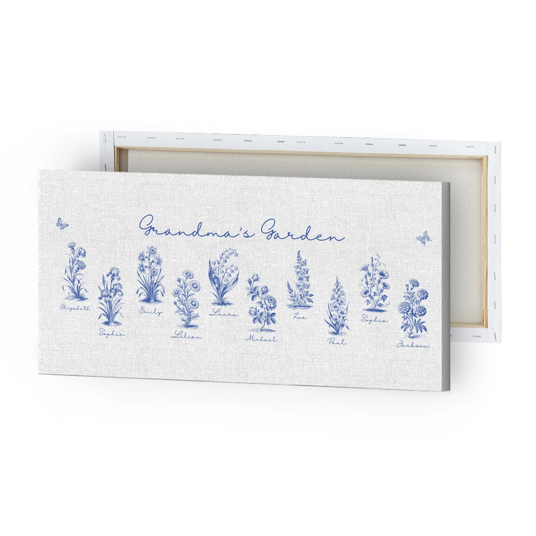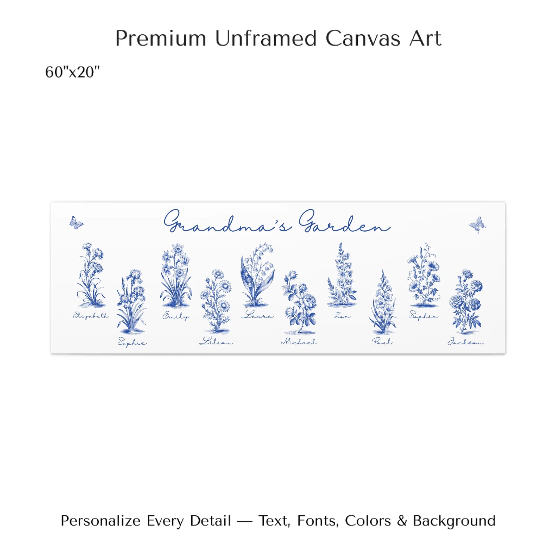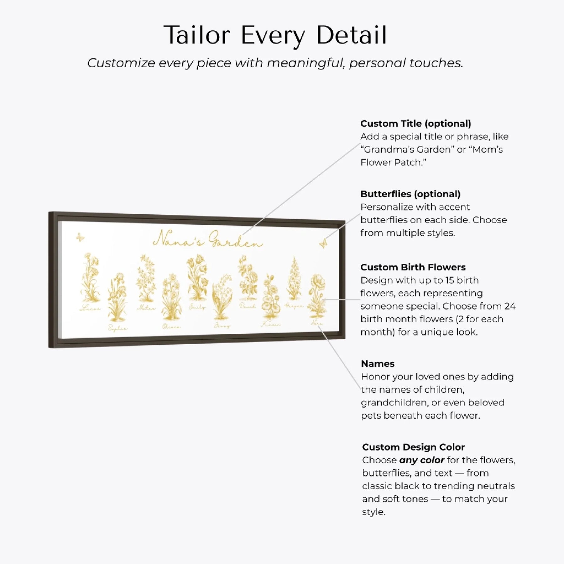 Make this custom wall art uniquely yours. Add a special title like “Grandma’s Garden” or “Mom’s Flower Patch” to honor someone dear.