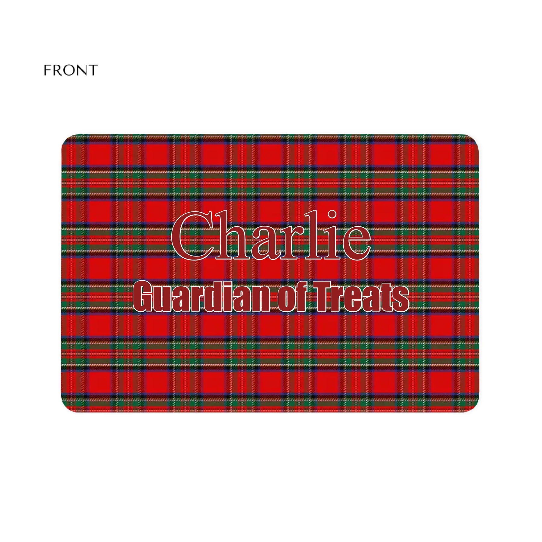 Personalized tartan plaid pet feeding mat with custom text like a name. Available in different plaid colors for dogs or cats-ARTFULANE