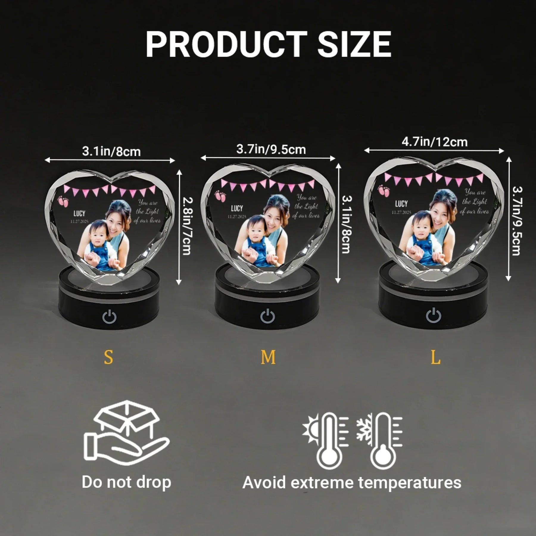 Preserve the bond between a mother and child in luminous beauty with the Heart Lace Crystal Keepsake. This elegant heart-shaped crystal baby gift transforms a favorite photo into a radiant 3D display of love. Crafted from premium optical crystal and set on an LED base, it captures light, warmth, and memory in every detail.