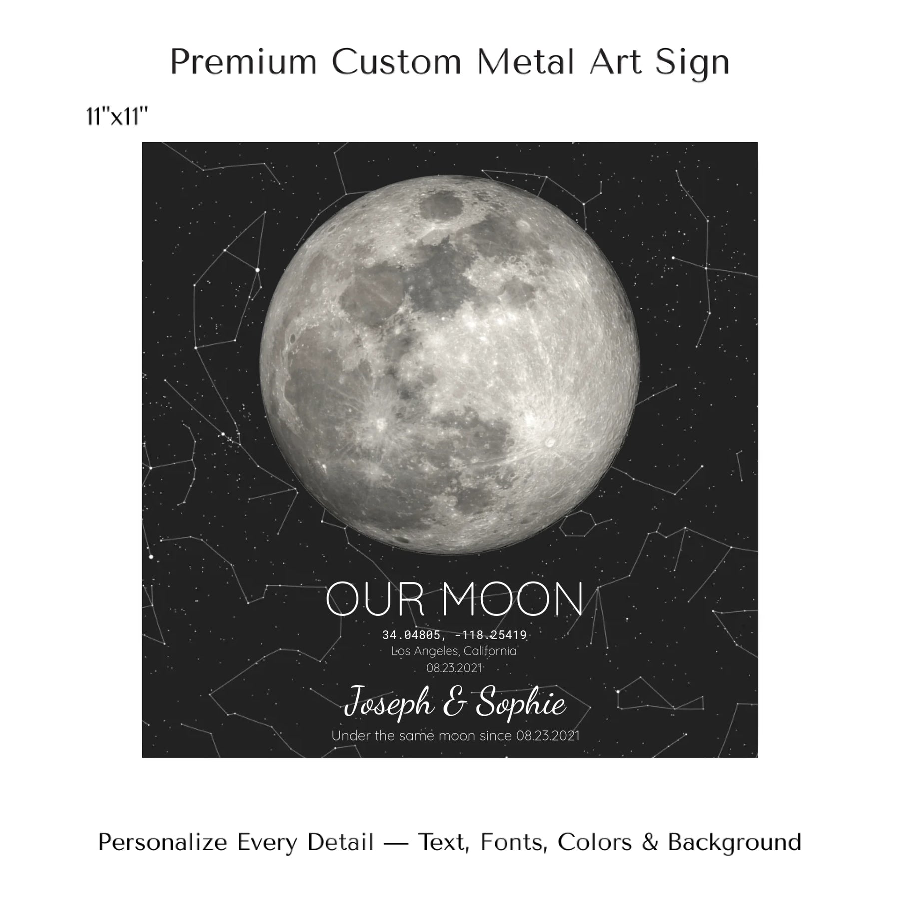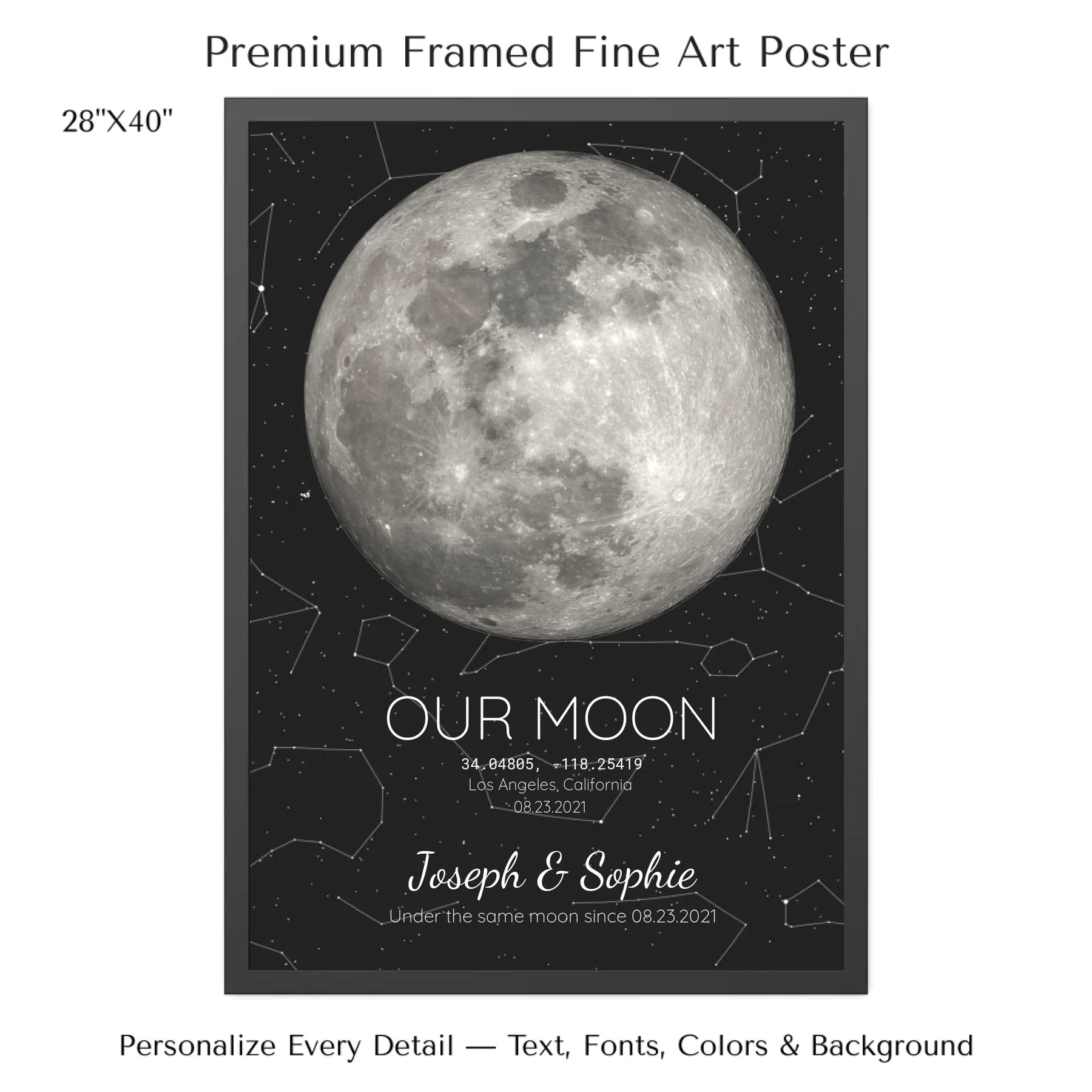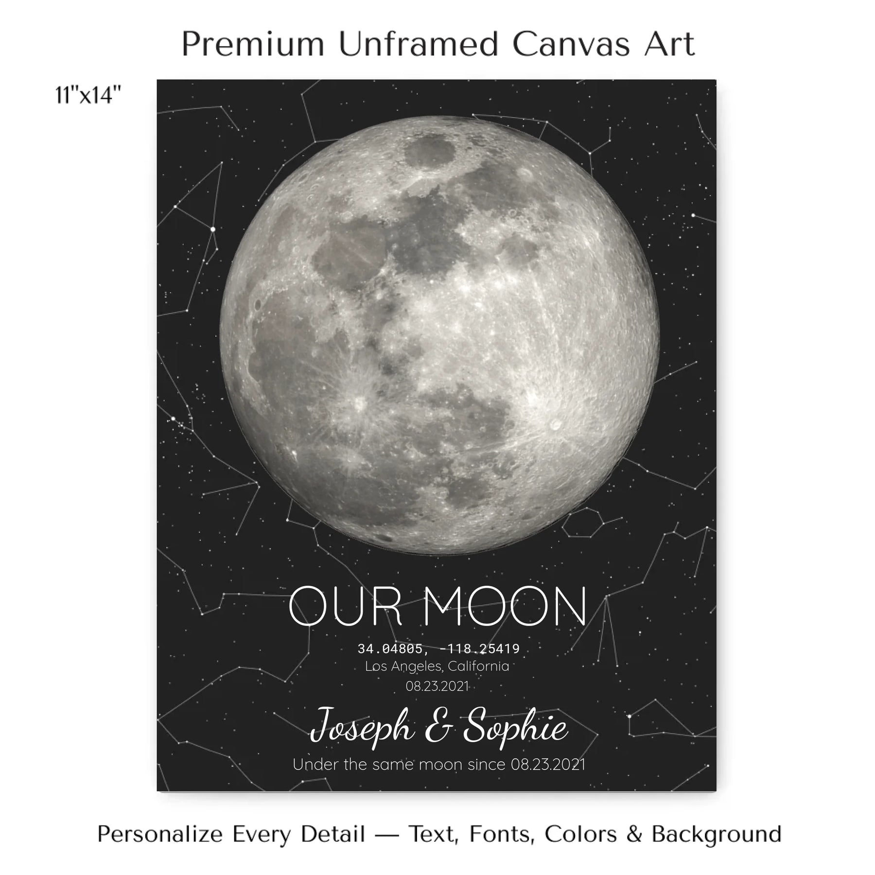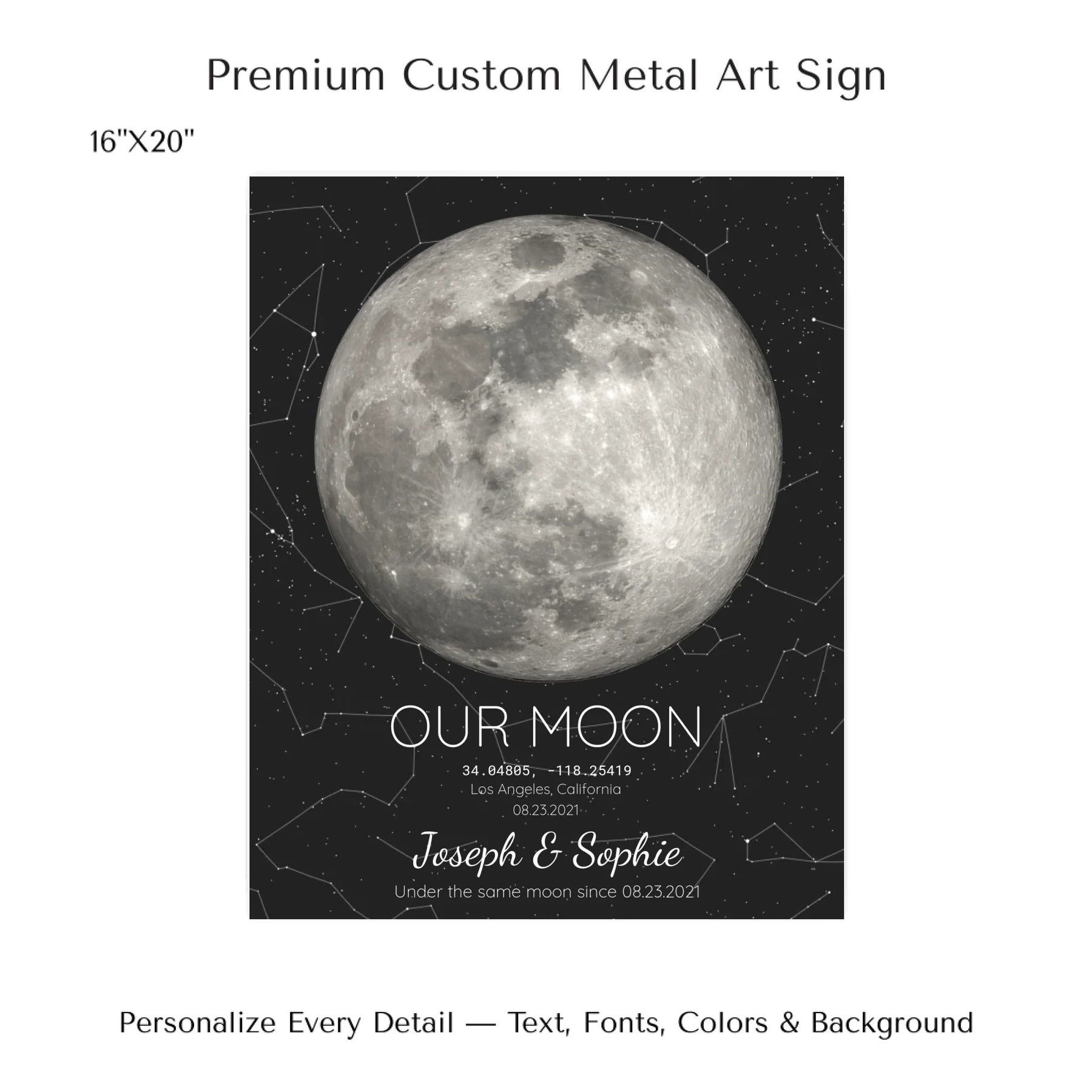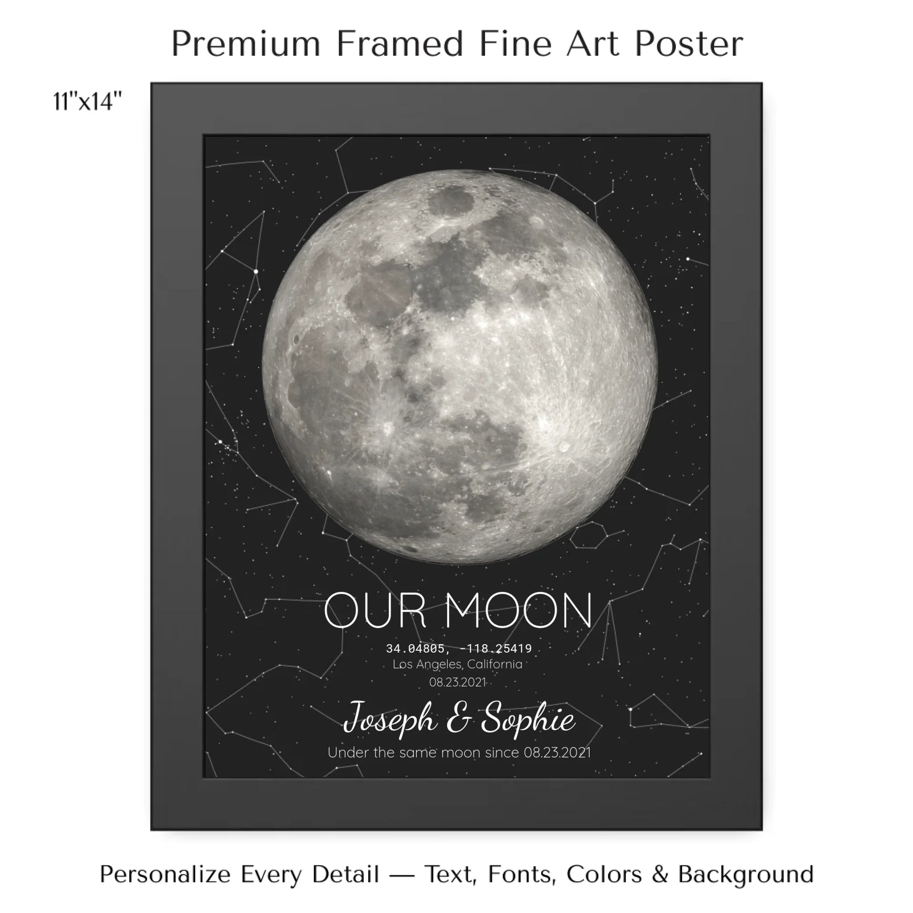 This personalized design features a custom moon phase paired with a star map, based on your location and date.
