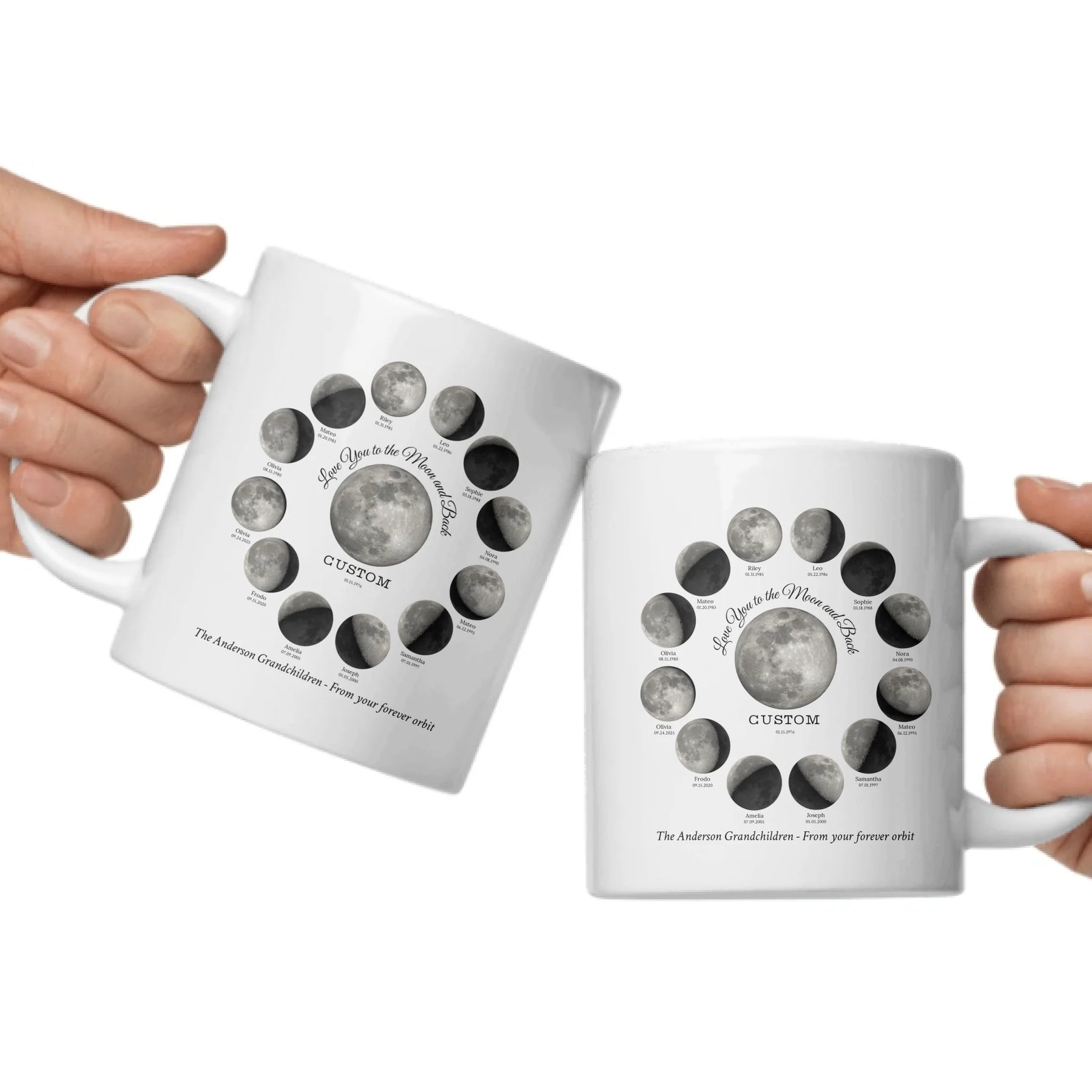 Capture the beauty of every meaningful moment with our Custom Silver Moon Phase Circle Mug – a deeply personal gift for grandparents, parents, or anyone who’s your “forever orbit.” This stunning design displays up to 12 personalized moon phases, each with custom names and dates that represent birthdays, milestones, or cherished memories.