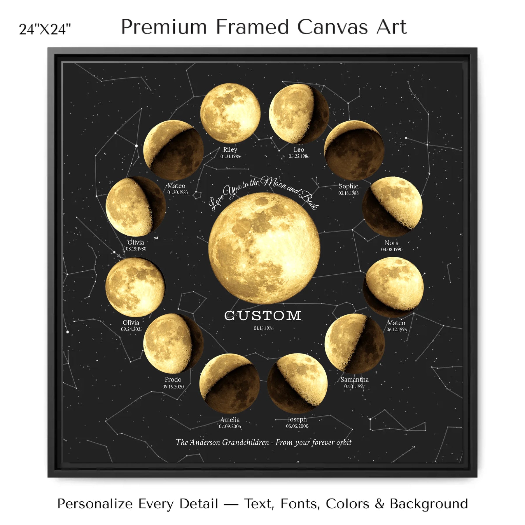 Add names and birth dates under each moon for a meaningful, celestial tribute.