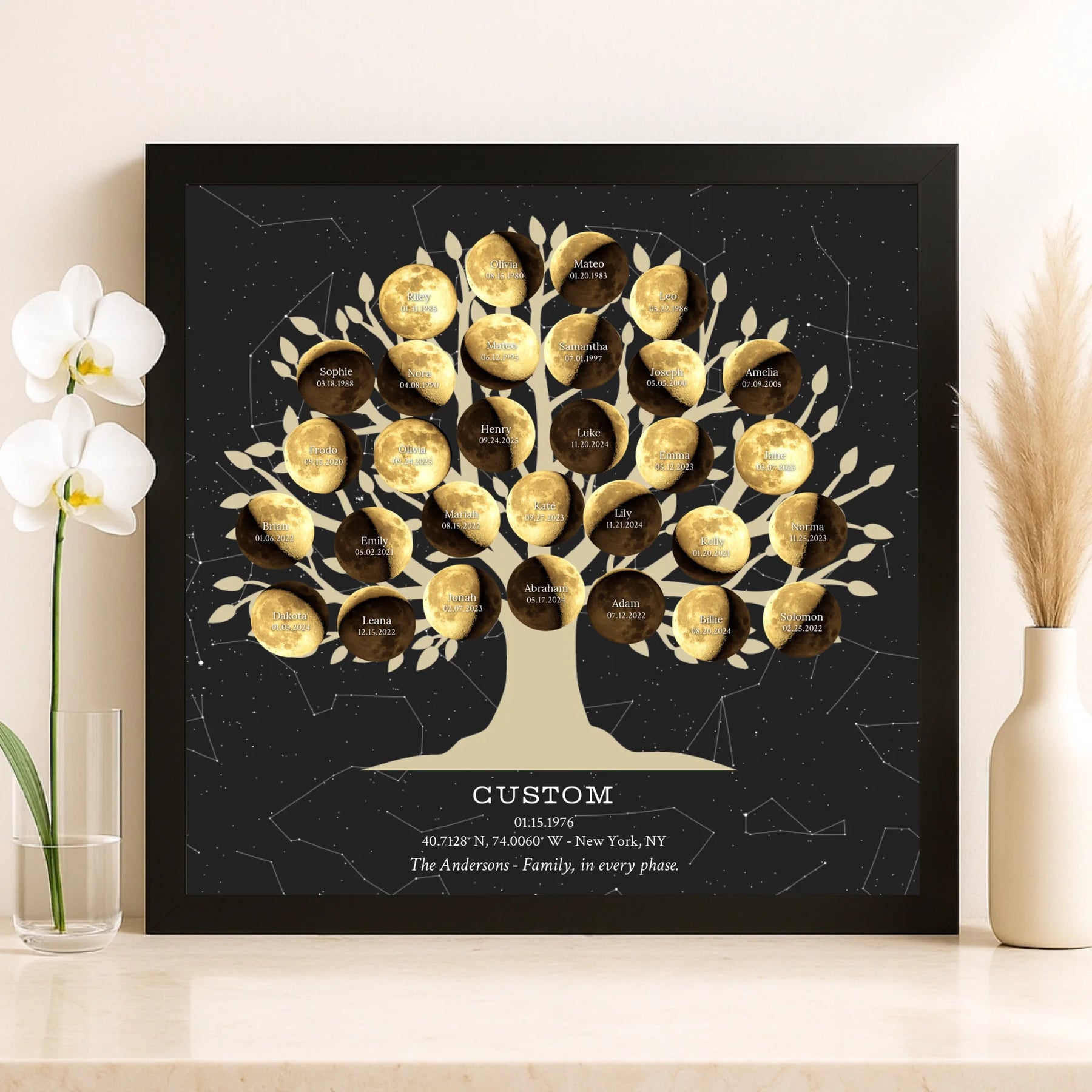 Custom Golden Moon Phase Family Tree Wall Art – A Celestial Tribute to Family