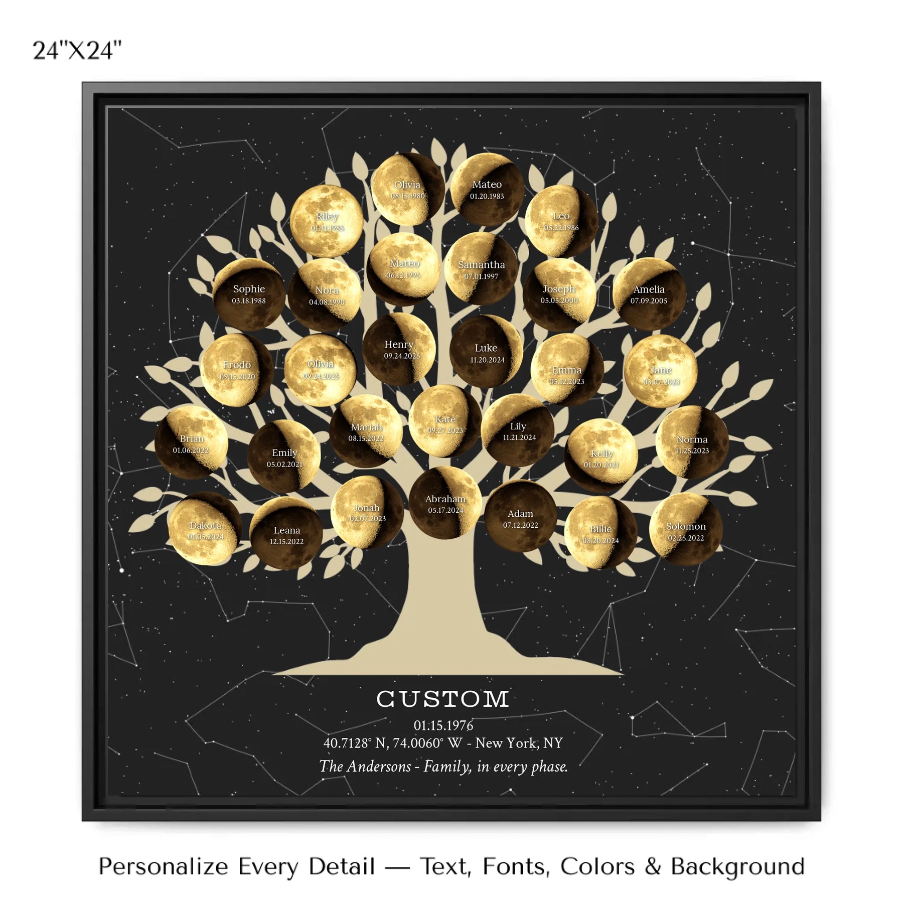 At the center is a golden champagne tree, branching outward with real moon phases. Add between 2 and 30 moons to represent your loved ones. Each moon is based on the actual phase of the moon on their birthdate and location. One larger moon at the tree’s base honors a beloved matriarch or patriarch, anchoring the family’s lunar legacy.