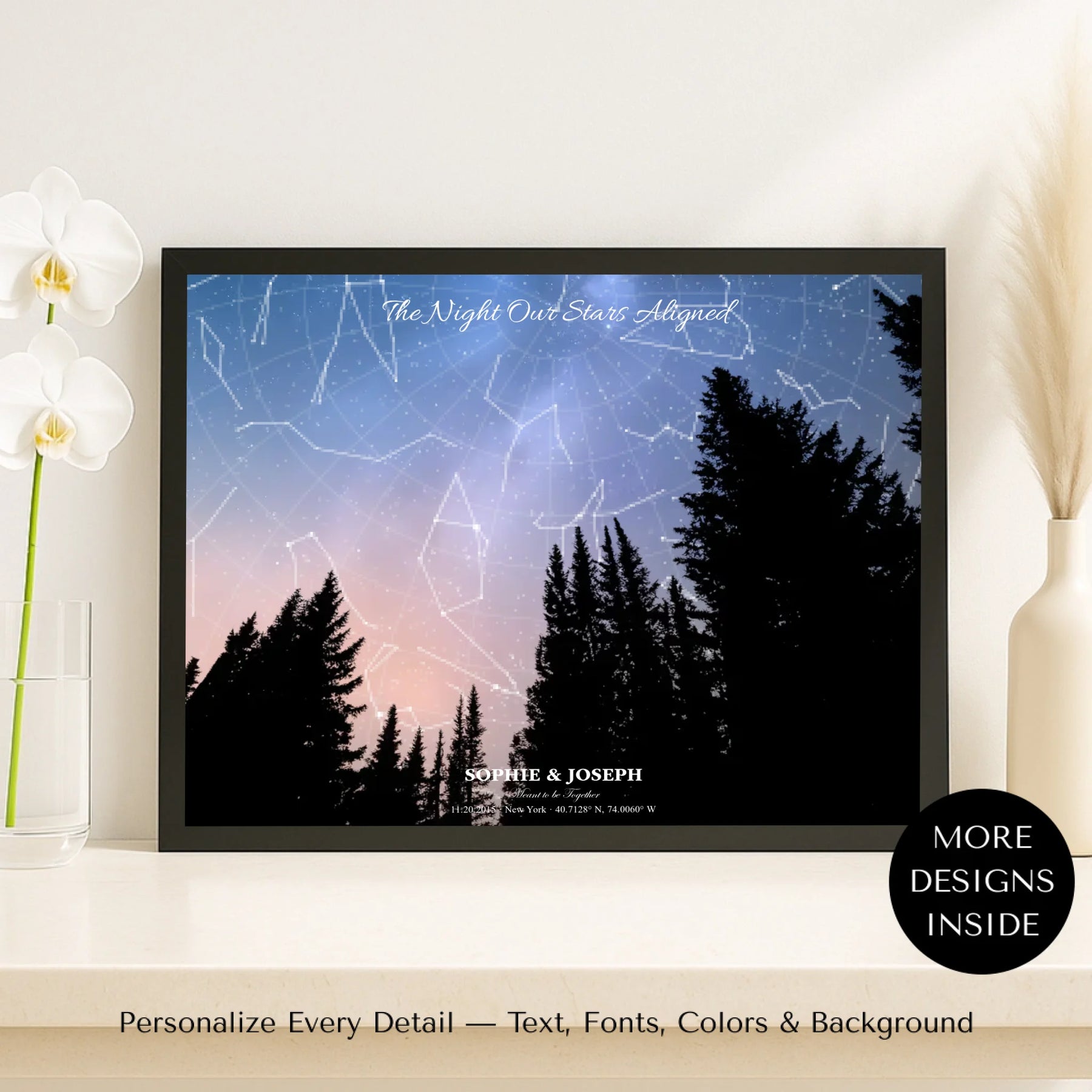 Personalize your artwork with a custom title, such as “The Night Our Stars Aligned” or “Where It All Began.” Add names (Line 1), a personal message (Line 2), and a footer line with your choice of date, quote, coordinates, or city.