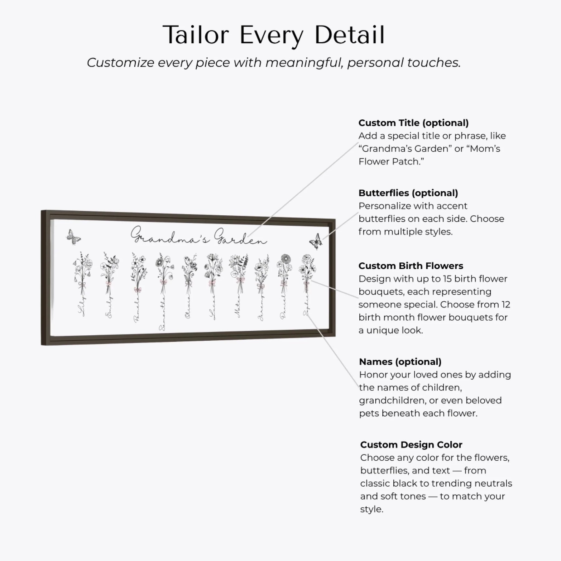 Design every part of your custom coquette birth flower wall art to suit your story and style.