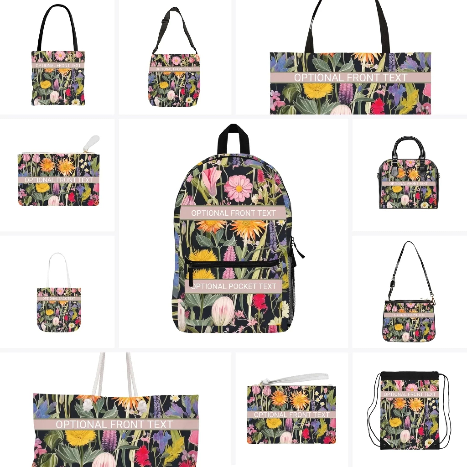Make it yours by choosing from four stunning floral designs or opting for solid color sections for the front, back, and pocket (for backpacks). Add an optional horizontal stripe with or without a border, and personalize it further by adding your own text in a variety of fonts and colors. These Boho Floral Bags allows you to express your unique style effortlessly.