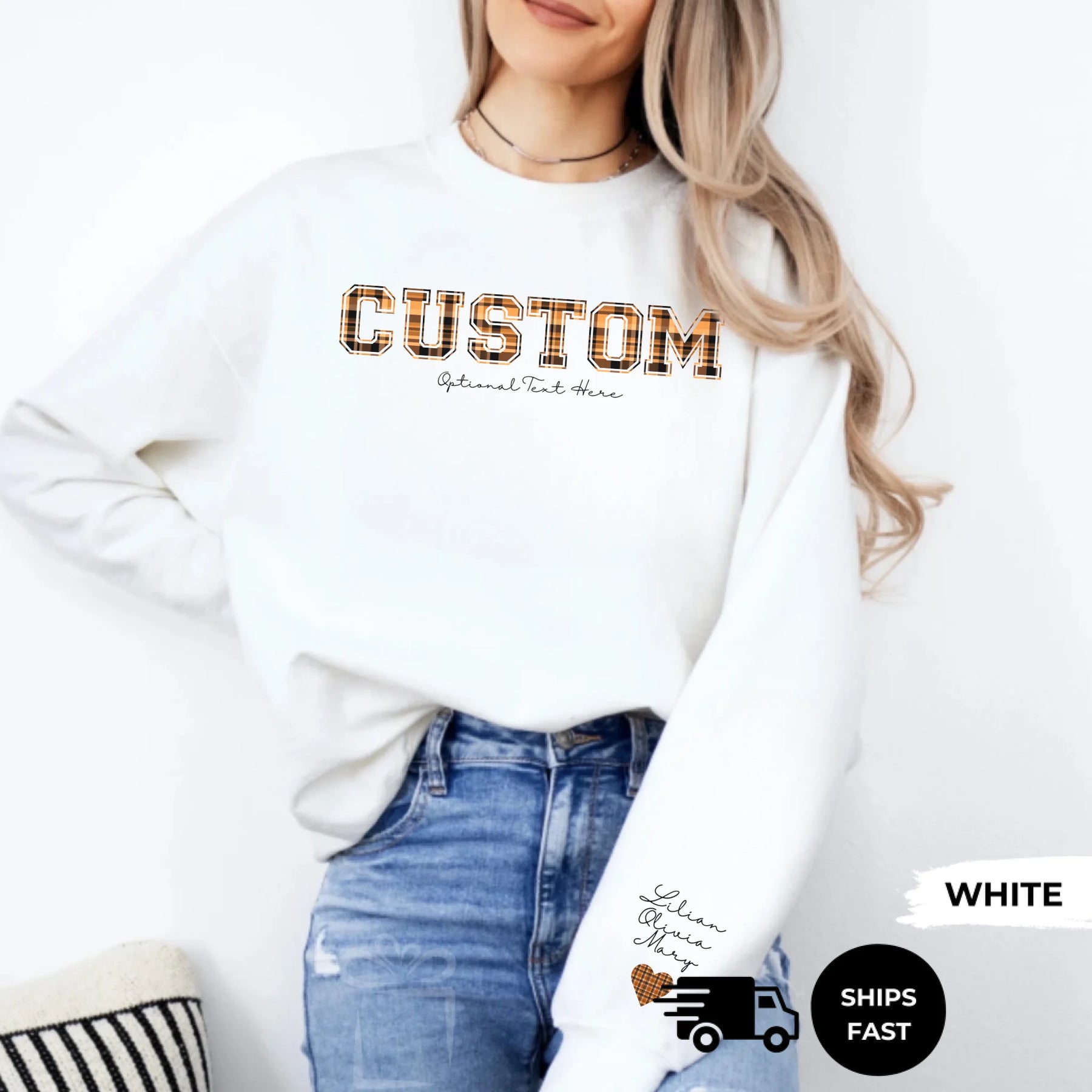 Celebrate cozy season in style with the Custom Name Sweatshirt & Hoodie – Autumn Plaid Varsity Letters – ART-SWT805.8 by ARTFULANE. Designed for comfort and personality, this custom pullover features bold varsity-style lettering filled with a warm autumn plaid pattern, perfect for fall and beyond.