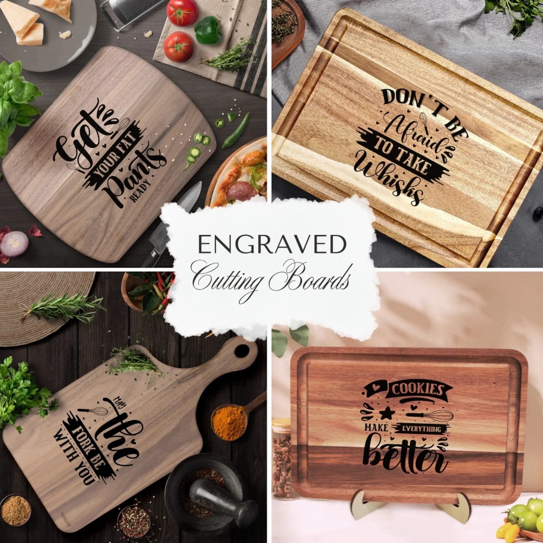From “Don’t Be Afraid to Take Whisks” to “Cookies Make Everything Better” and “May the Fork Be With You”, every board adds charm and personality to your kitchen décor.