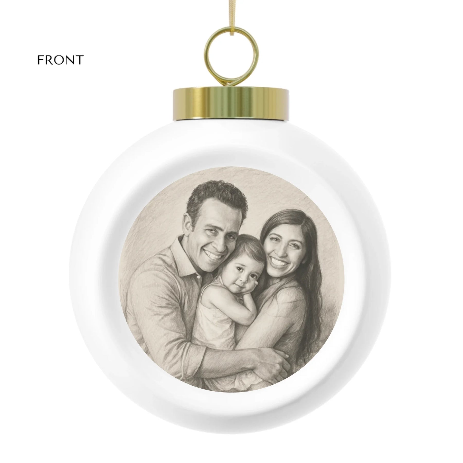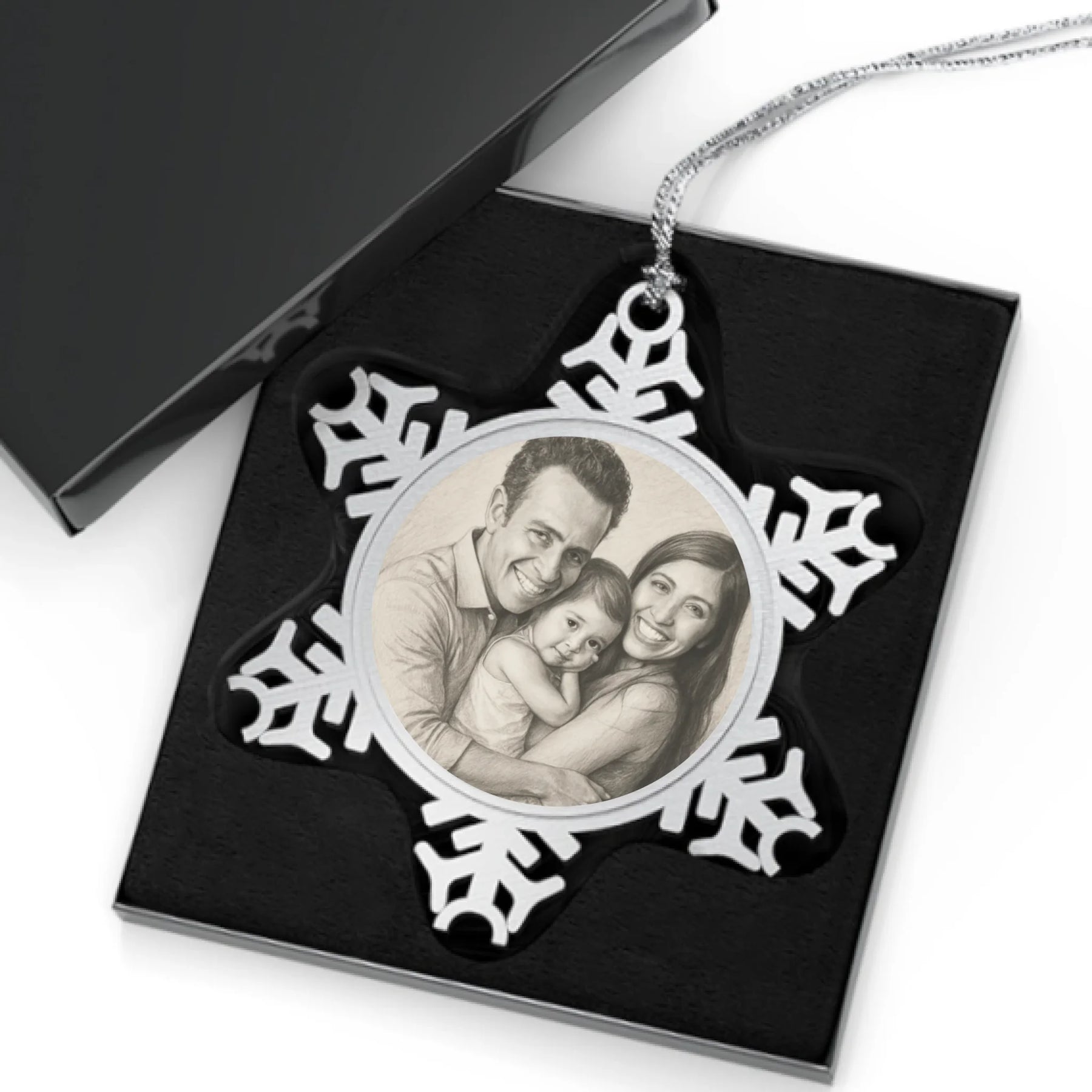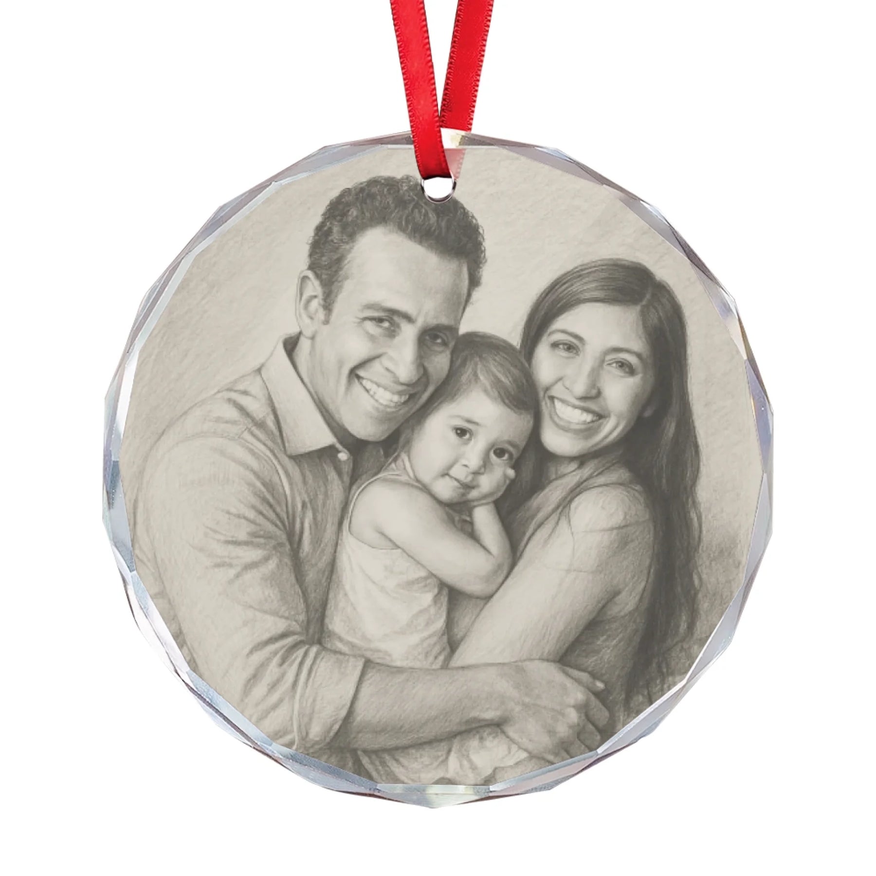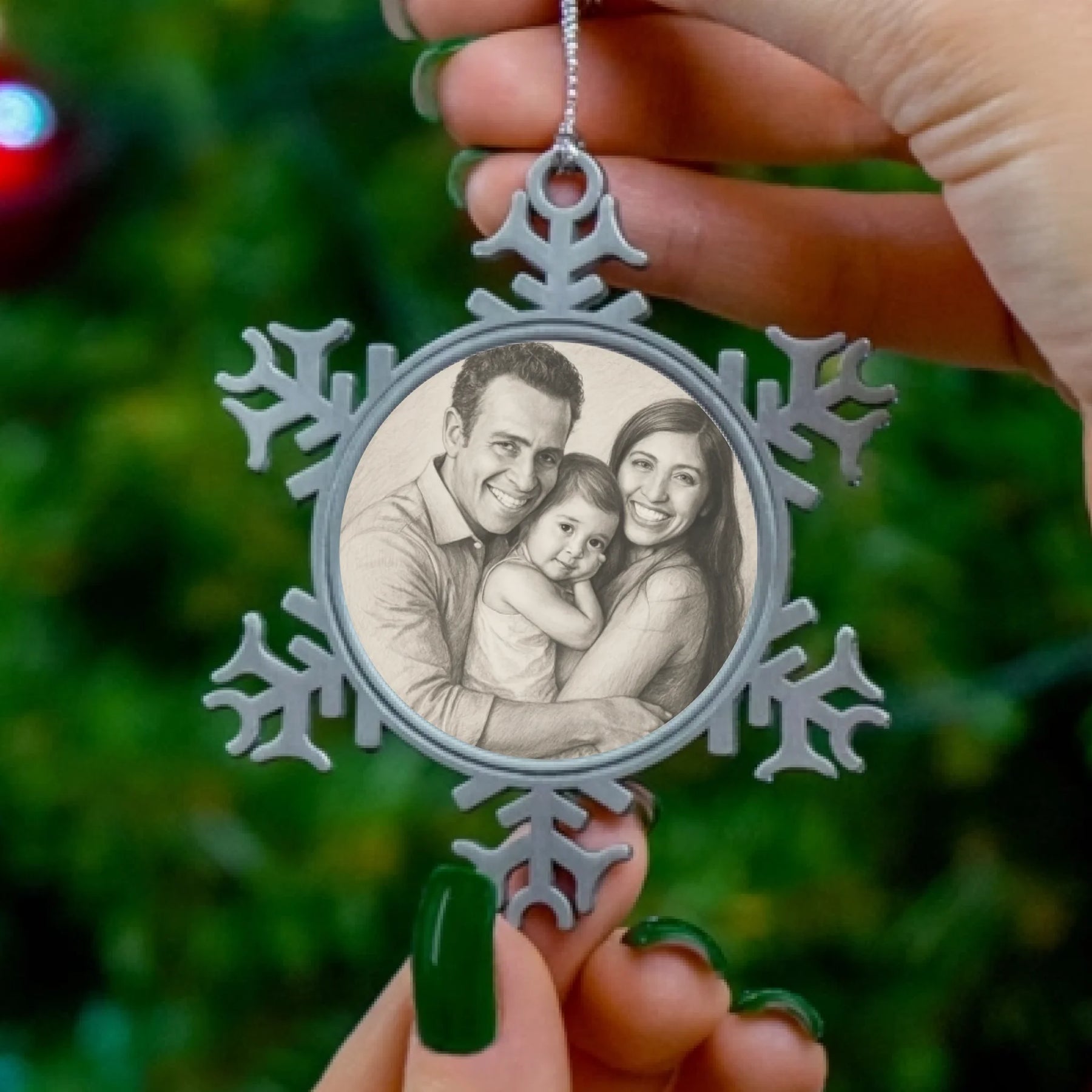 Capture a meaningful moment with this pencil sketch ornament designed from your favorite photo. Each ornament features a hand-rendered pencil sketch style that highlights fine details and emotional expression. Choose from ceramic, glass, or a pewter snowflake design to match your holiday décor. Ceramic and glass styles are available in circle or heart shapes for added personalization.