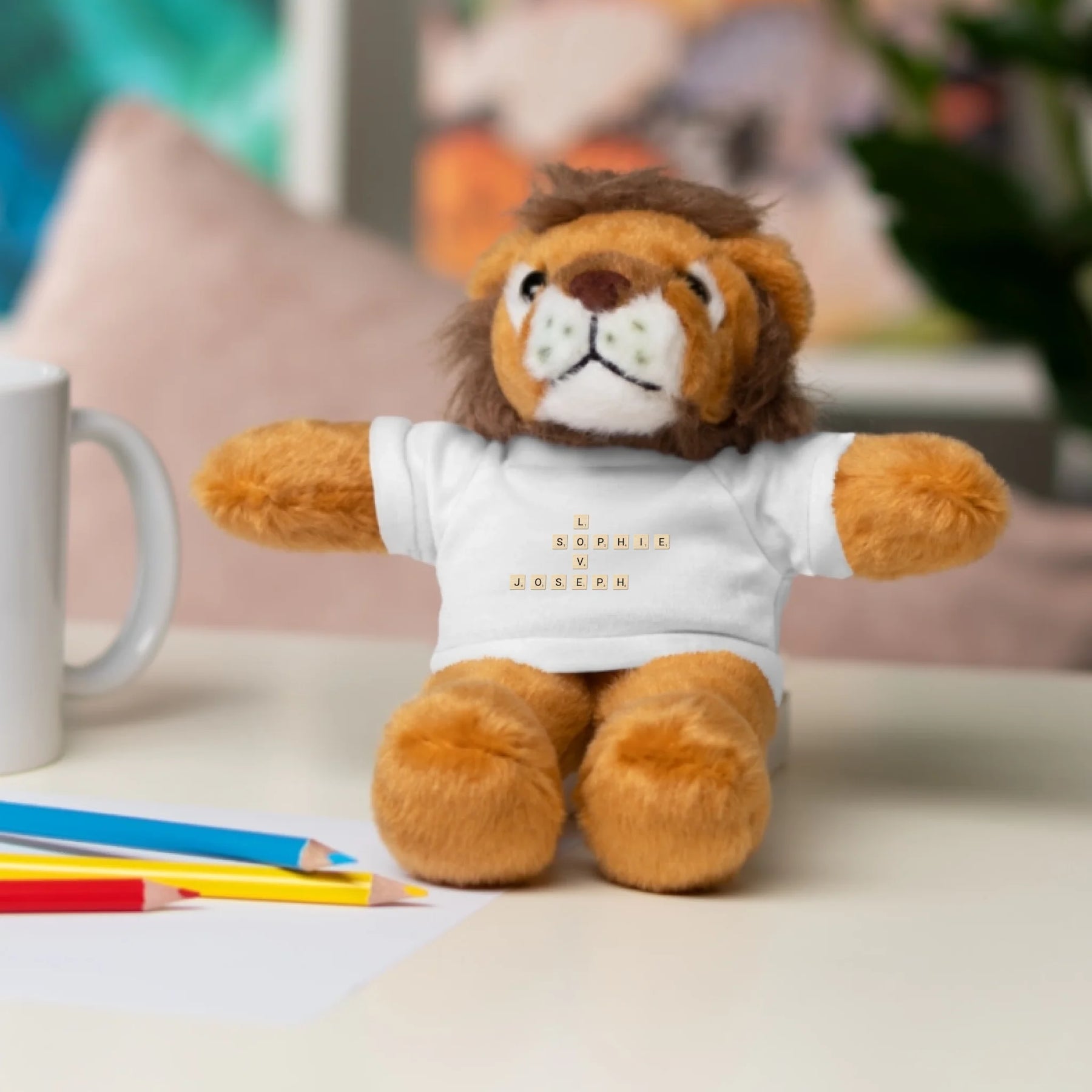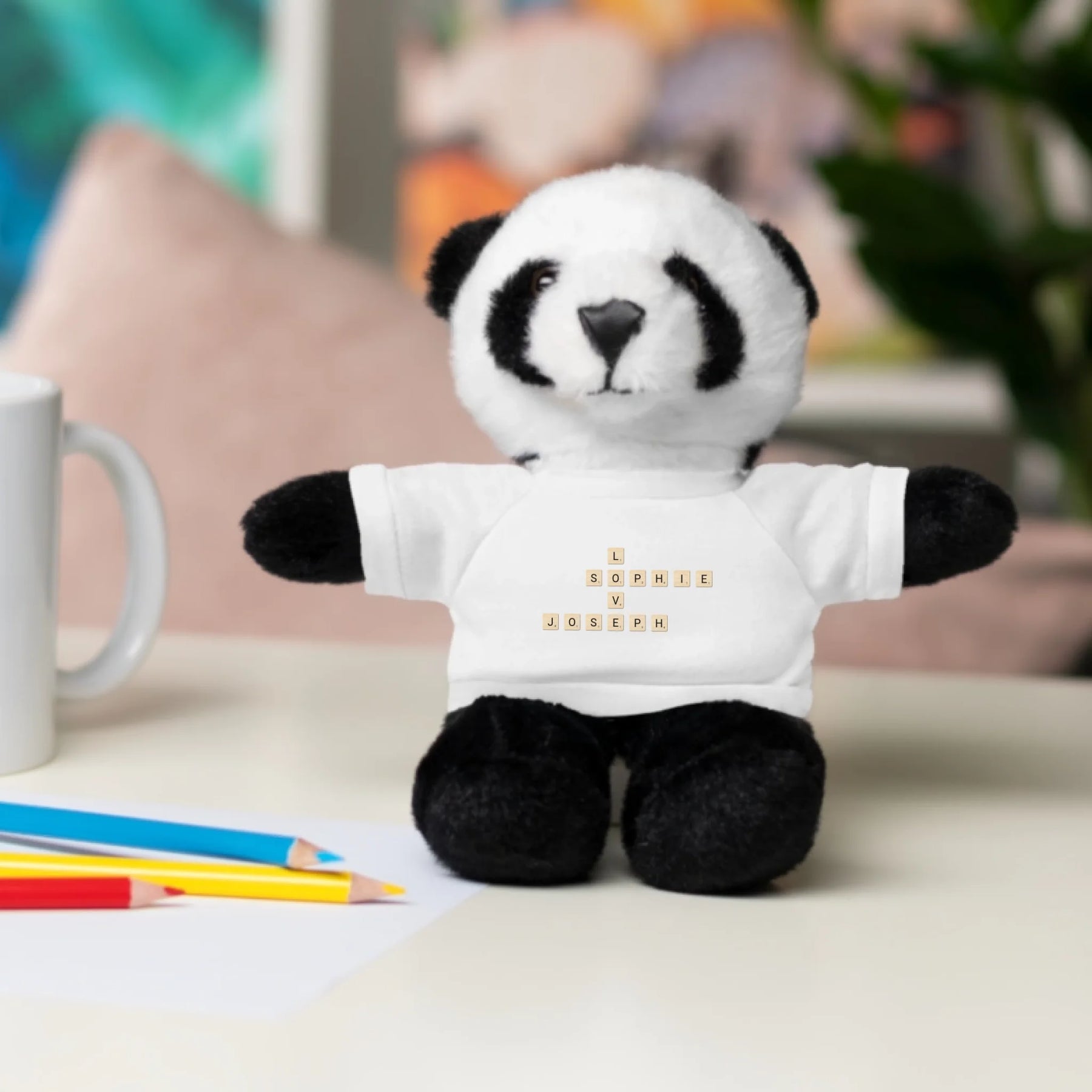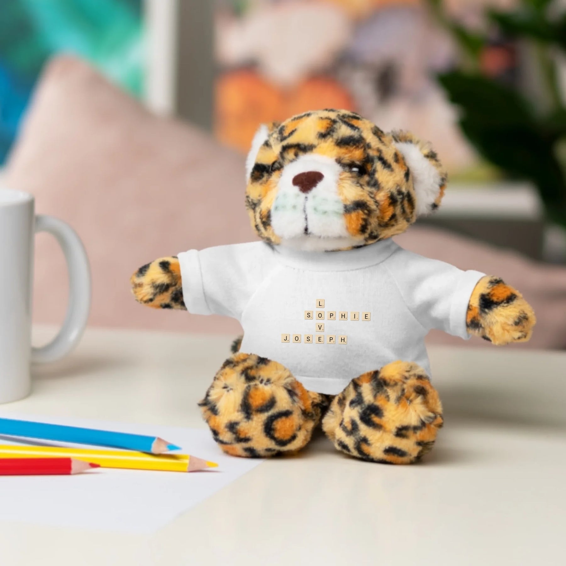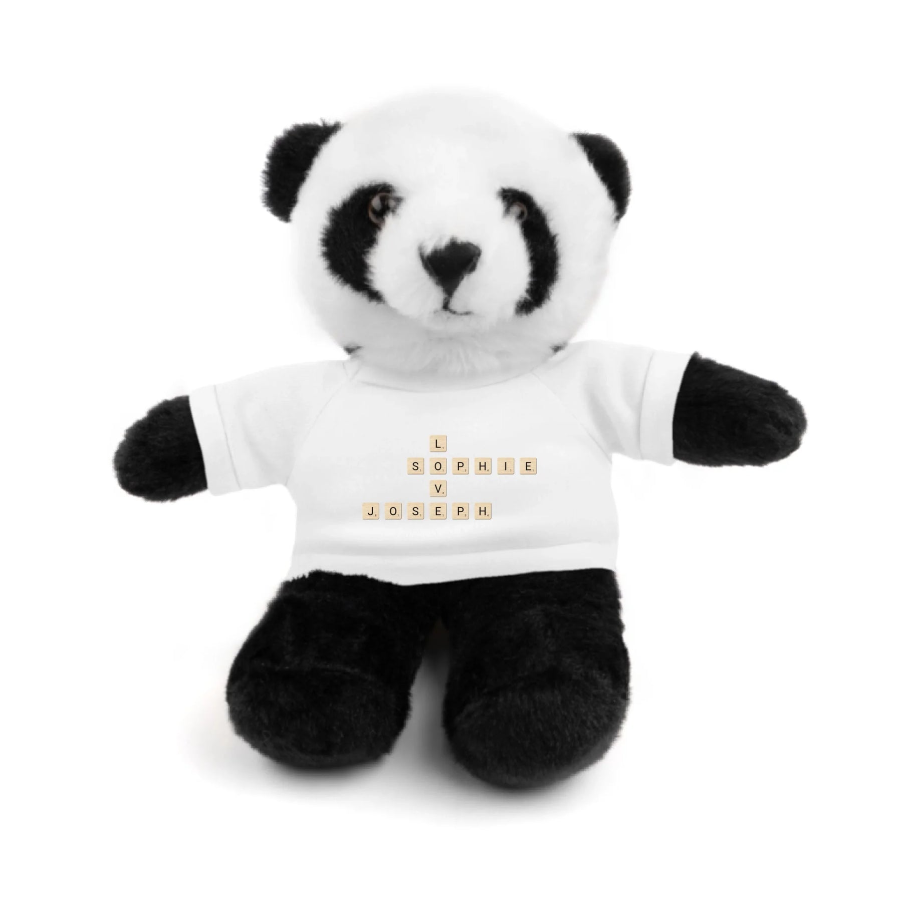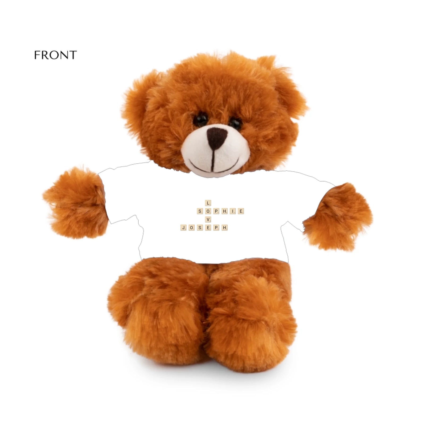 Each plush comes with a white t-shirt printed with your custom word tile design. Customers can choose any names, initials, or words, and we’ll arrange them in a crossword-style pattern. You can personalize the layout, font color, and tile style to create a look that perfectly suits your message.