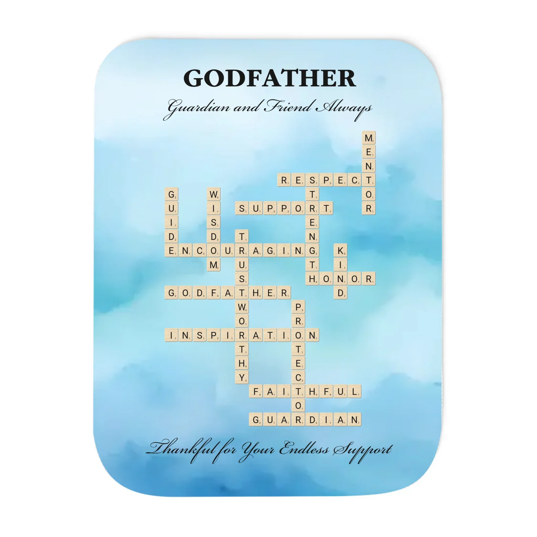Celebra el vínculo con tu padrino con esta manta personalizada de palabras para padrinos . Elige entre "Palabras seleccionadas para padrinos ", una plantilla cuidadosamente diseñada con palabras cuidadosamente seleccionadas que reflejan la fuerza, la guía y el amor de un padrino, o crea tu propio diseño de palabras para un diseño totalmente personalizado con hasta 100 palabras o nombres. Personaliza todo, desde los colores de las palabras hasta los colores de la fuente, el color de fondo, el título, el subtítulo y el pie de página, creando un regalo único para el padrino que ha sido una influencia constante en tu vida.