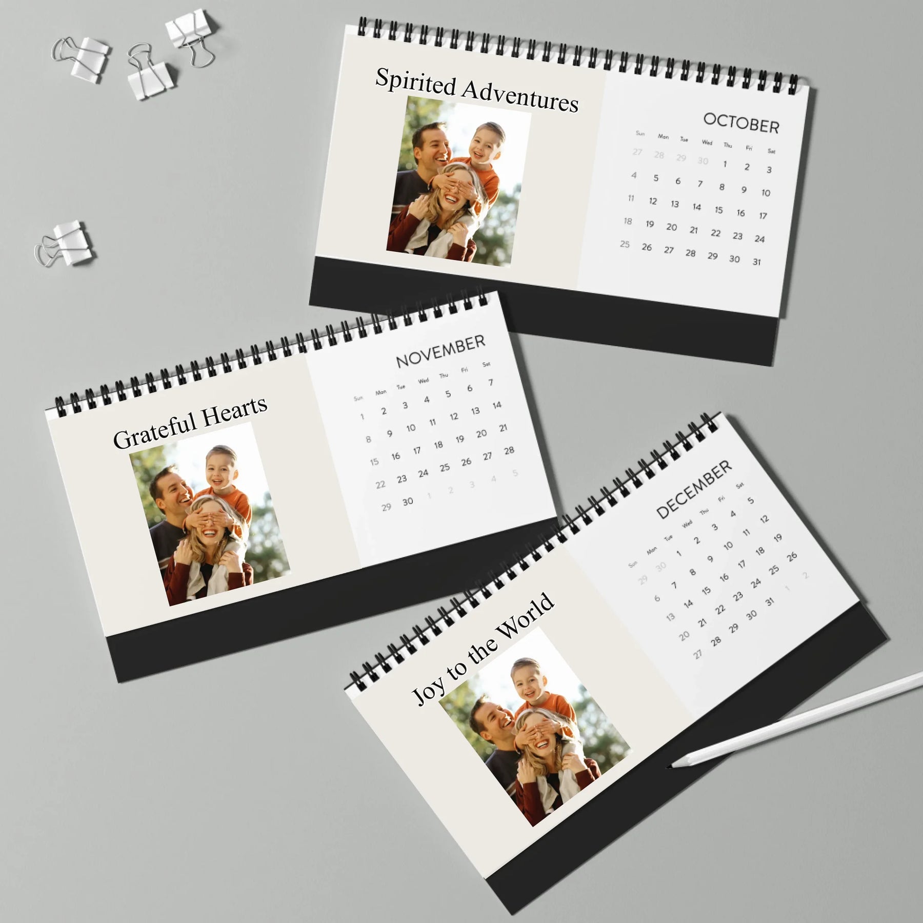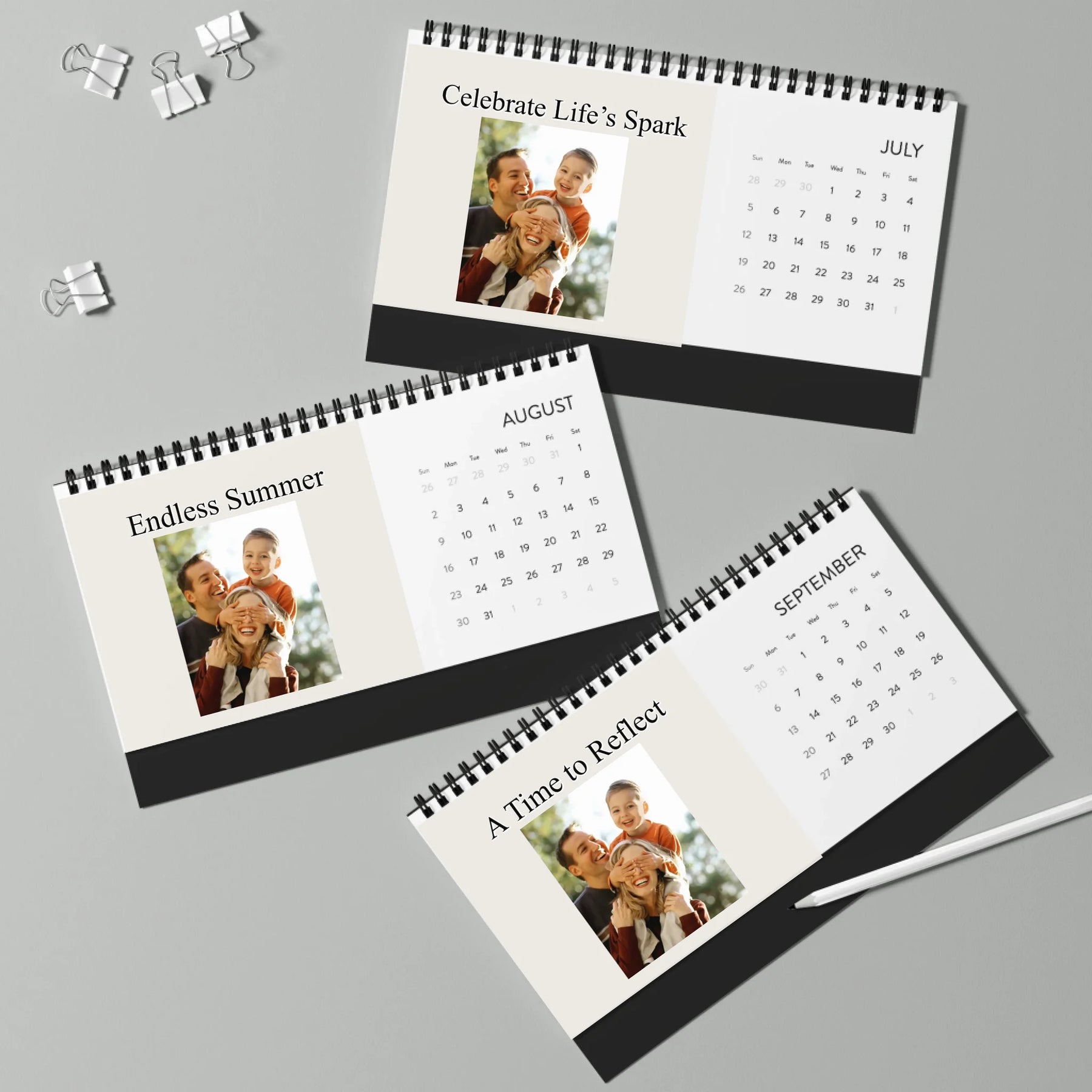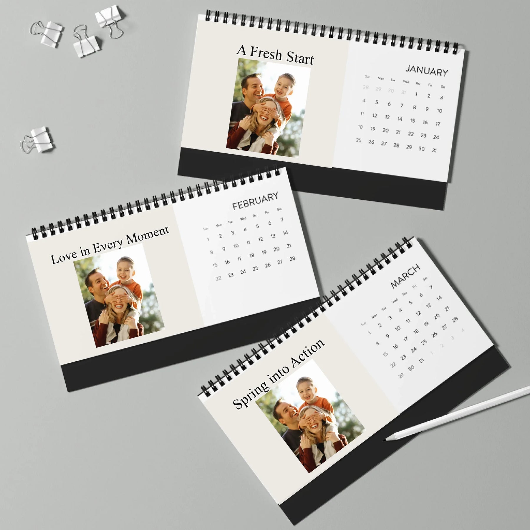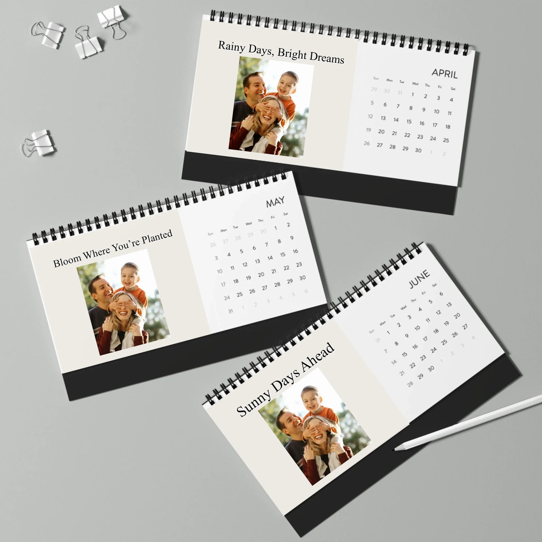 Manténgase organizado e inspirado con el Calendario de Escritorio Personalizado 2025 de ARTFULANE. Diseñado para un espacio de trabajo sofisticado o una oficina en casa, este calendario mide 25 x 13 cm y está elaborado con papel de alta calidad de 250 g/m² con acabado mate para mayor durabilidad y un tacto premium. Personalícelo con sus propios diseños, fotos o frases motivacionales y disfrute de páginas vibrantes a todo color que alegrarán cada mes. Cada calendario incluye una encuadernación en espiral metálica negra y un reverso de cartón para mayor estabilidad, convirtiéndolo en un elegante complemento para cualquier escritorio.