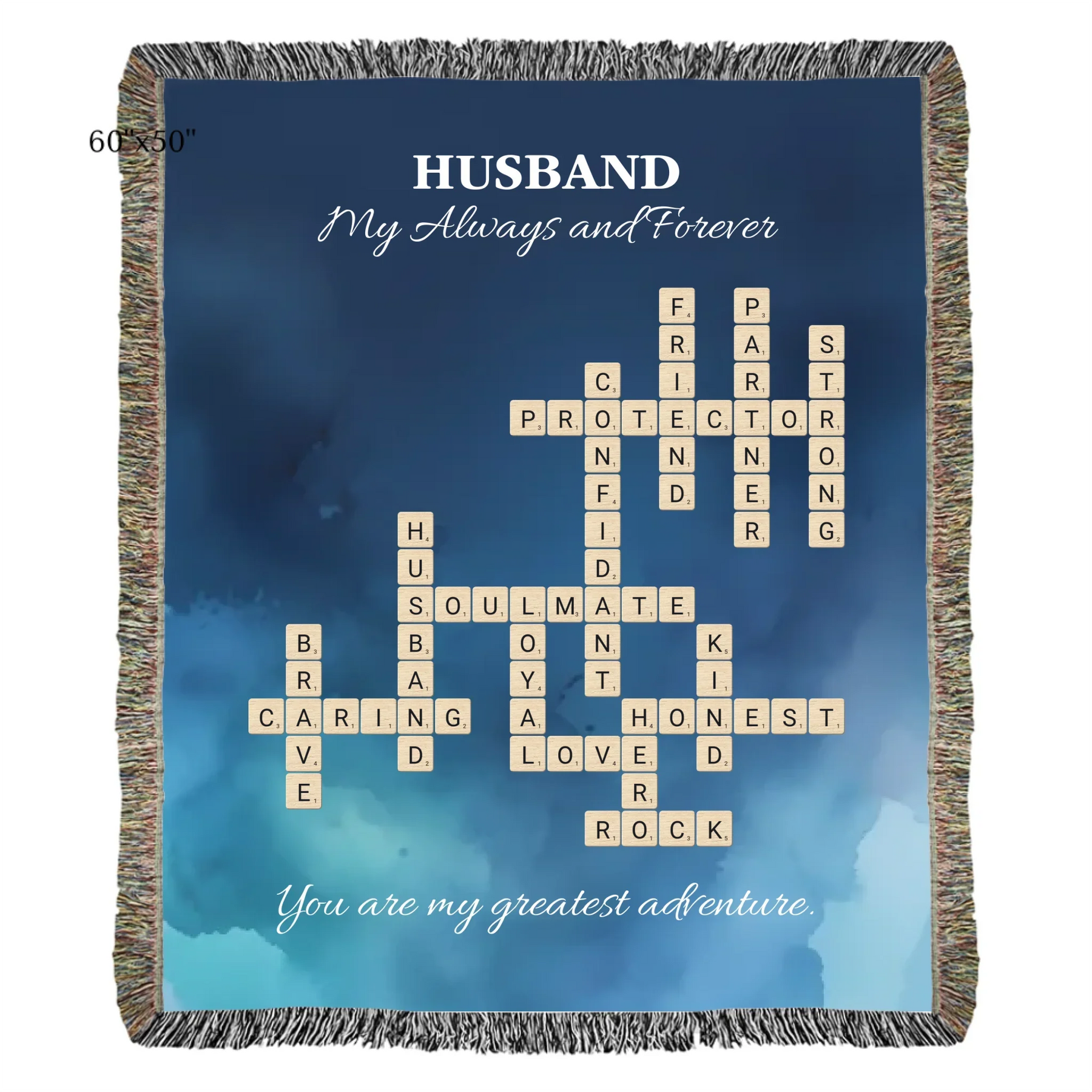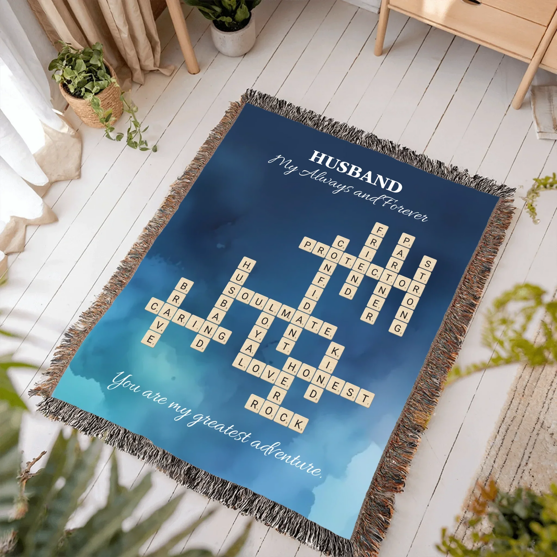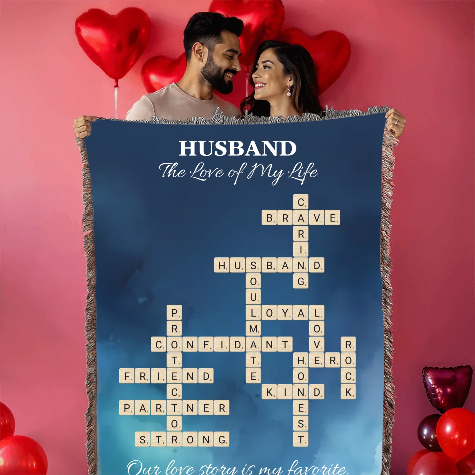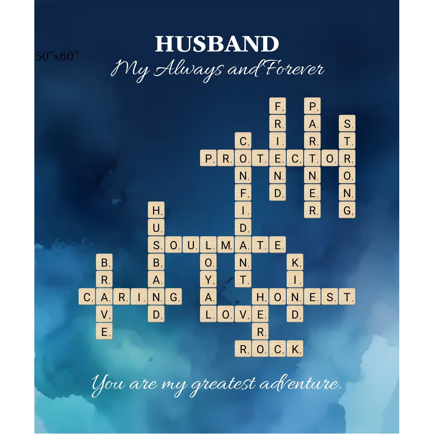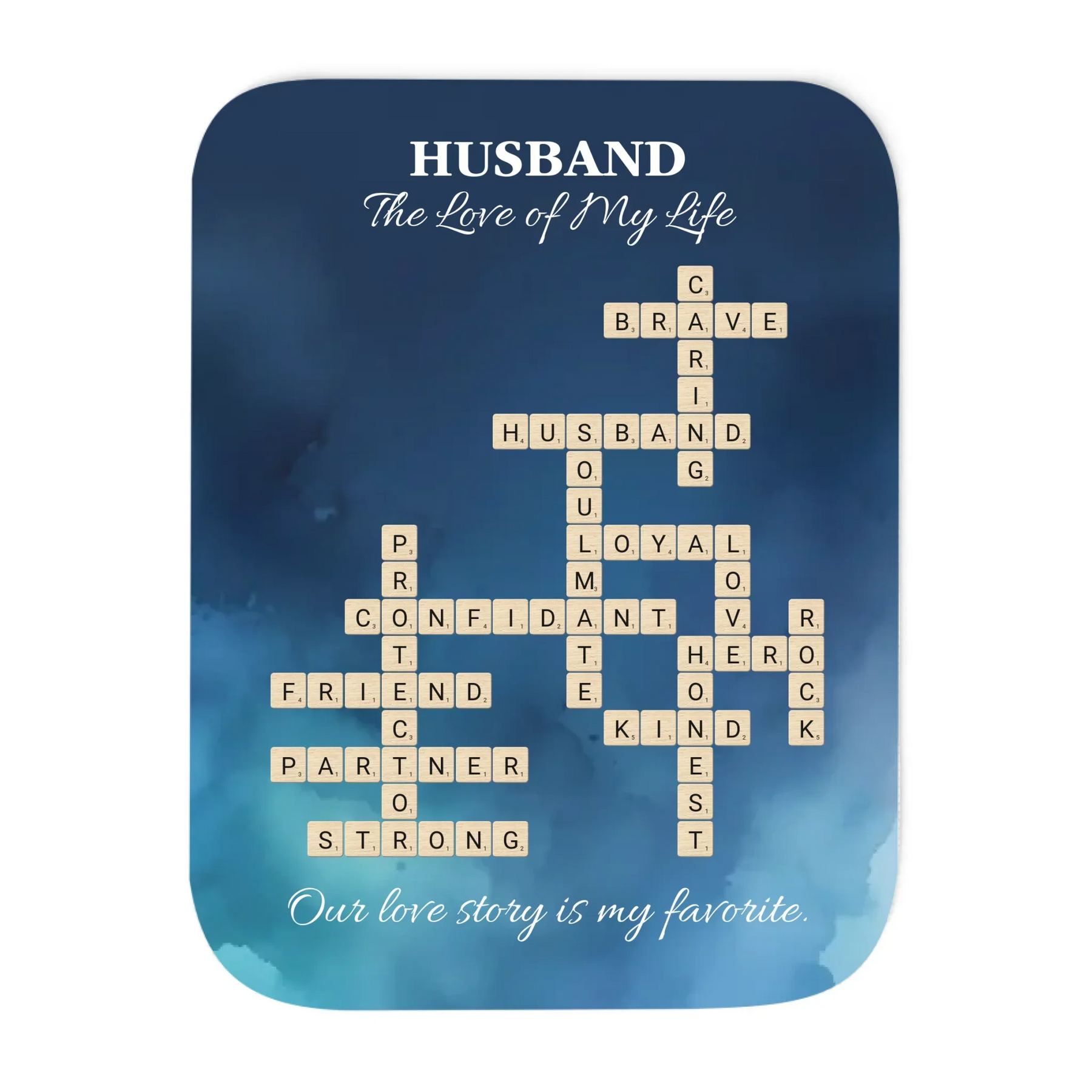 Envuelve a tu esposo en la calidez de tus palabras con esta manta personalizada con palabras para él, diseñada para celebrarlo y honrarlo de la manera más significativa. Esta manta premium es una forma especial de recordarle tu amor y aprecio. Elige entre dos opciones de diseño personalizables: Palabras seleccionadas para él , un arreglo prediseñado de palabras que describen a tu esposo, o Crea tu propio arte de palabras , donde puedes seleccionar hasta 100 palabras o nombres para crear un crucigrama personalizado y único para su relación. Disponible en microfibra de terciopelo suave, acogedora sherpa y el clásico tejido de algodón, esta manta aporta comodidad y un mensaje sincero a cualquier habitación.