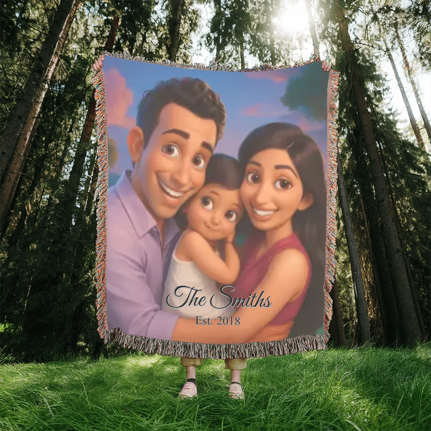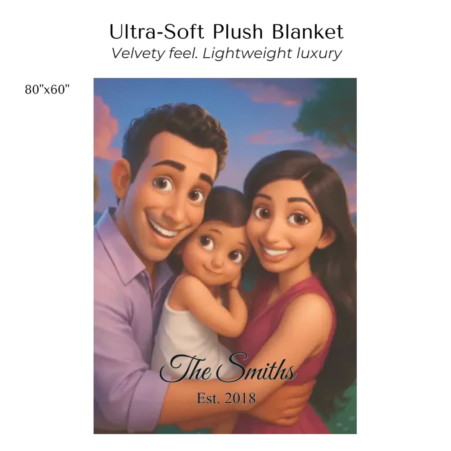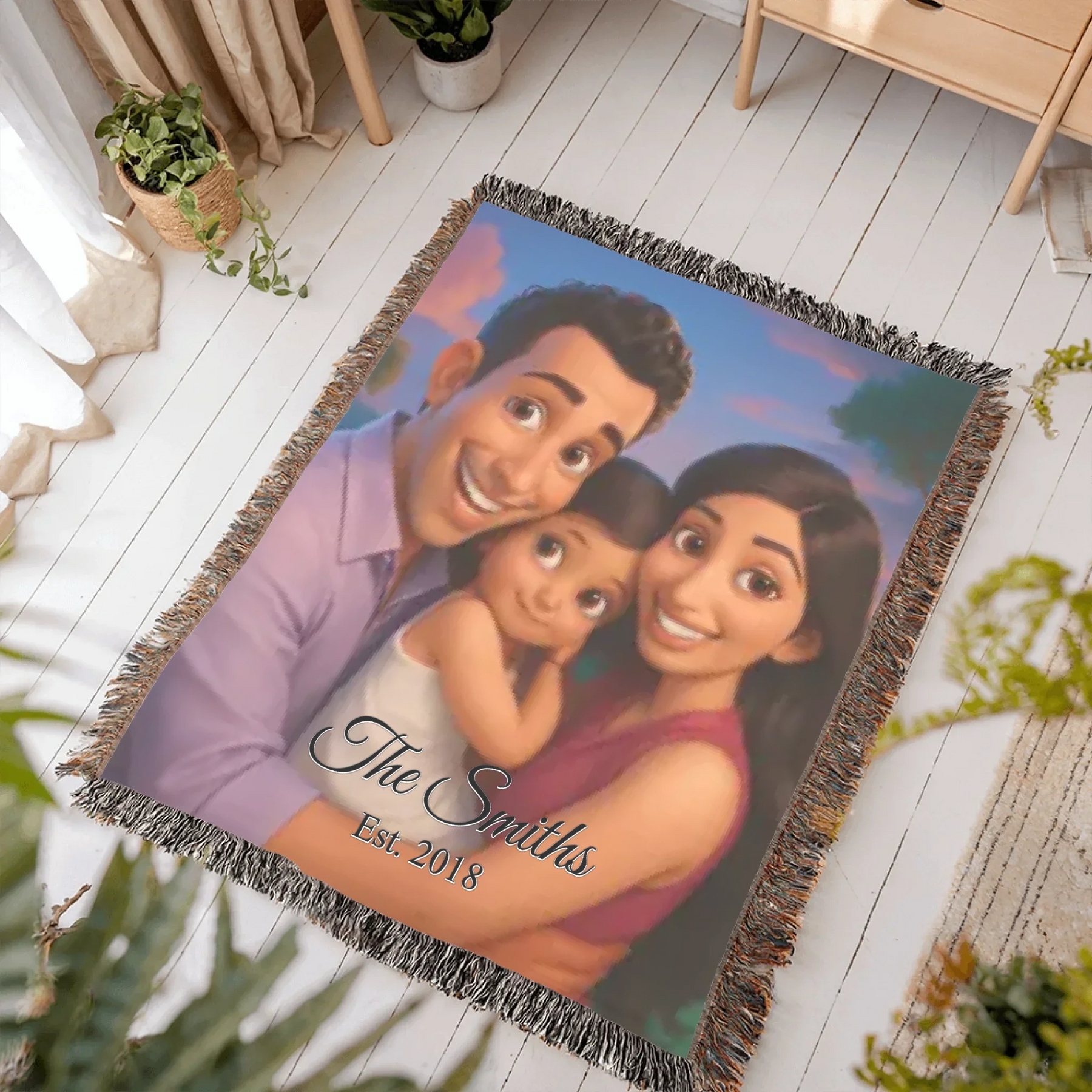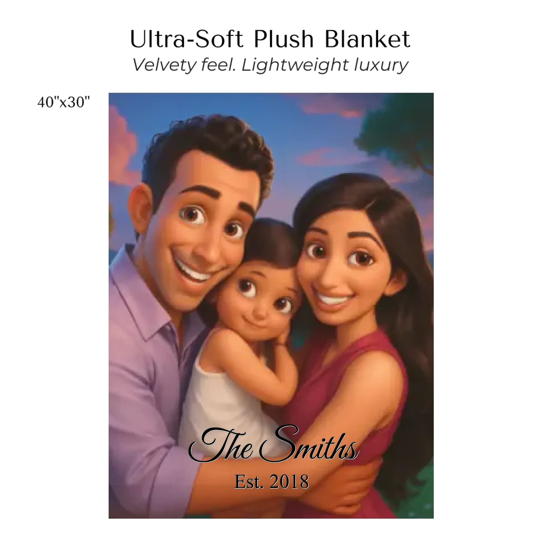 Custom Fairy-Tale Storybook Style Portrait Blanket – Plush, Sherpa & Woven Cotton Blankets