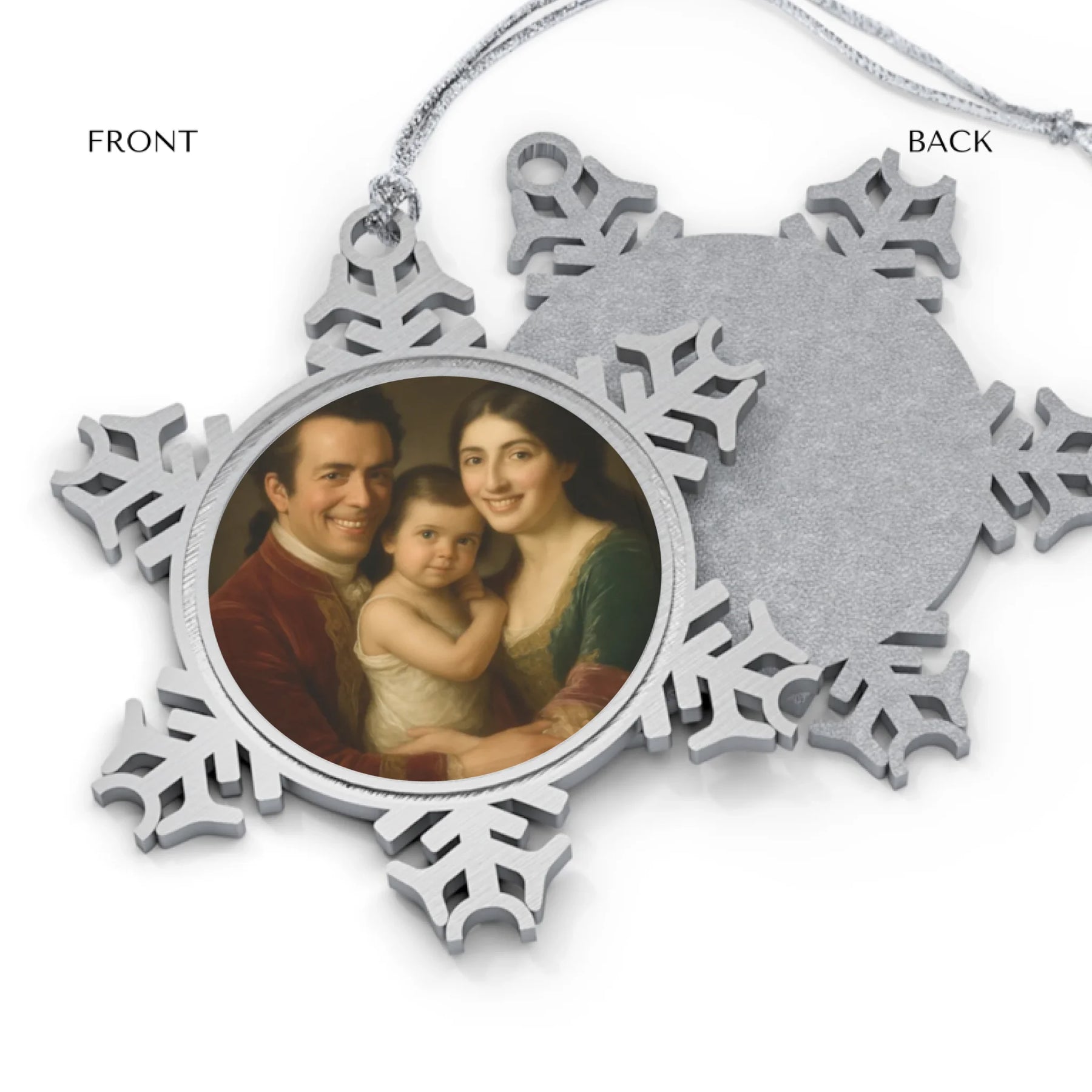 Celebrate timeless elegance with this royal portrait ornament. Each ornament features a historic, regal-inspired illustration, turning your photo into a majestic keepsake. Choose from ceramic, glass, or pewter snowflake materials. Ceramic and glass are available in circle or heart shapes, ideal for personalized designs.