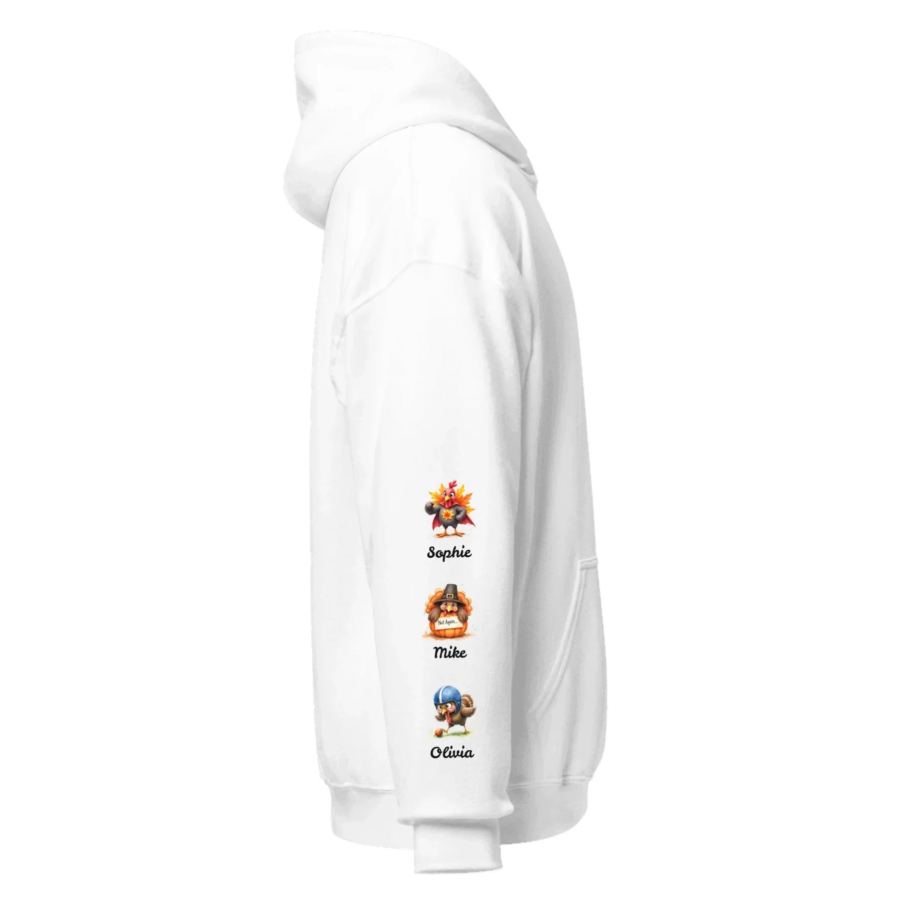 Personalize your sweatshirt or hoodie with optional turkey icons on either sleeve. Each turkey can include a name, with space for up to 7 names per sleeve. This creates a meaningful and custom Thanksgiving design that moms will love wearing.