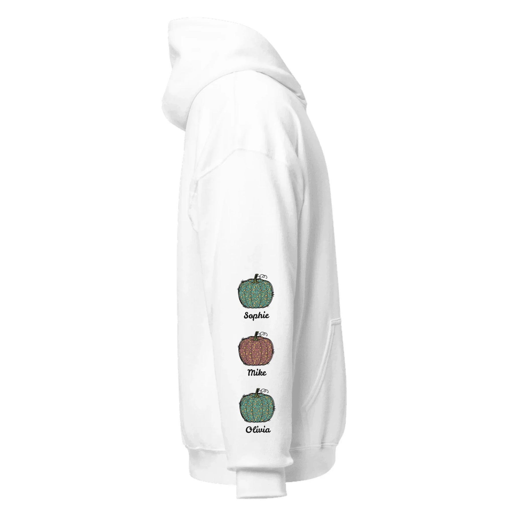 Customize your sweatshirt or hoodie with optional pumpkin icons on either sleeve. Each pumpkin can display a name, with room for up to 7 names per sleeve. This creates a heartwarming design that celebrates family in a fun autumn style.