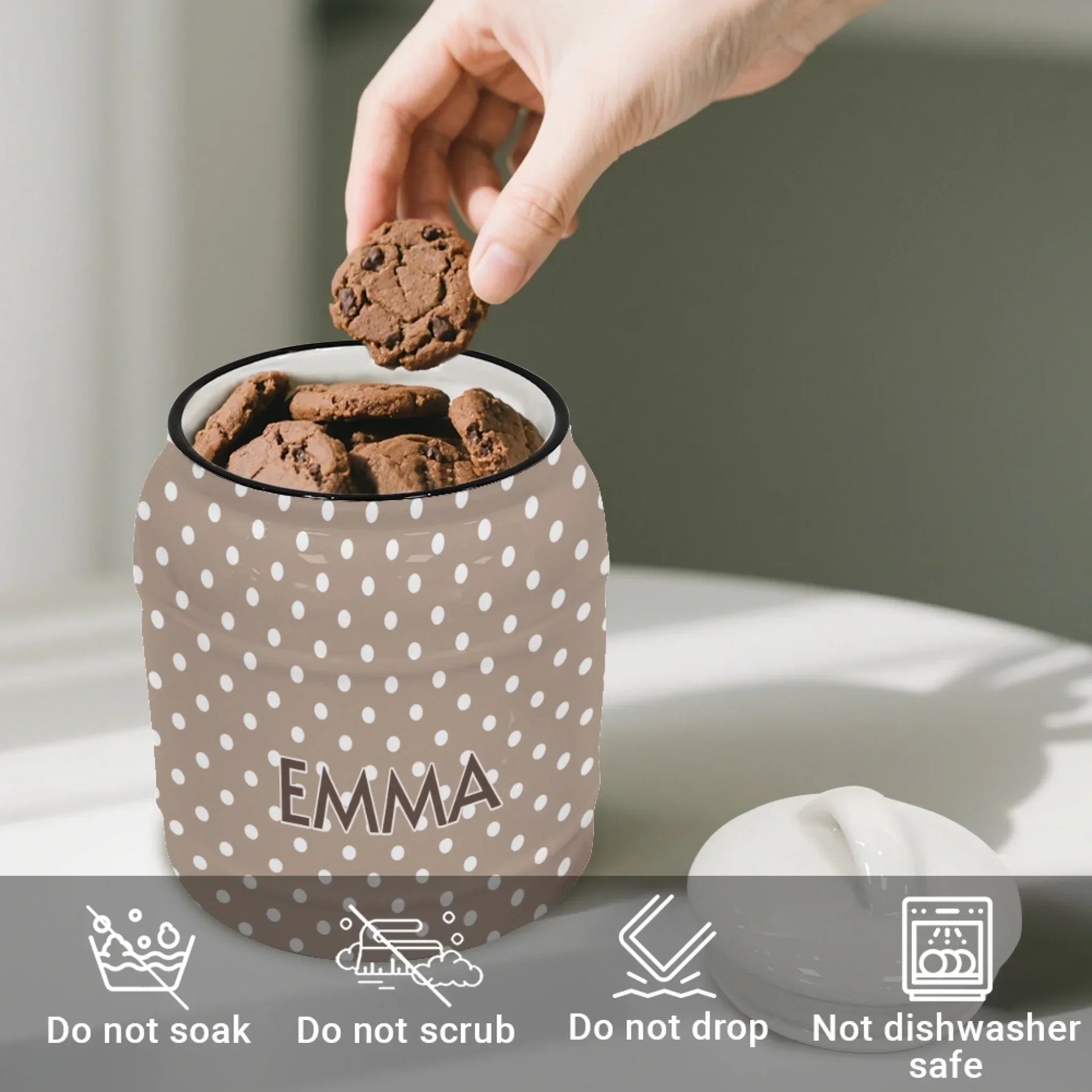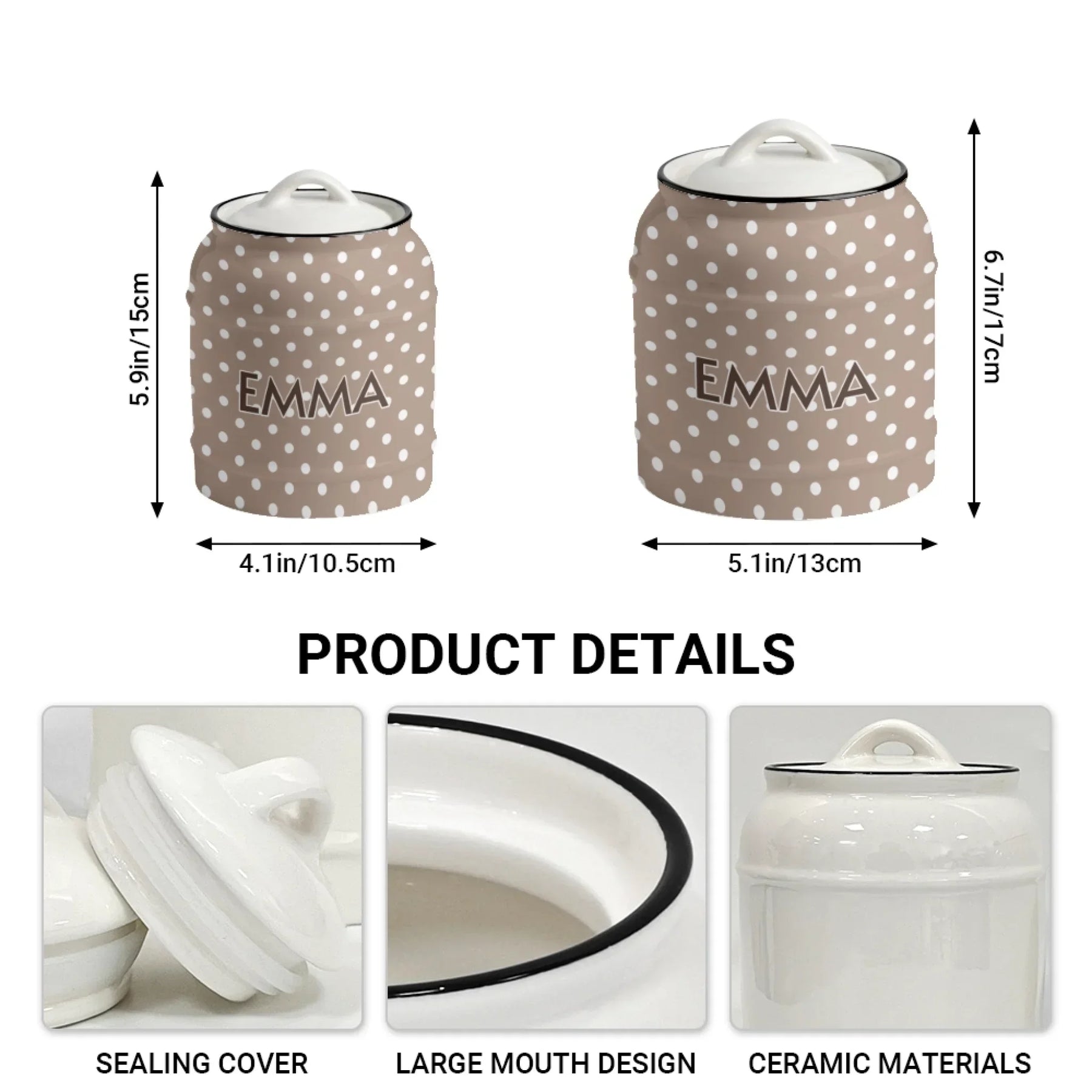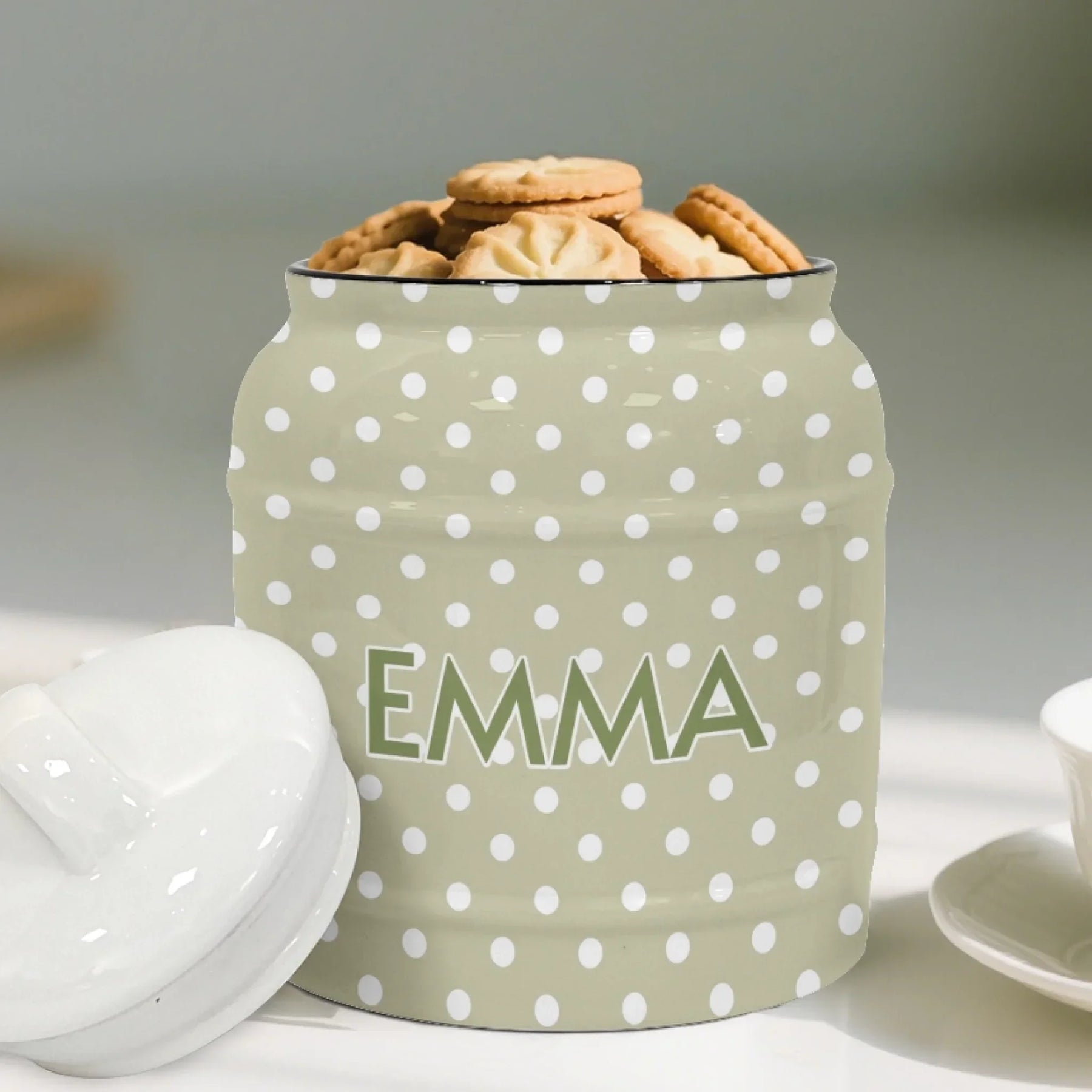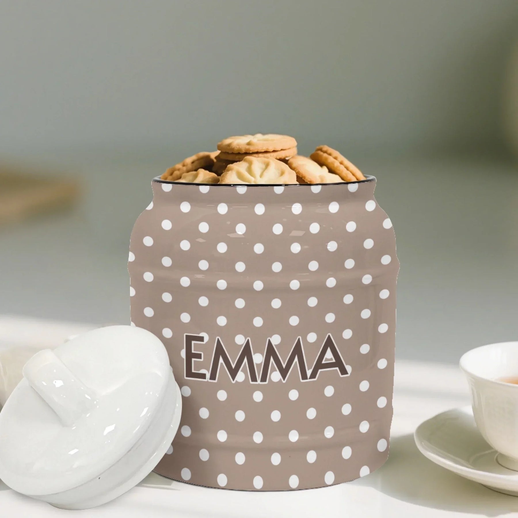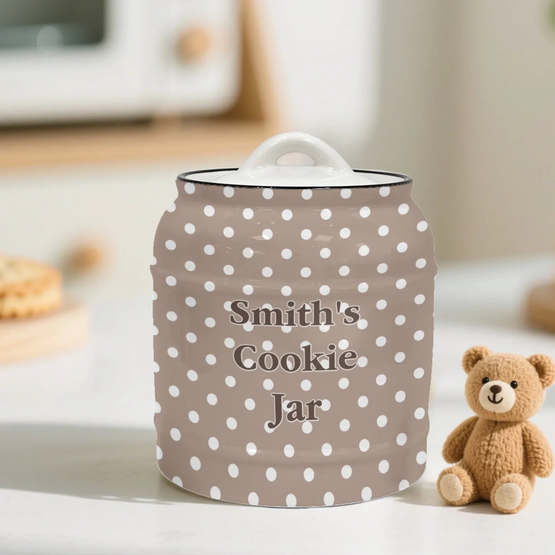 This Custom Boho Polka Dots Ceramic Cookie Jar – ART-CJR881.24 combines playful design, functional storage, and versatile personalization. It complements modern kitchens, supports everyday use, and serves as a striking decorative piece or gift.