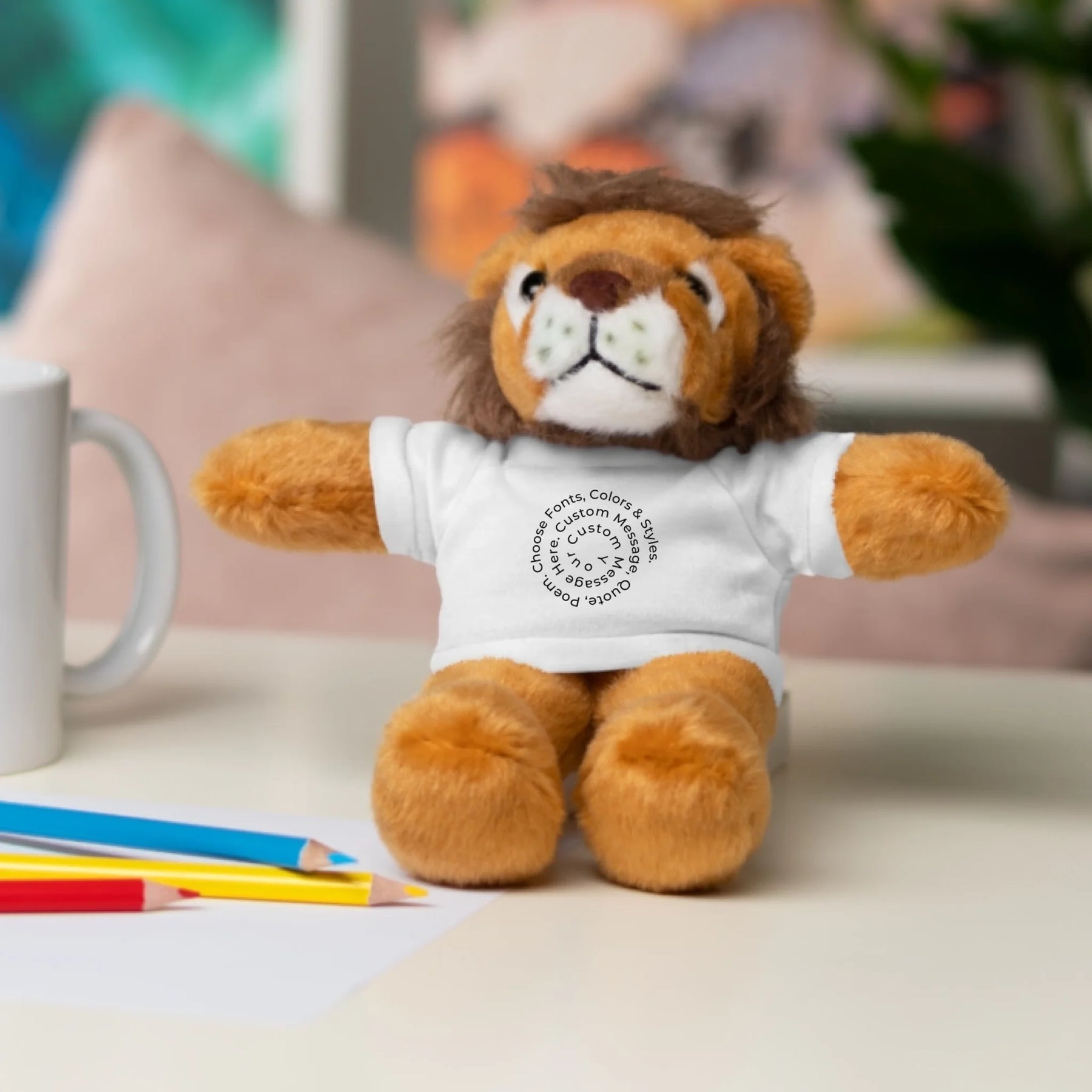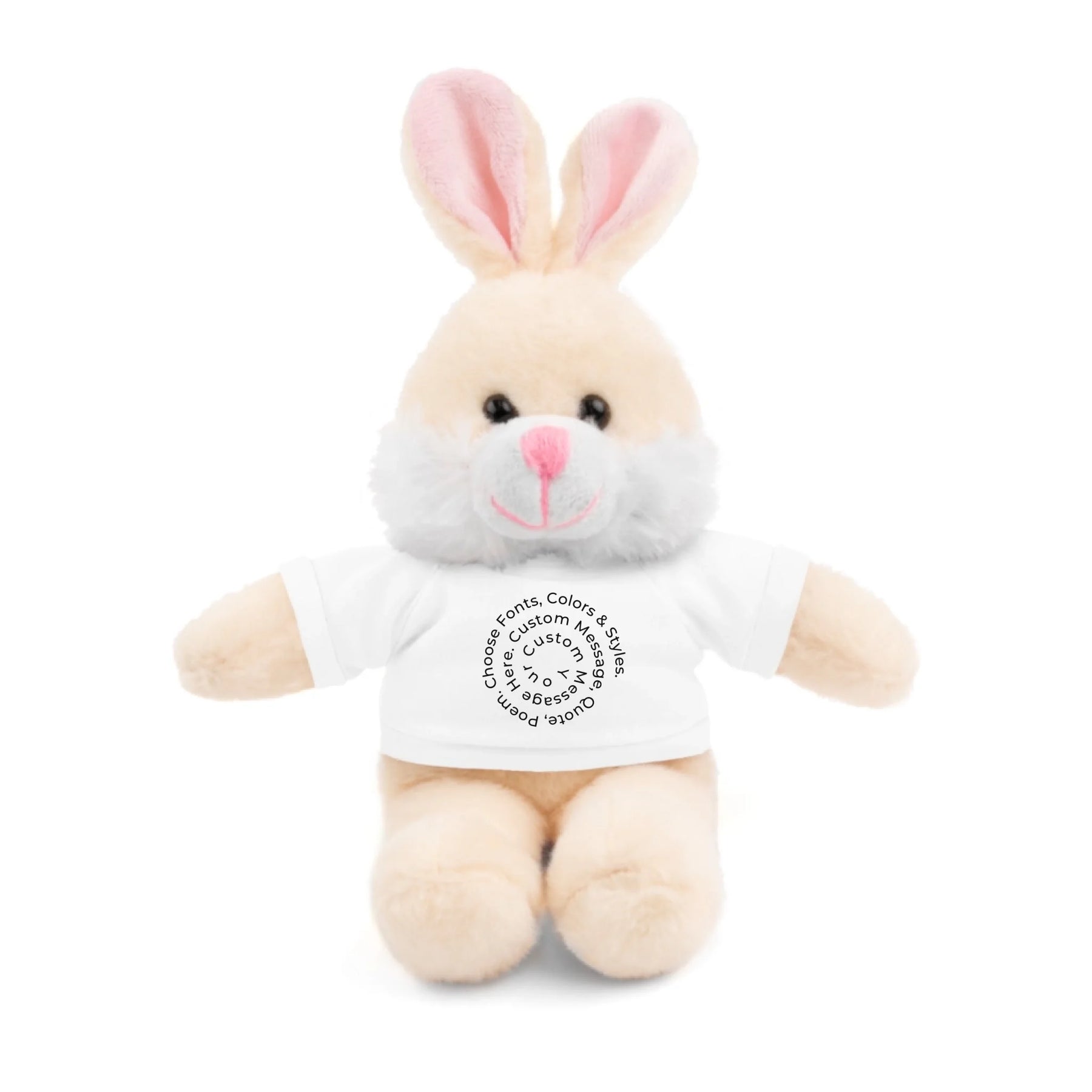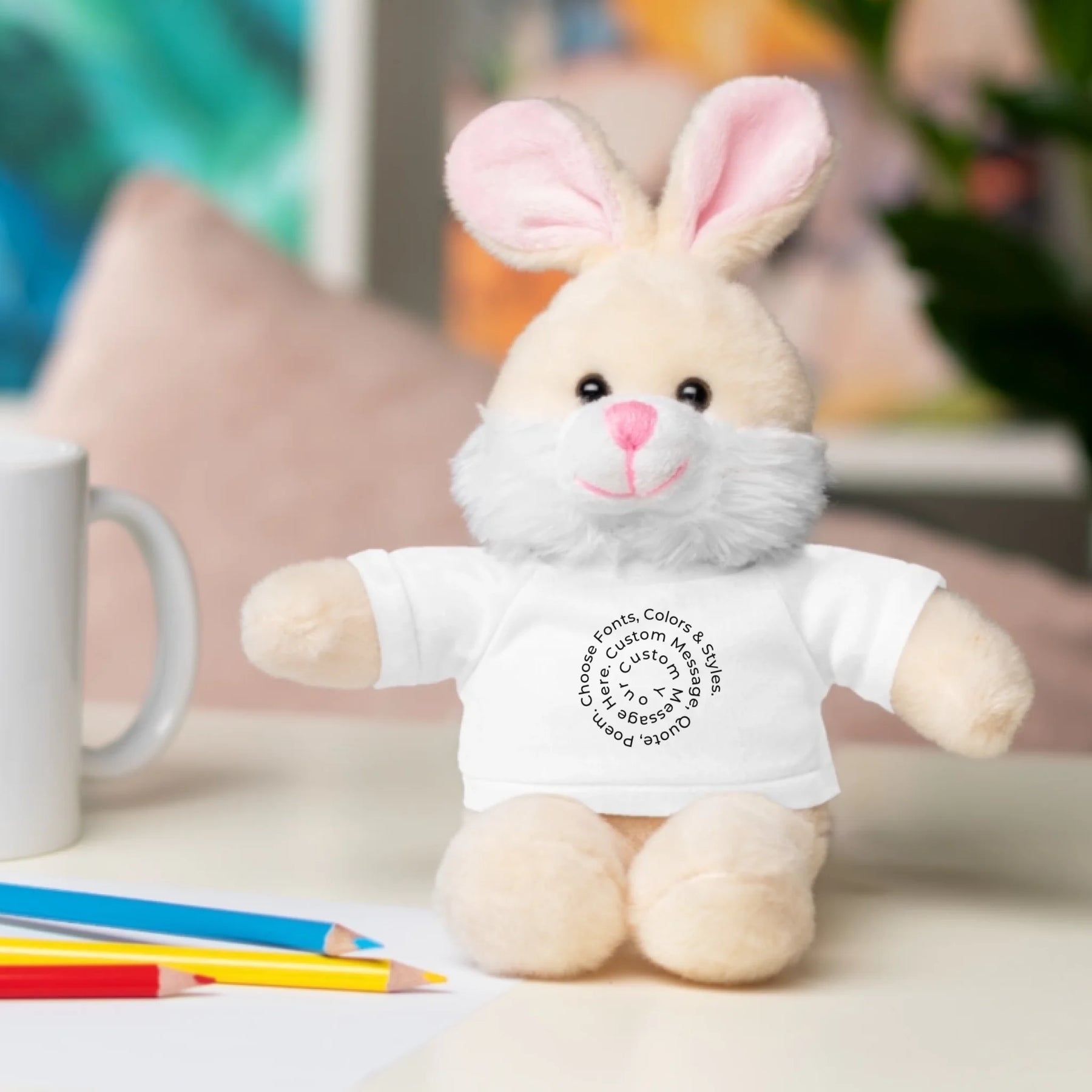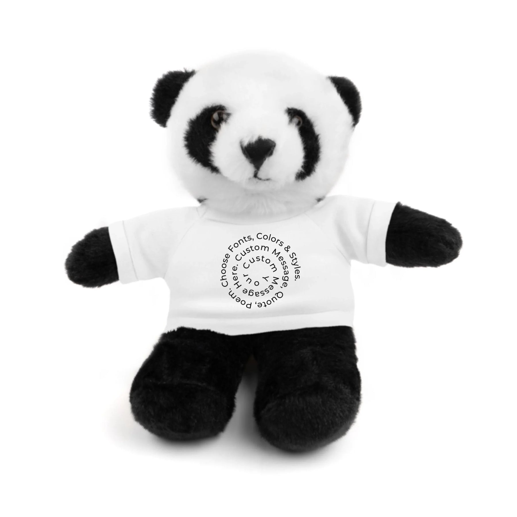 Each adorable stuffed animal features a soft t-shirt ready for your custom design. Personalize it with names, dates, short quotes, logos, or even creative extras like scrabble letter layouts, QR codes, Spotify song links, or photo prints. Choose from various font styles, text colors, and t-shirt shades to perfectly match your theme, mood, or occasion.