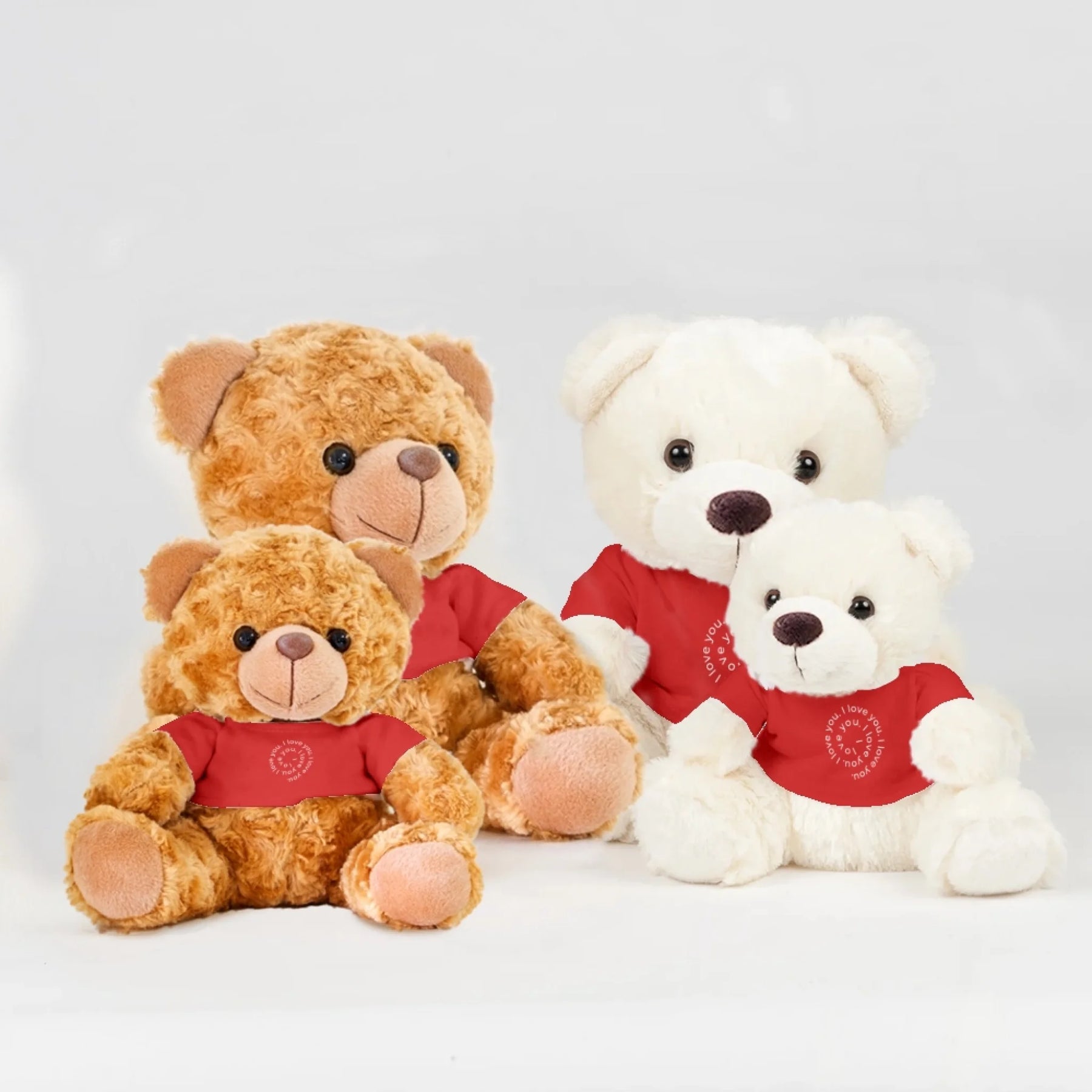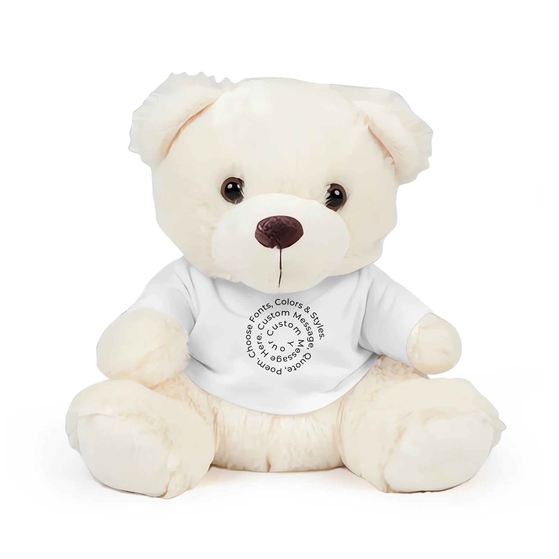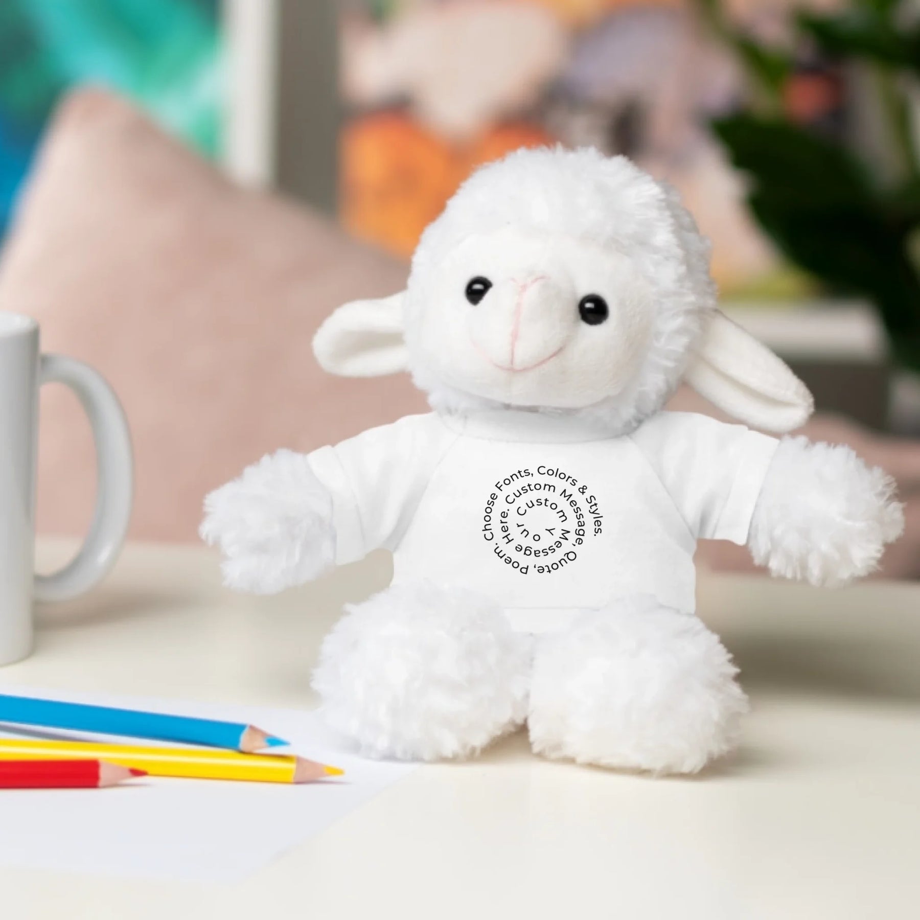 Each adorable stuffed animal features a soft t-shirt ready for your custom design. Personalize it with names, dates, short quotes, logos, or even creative extras like scrabble letter layouts, QR codes, Spotify song links, or photo prints. Choose from various font styles, text colors, and t-shirt shades to perfectly match your theme, mood, or occasion.