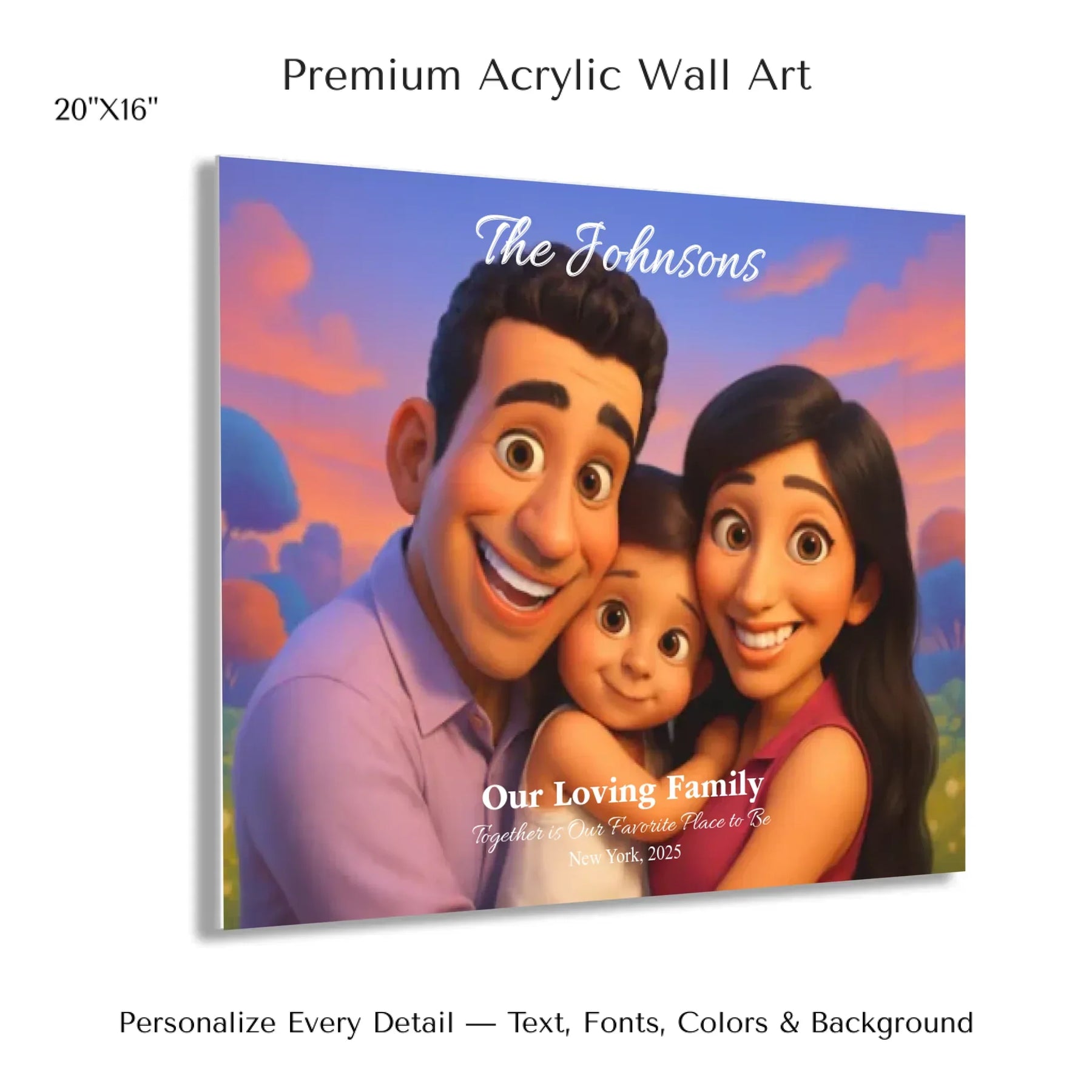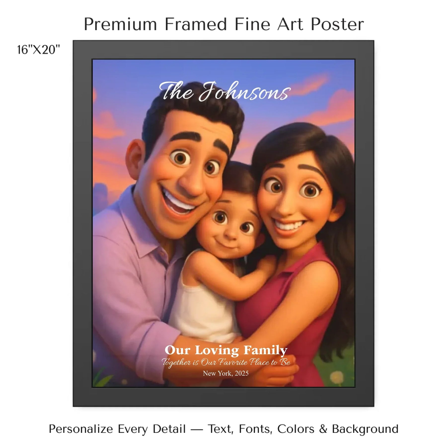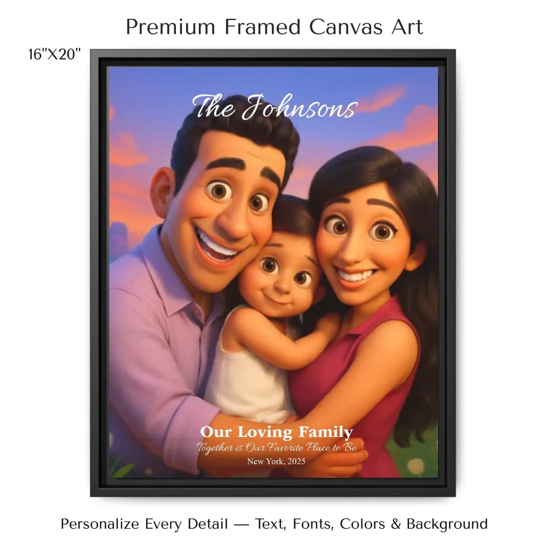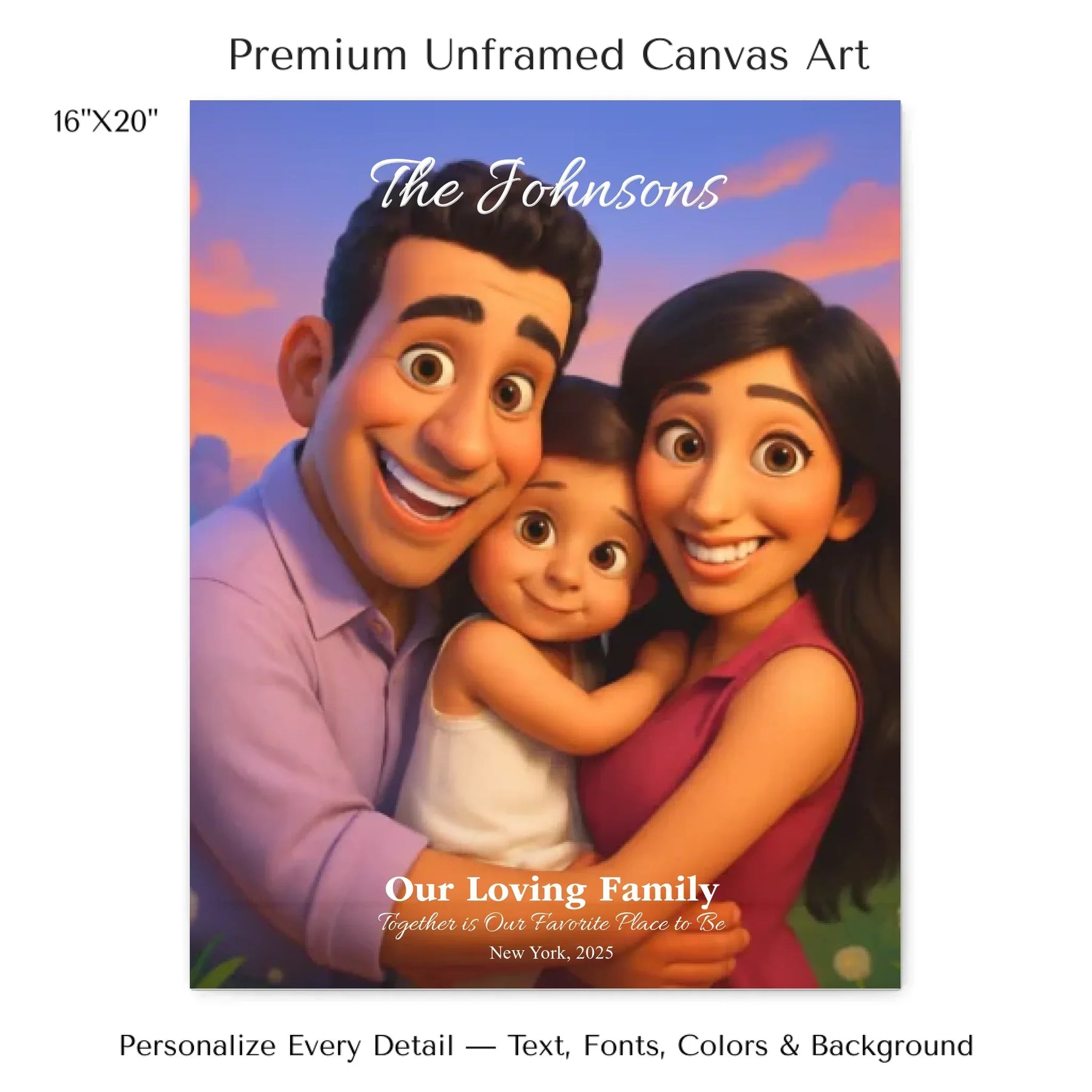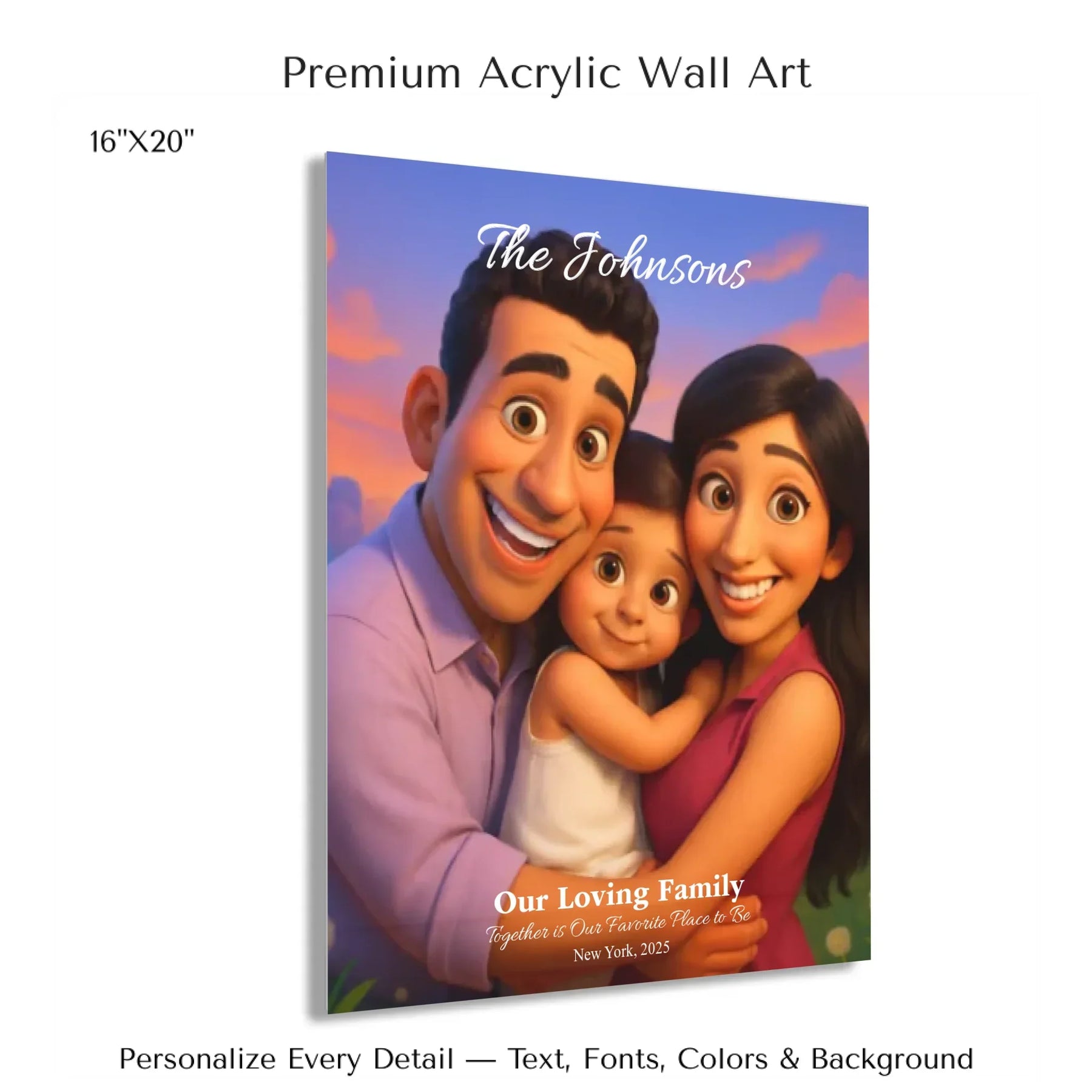 Personalizing your artwork is easy. Upload your photo, and it instantly converts into a 3D animated portrait. Adjust the photo for optimal placement. Add a title and up to three lines of custom text. Include names, dates, or a fun message. Every element makes your portrait uniquely yours.