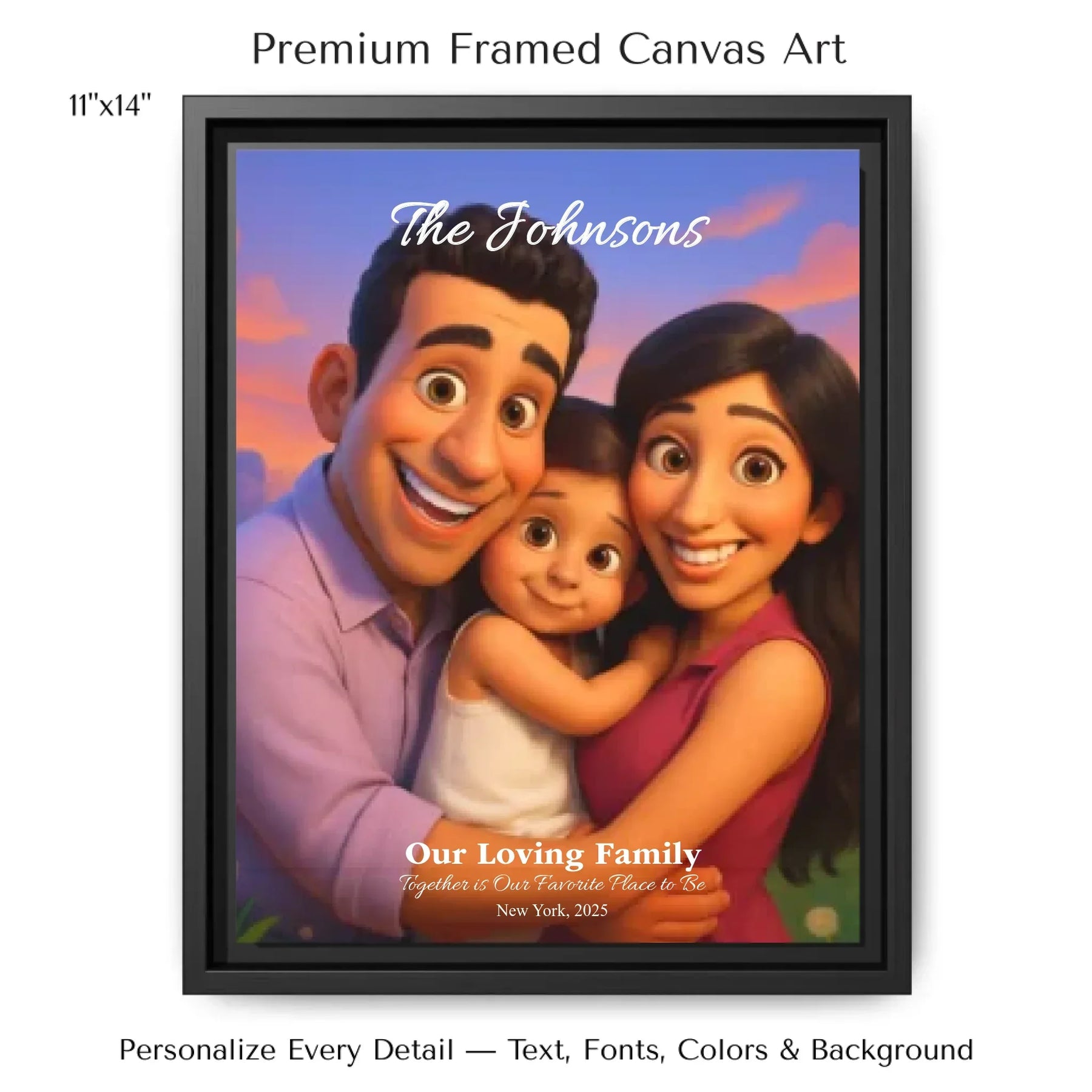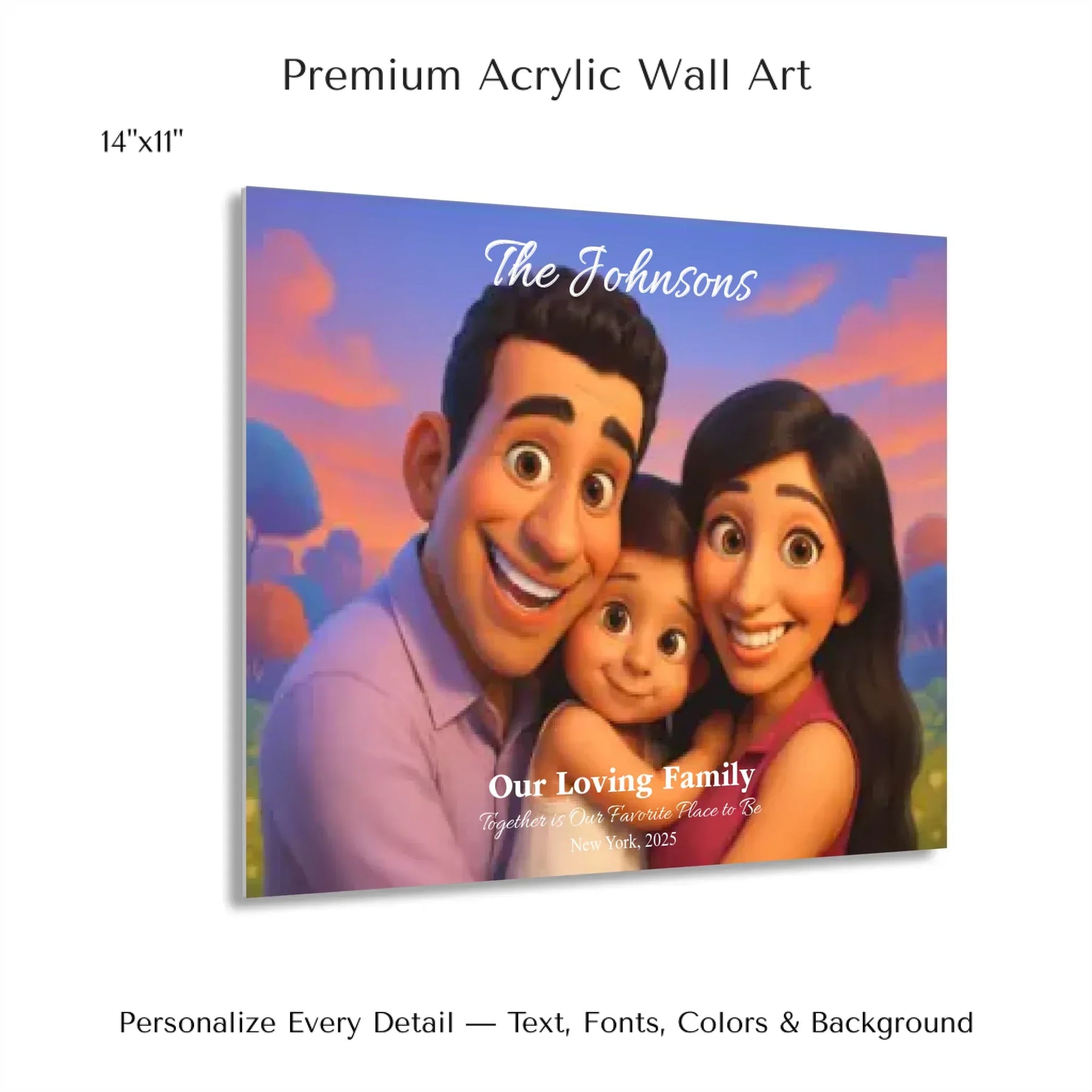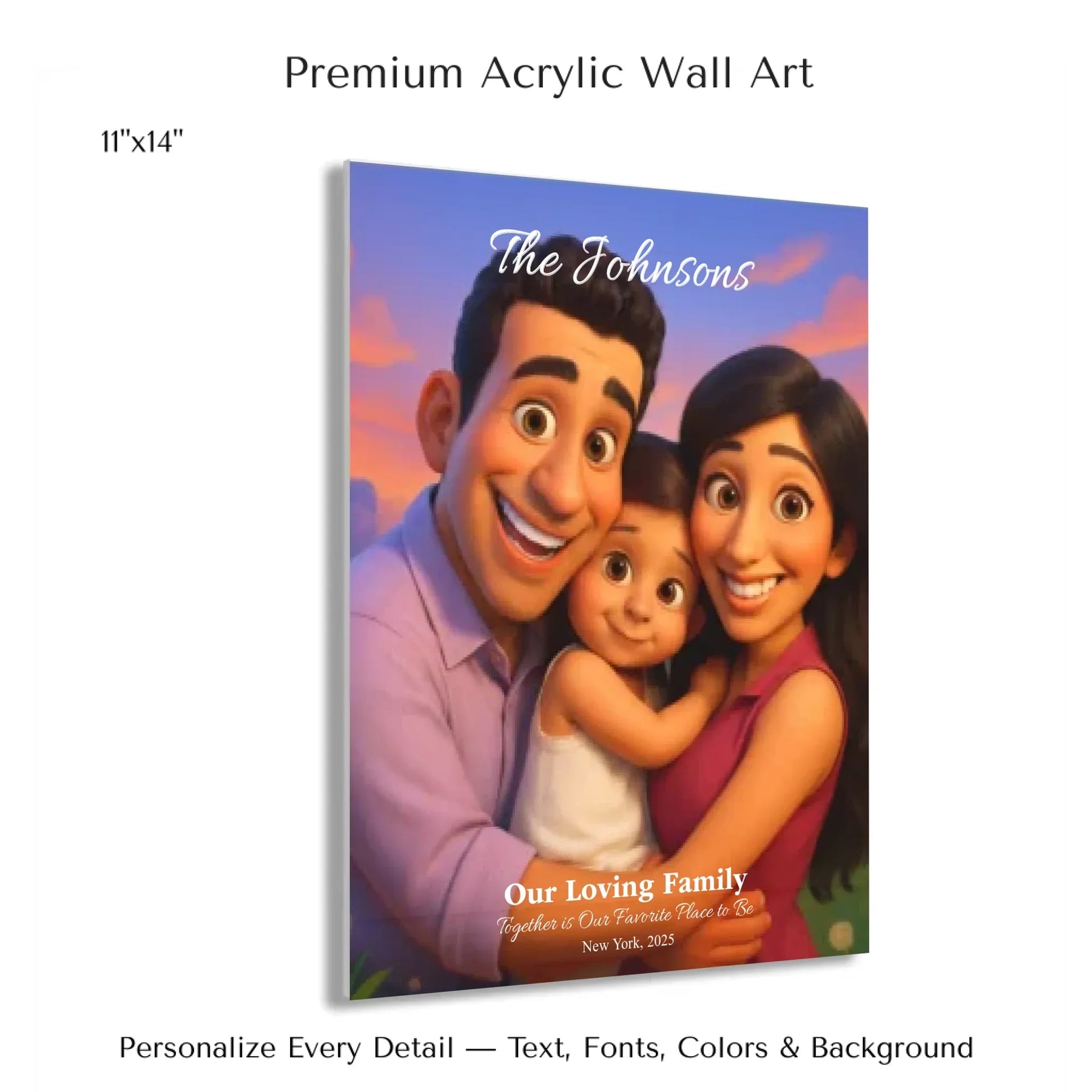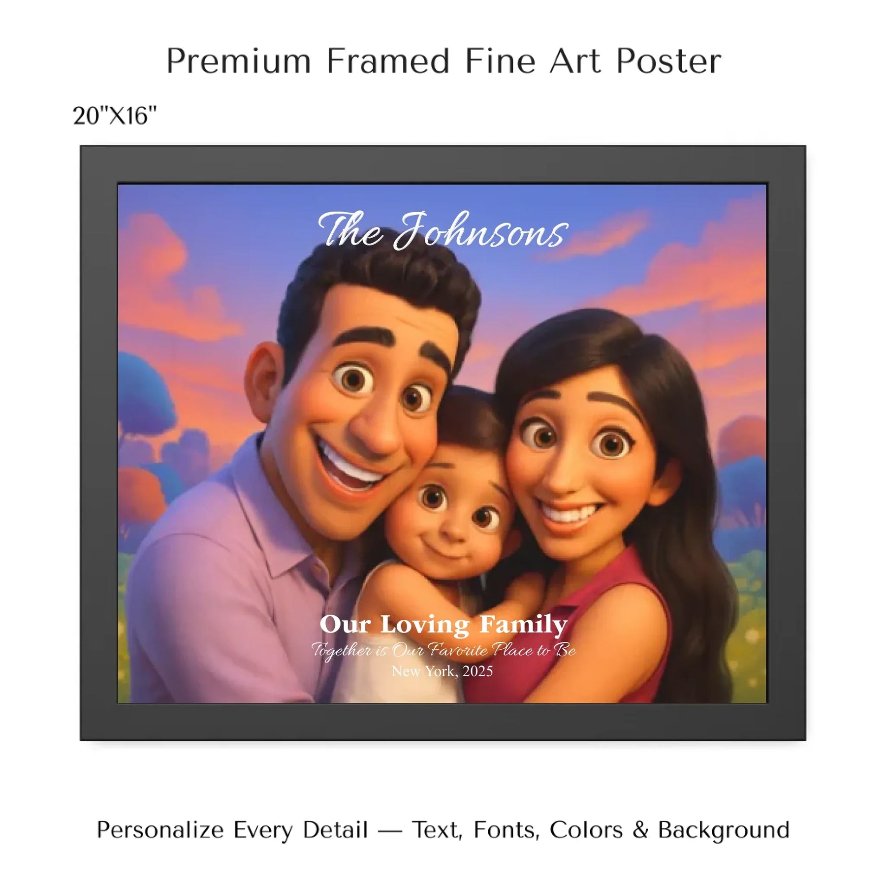 Personalizing your artwork is easy. Upload your photo, and it instantly converts into a 3D animated portrait. Adjust the photo for optimal placement. Add a title and up to three lines of custom text. Include names, dates, or a fun message. Every element makes your portrait uniquely yours.