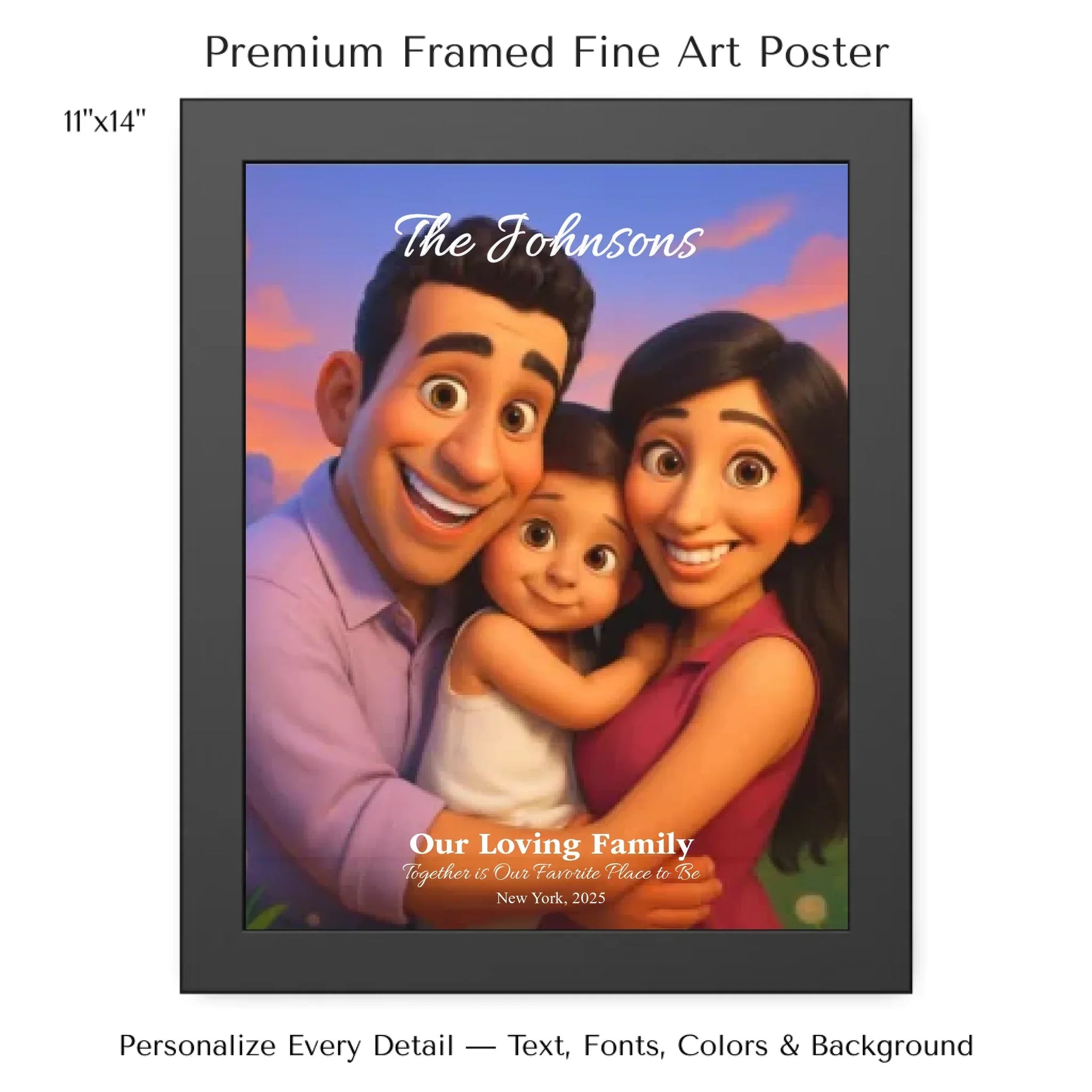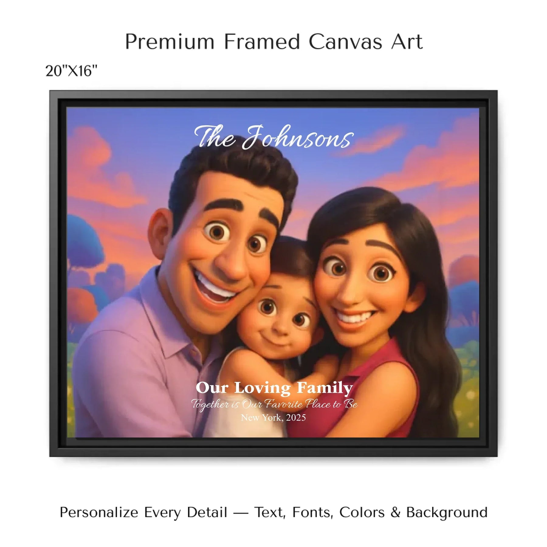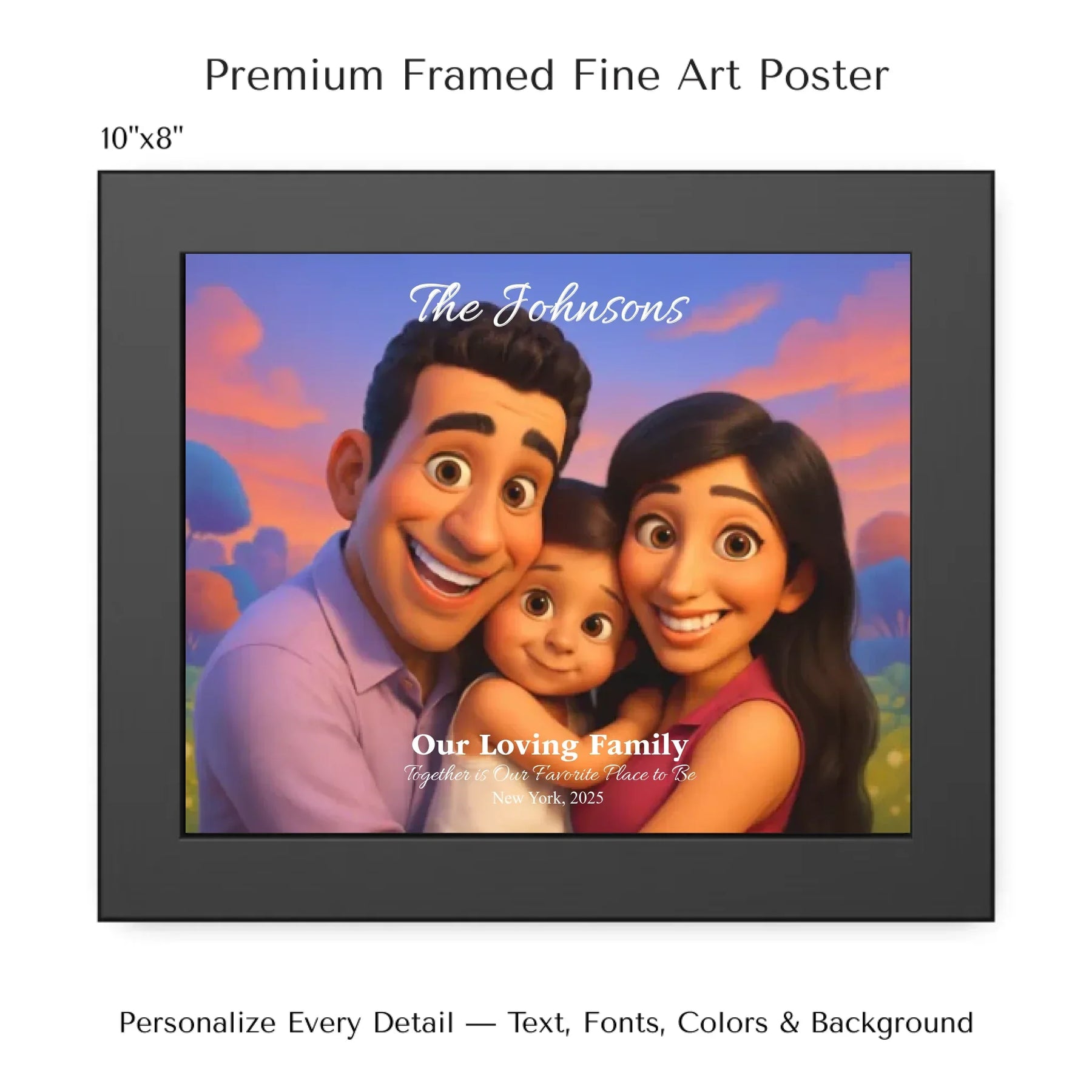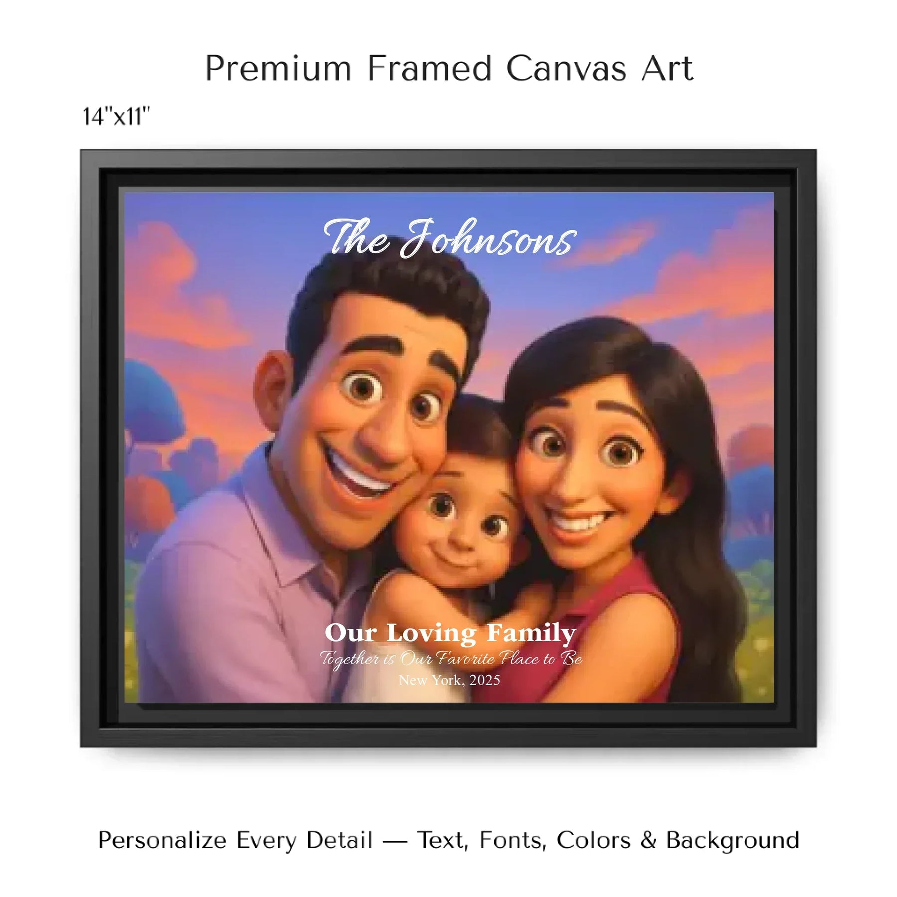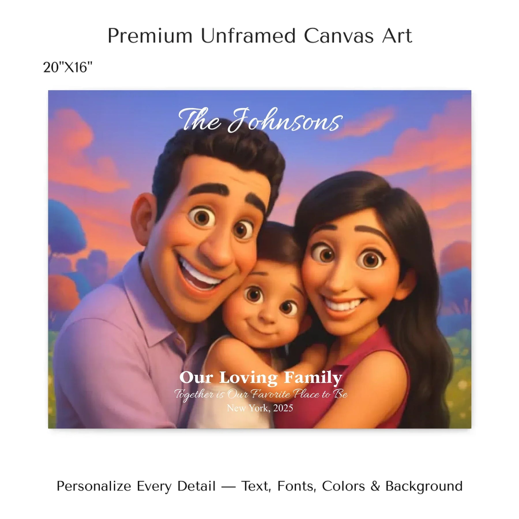 Personalizing your artwork is easy. Upload your photo, and it instantly converts into a 3D animated portrait. Adjust the photo for optimal placement. Add a title and up to three lines of custom text. Include names, dates, or a fun message. Every element makes your portrait uniquely yours.
