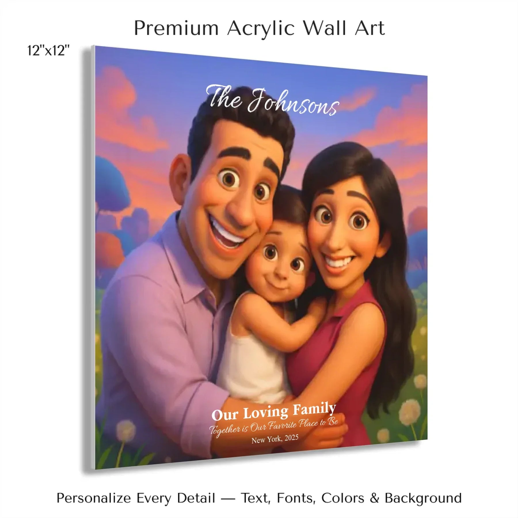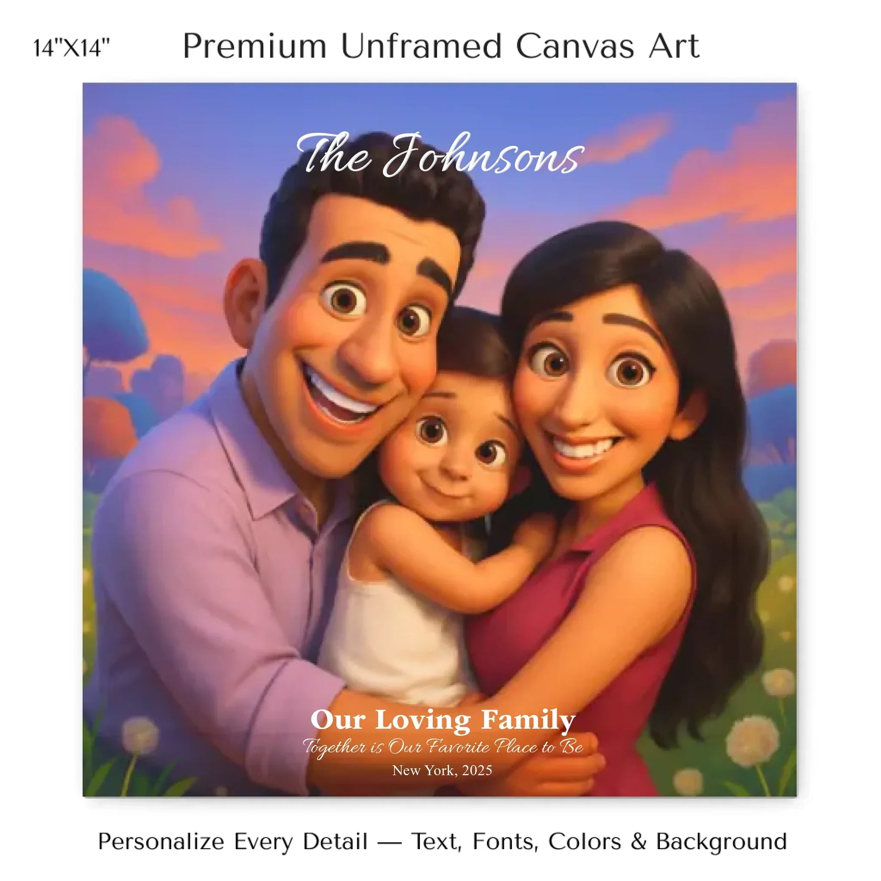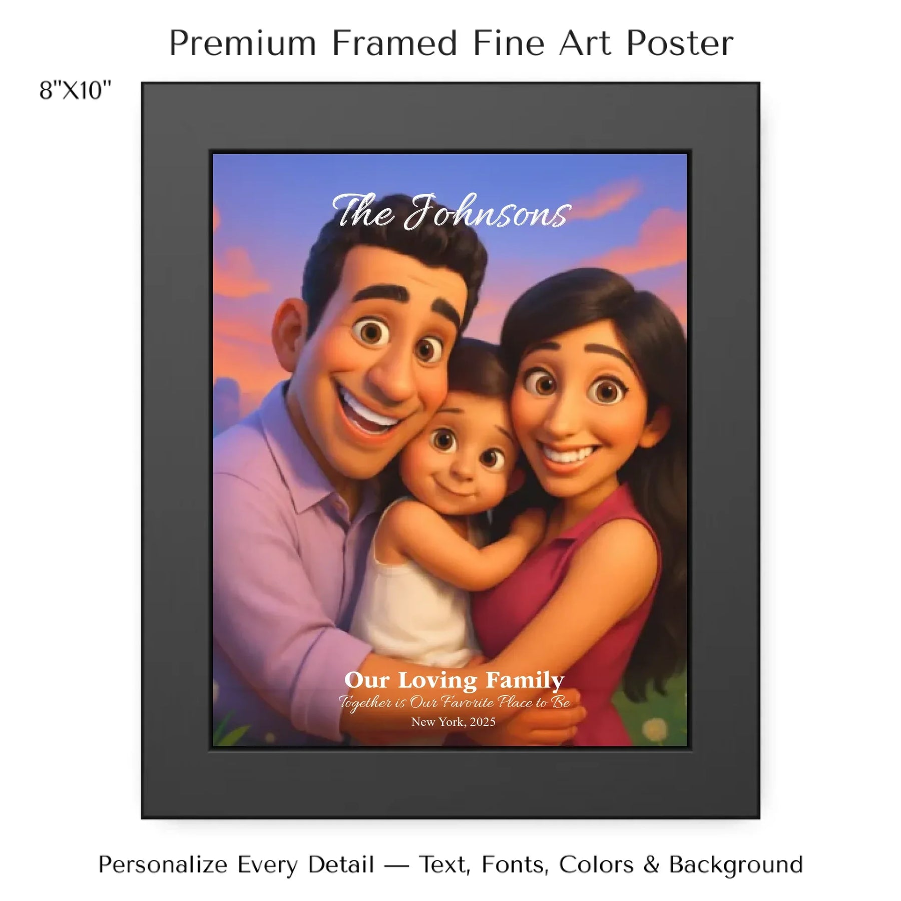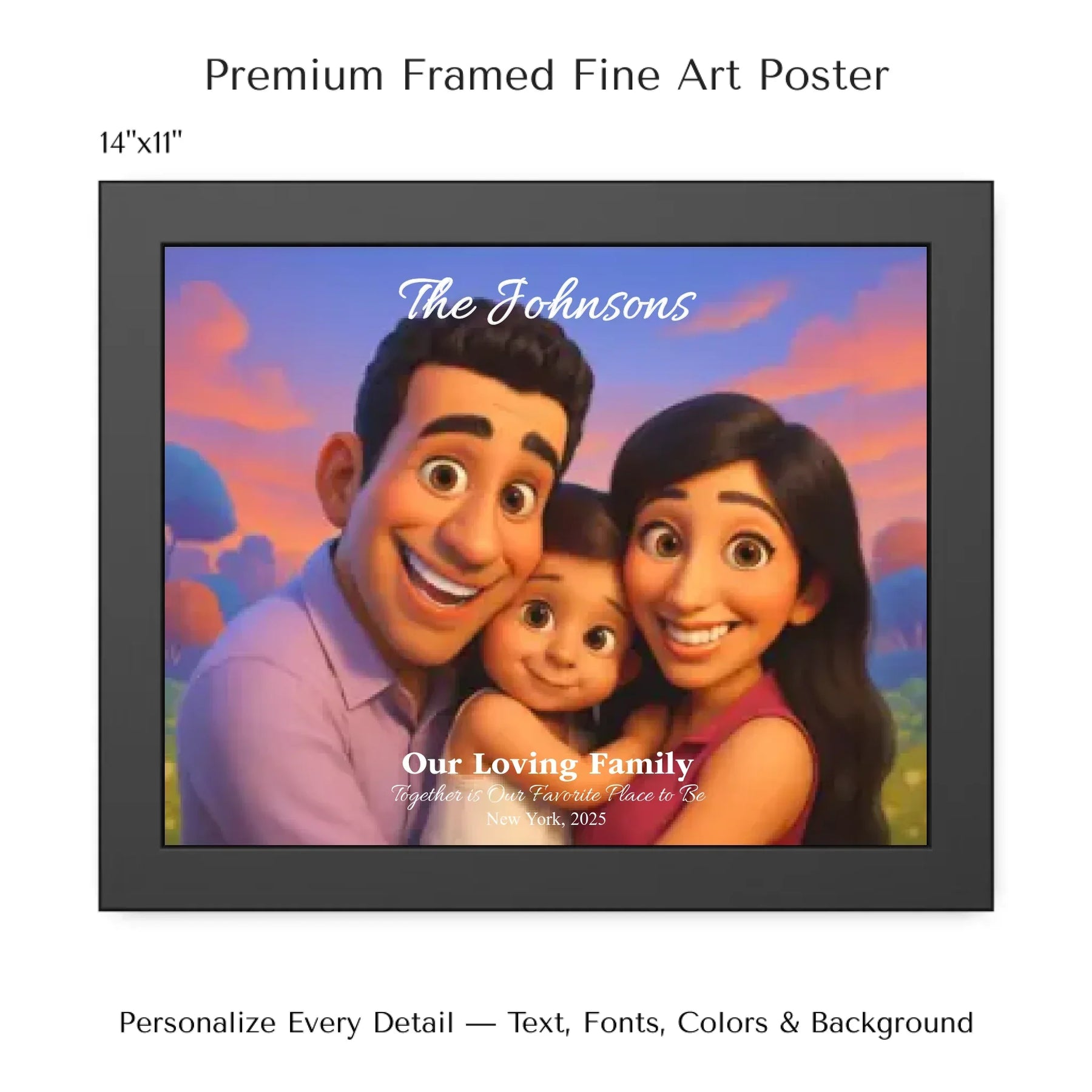 Personalizing your artwork is easy. Upload your photo, and it instantly converts into a 3D animated portrait. Adjust the photo for optimal placement. Add a title and up to three lines of custom text. Include names, dates, or a fun message. Every element makes your portrait uniquely yours.
