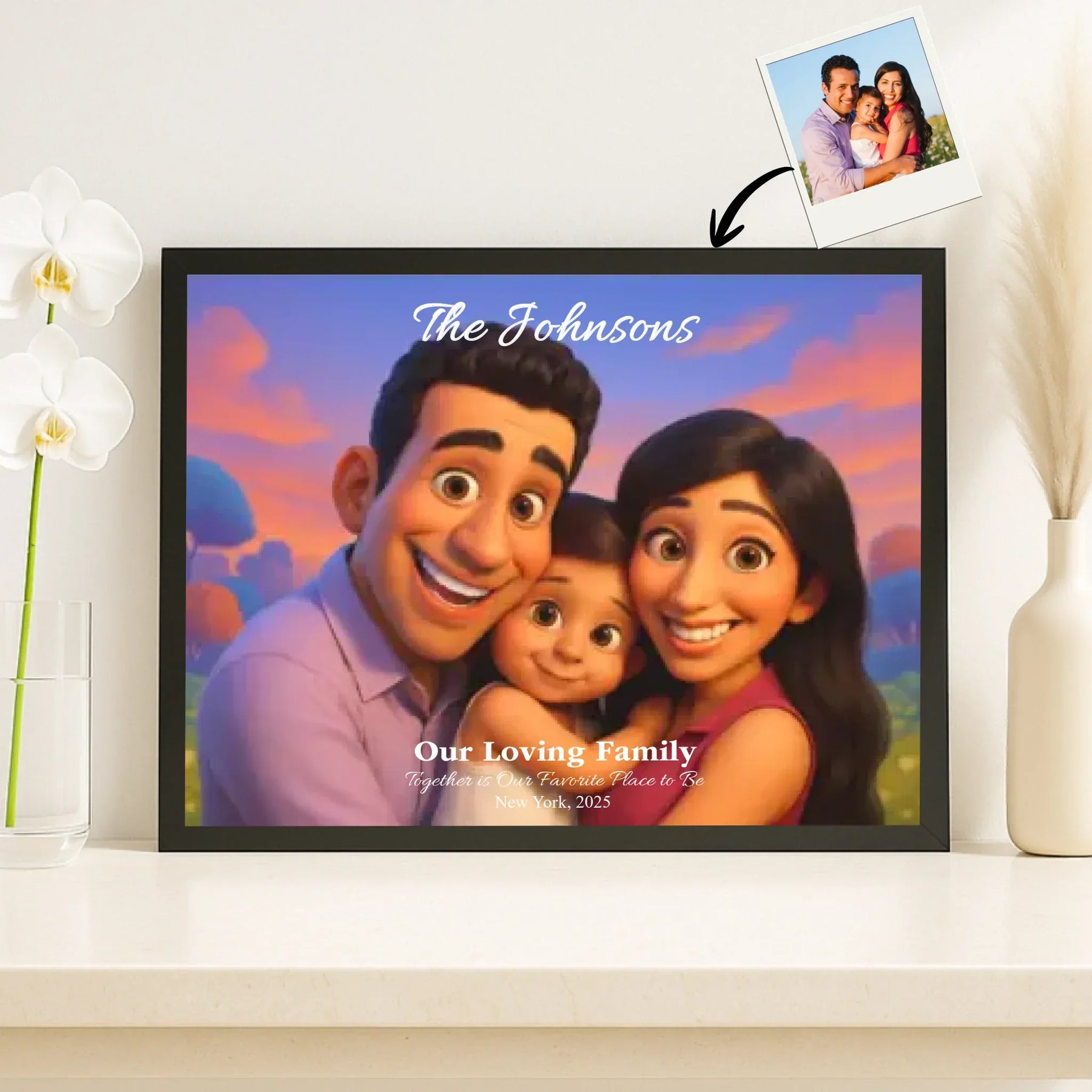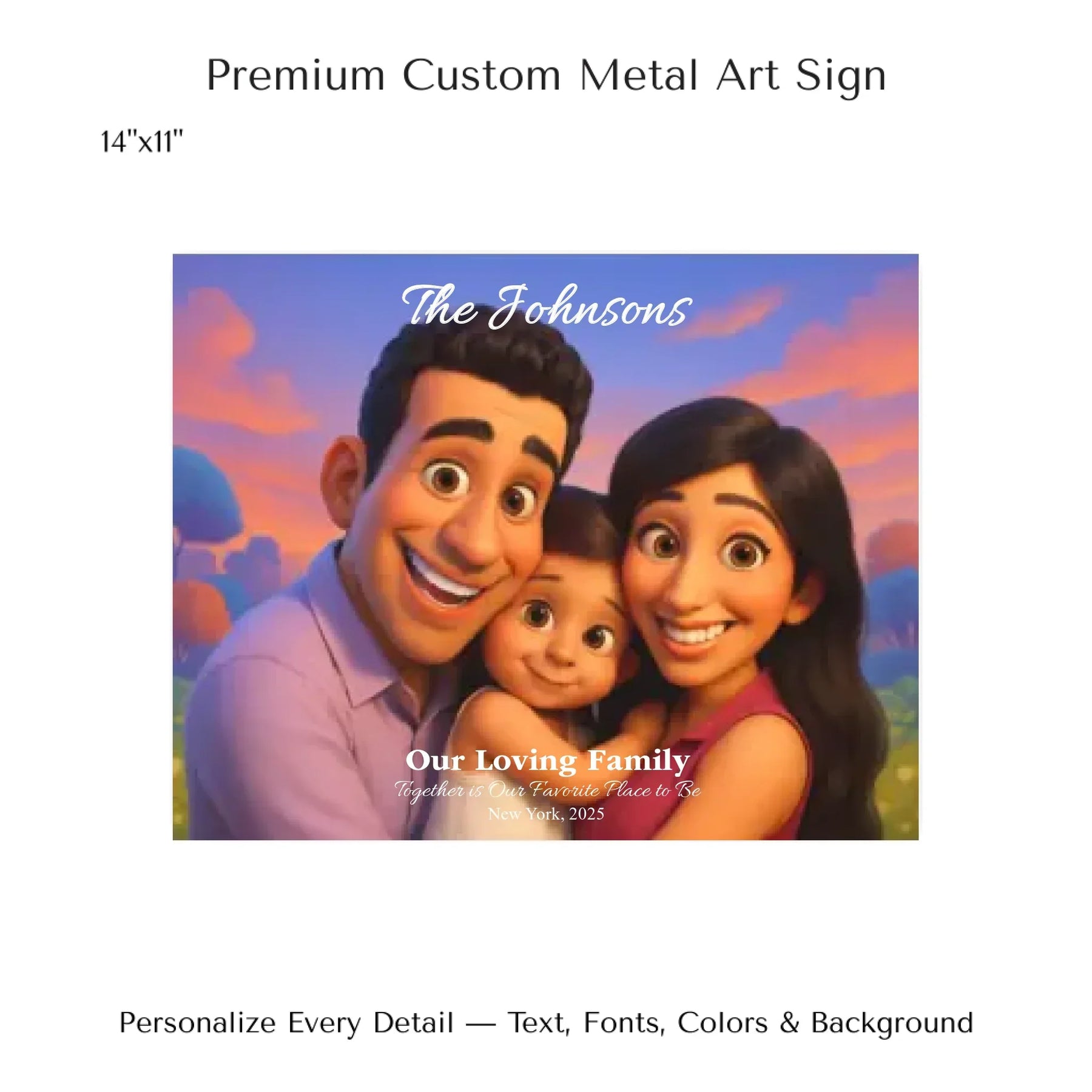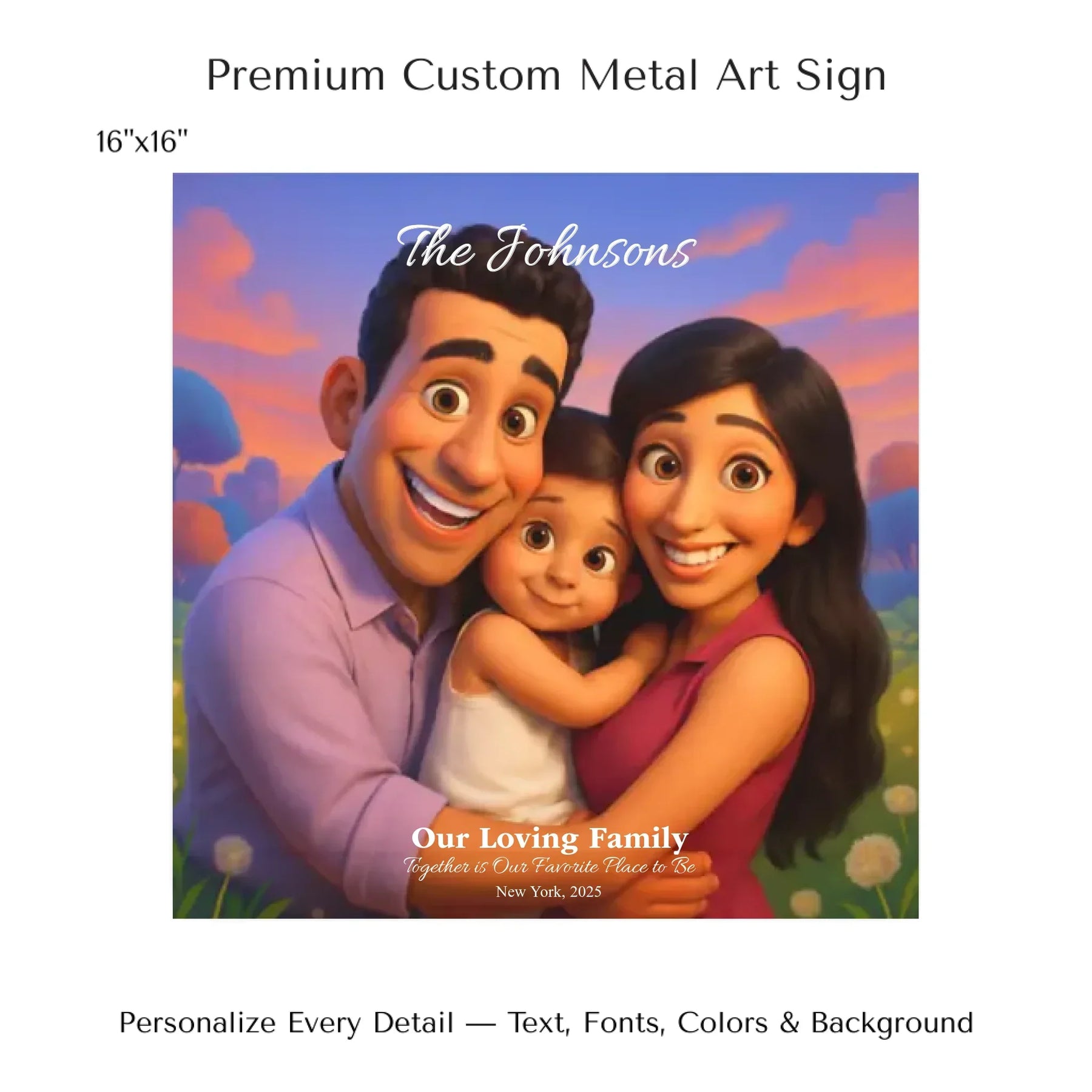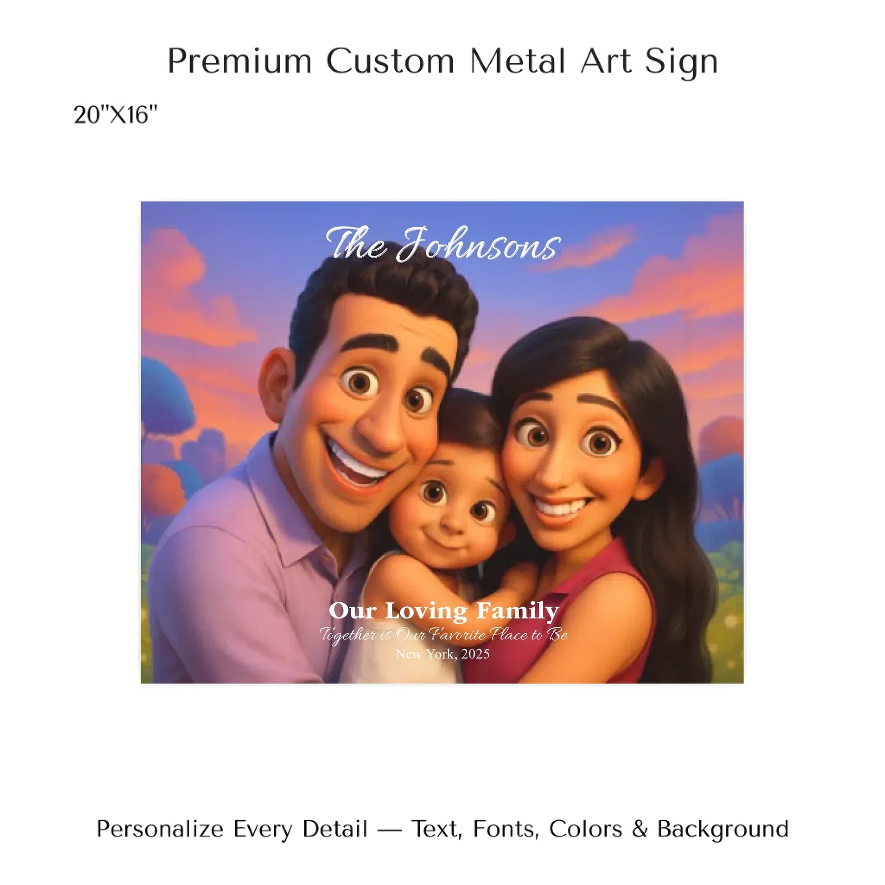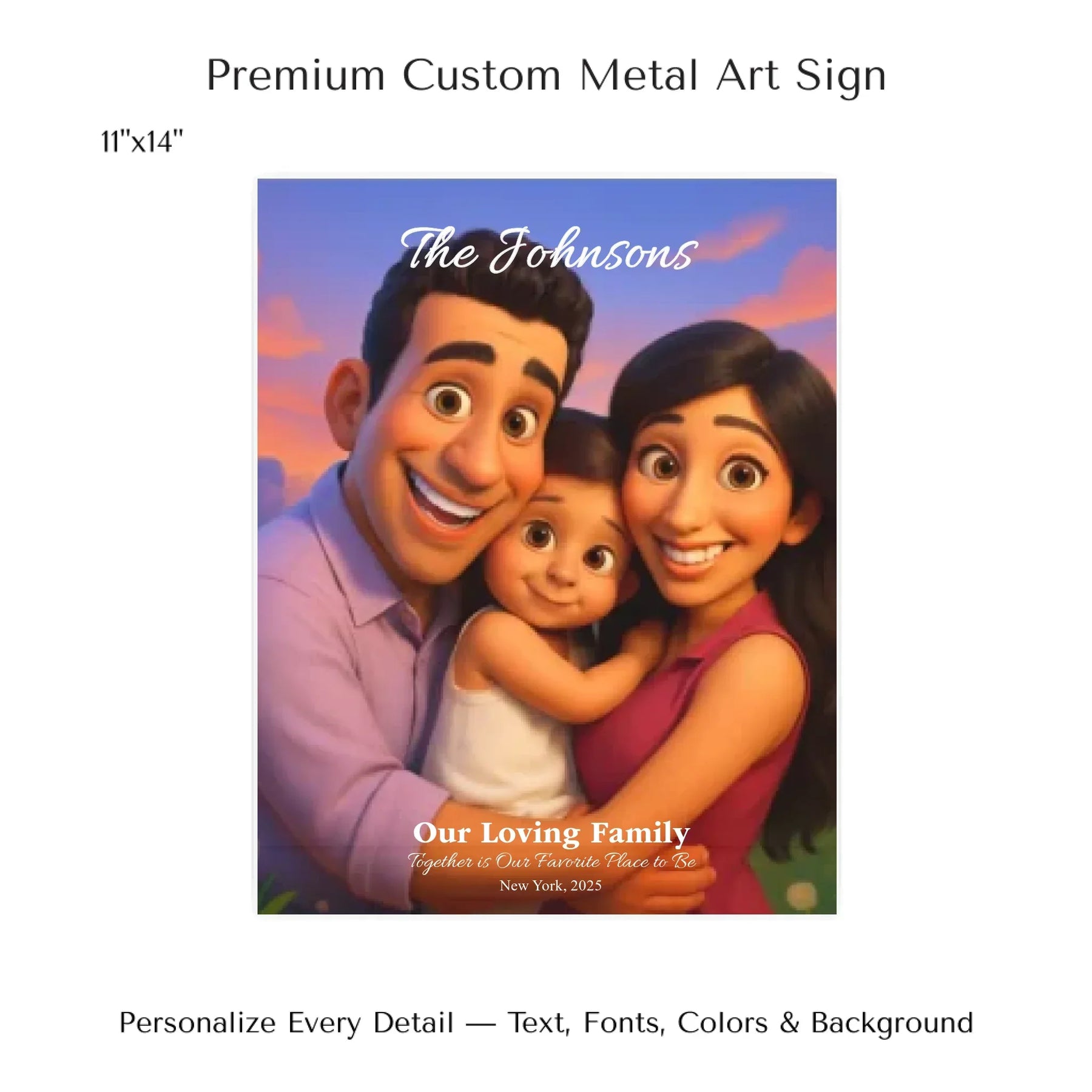 Personalizing your artwork is easy. Upload your photo, and it instantly converts into a 3D animated portrait. Adjust the photo for optimal placement. Add a title and up to three lines of custom text. Include names, dates, or a fun message. Every element makes your portrait uniquely yours.